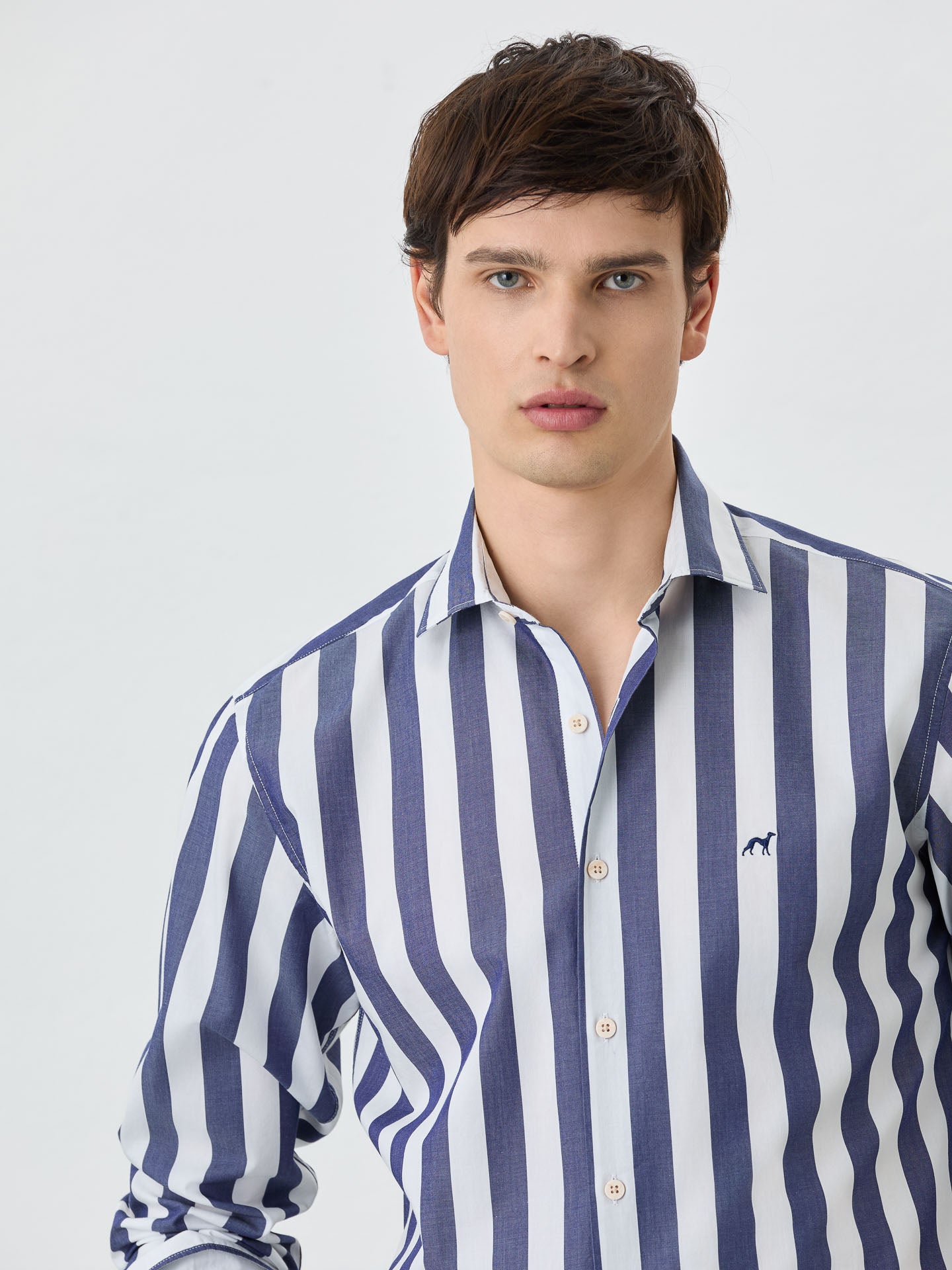 Slim Fit Shirt With Open Collar In BCI Cotton With Stripes