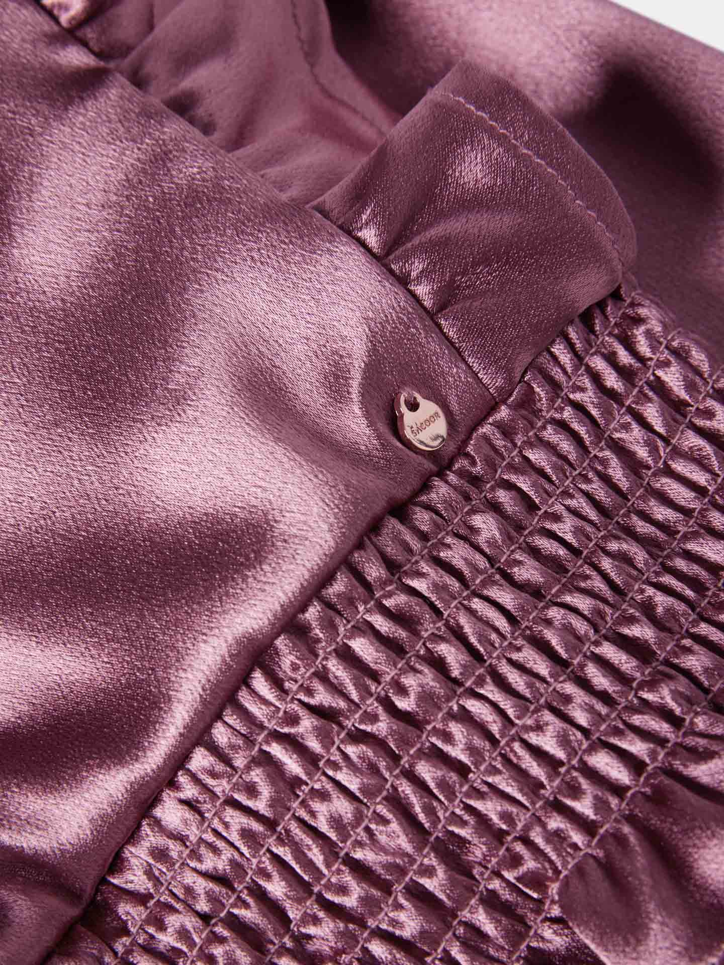 Blouse made of shiny light weight fabric for maximum comfort and the perfect look. Featuring smock embroidery at waistband for an adjustable fit, ballon sleeves, opening with zipper at center front with protection on the neckline, frill collar and frills on the shoulders. Rich details such as Sacoor personalized rose gold plate. Special note: You can find a matching scrunchie in out collection.