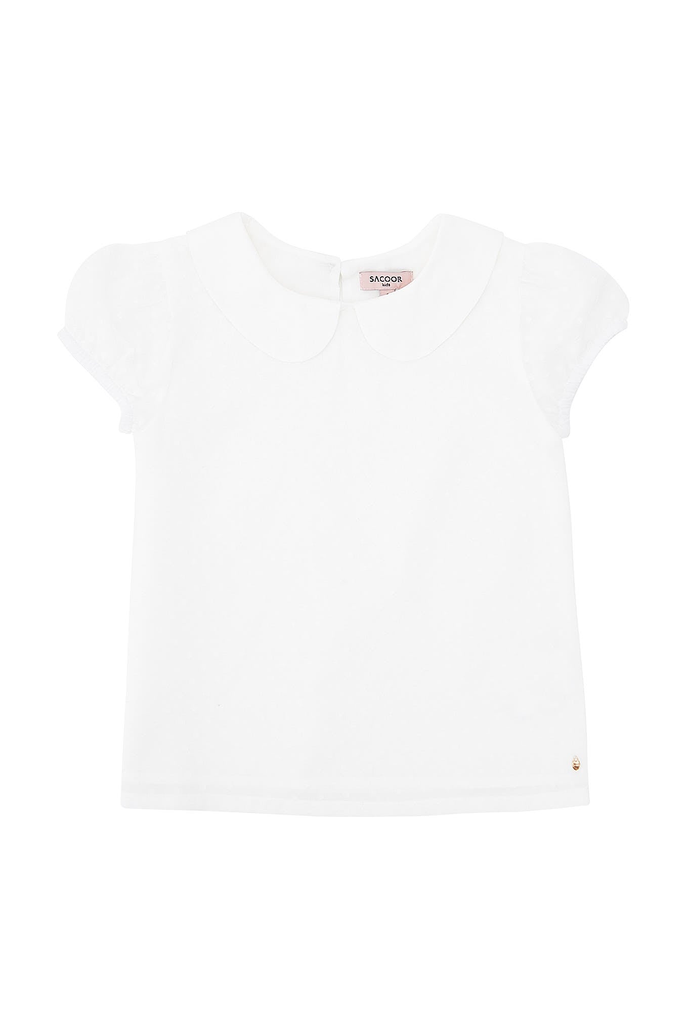 Girl's blouse in flowing fabric with embossed dots pattern. Round collar and short sleeve with shoulder pleats and elastic. Button fastening at back. Rose gold custom hem metal disk detail. Loose cut, fully lined. Ideal for more formal occasions. With the prestige of being made in Portugal.