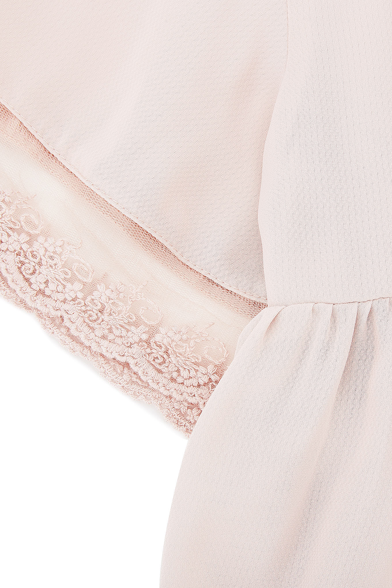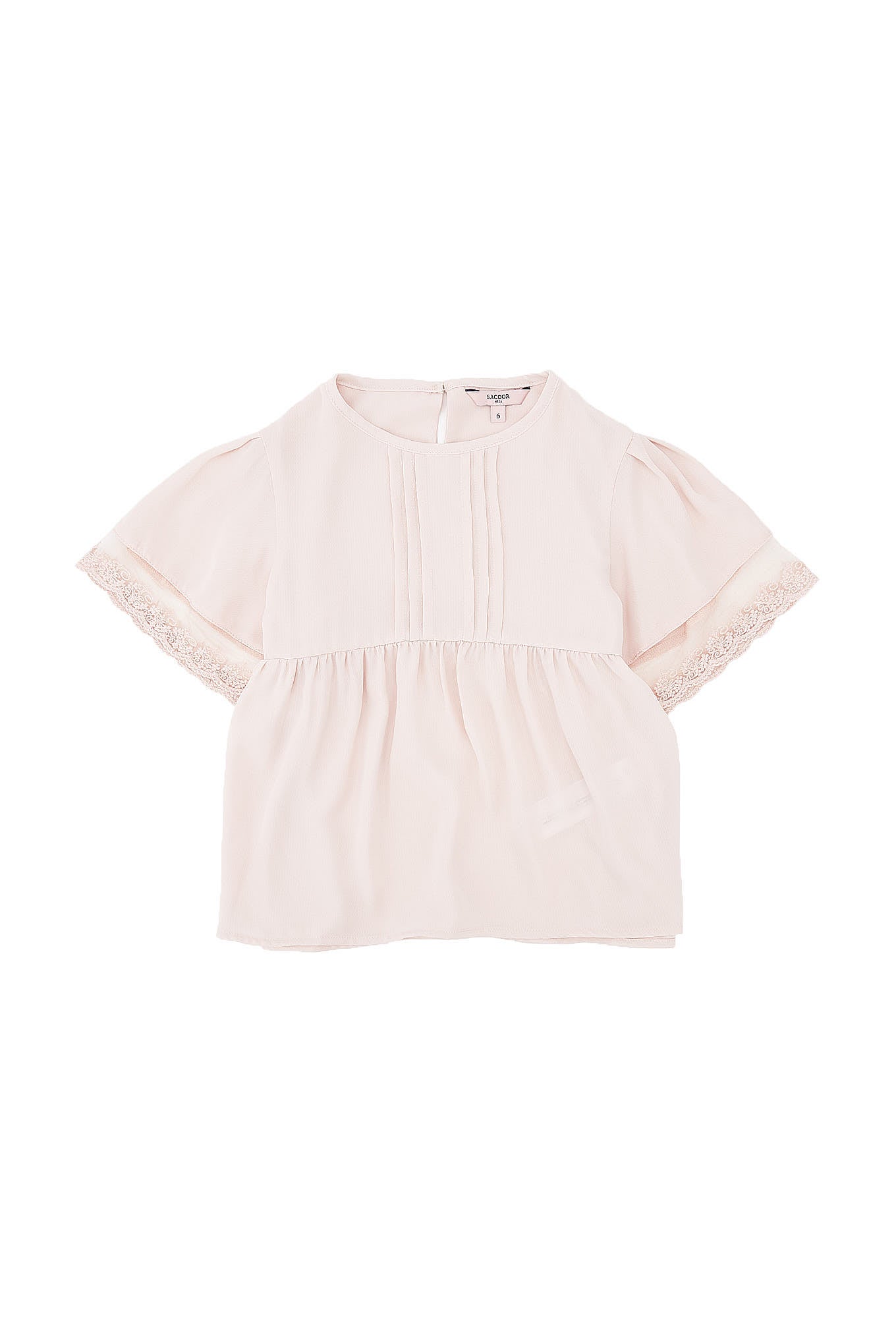 Girl's blouse in very stylish, plain, flowing fabric. Round collar and short sleeves finished in tulle and lace. Button fastening at back. Pleated front, culminating in a looser cut with pleated effect. Half lining. With the prestige of being made in Portugal.