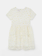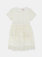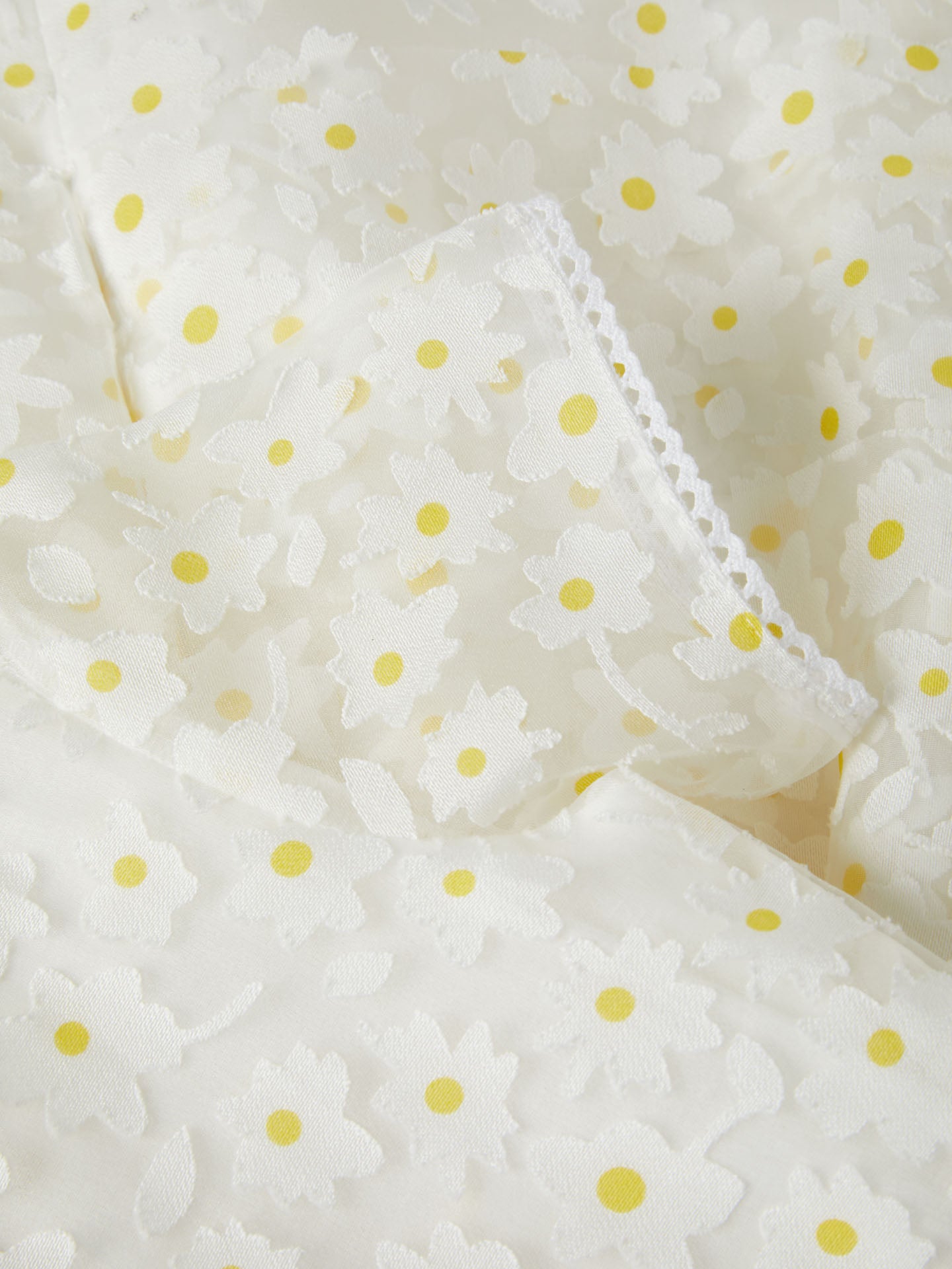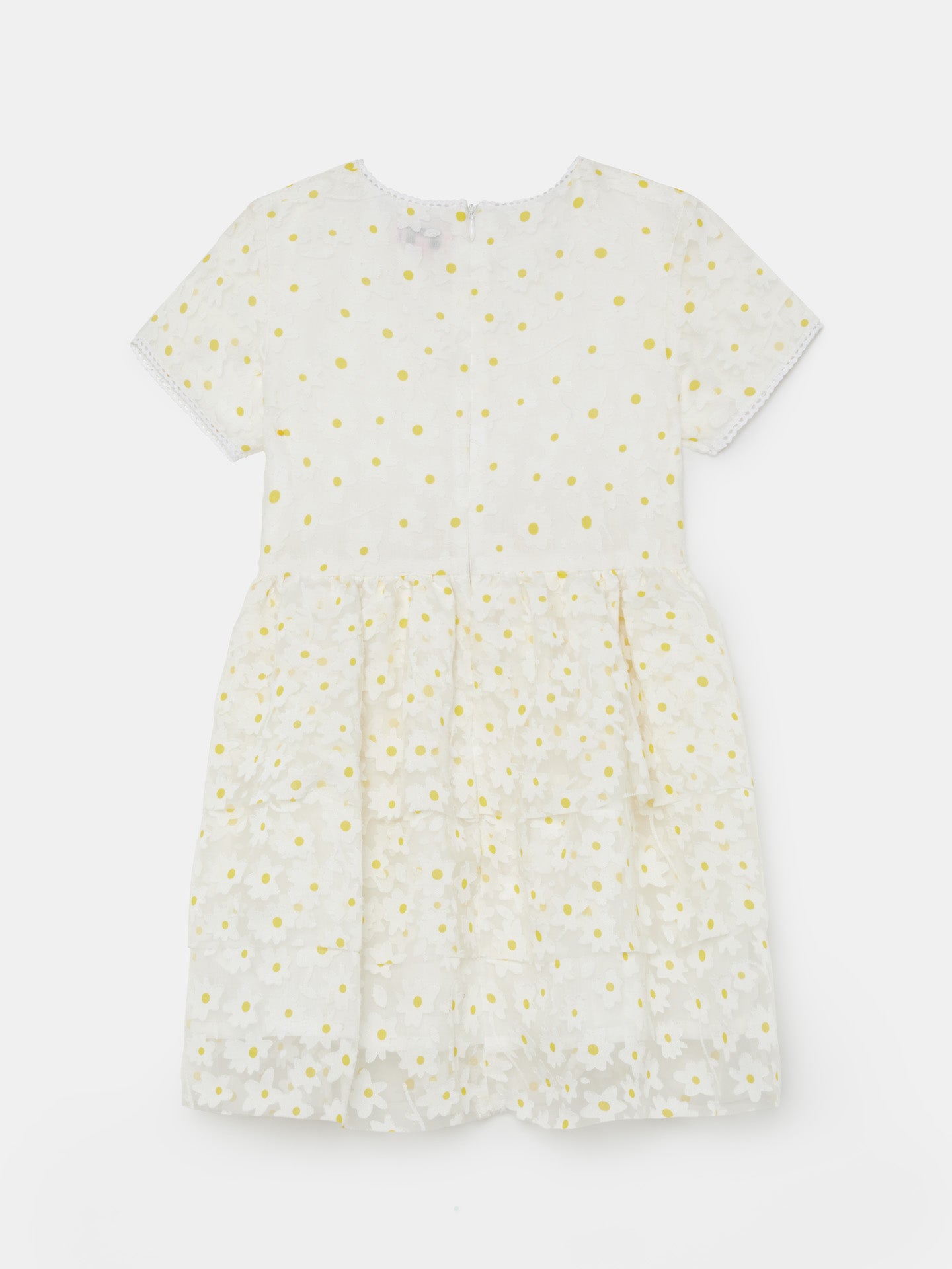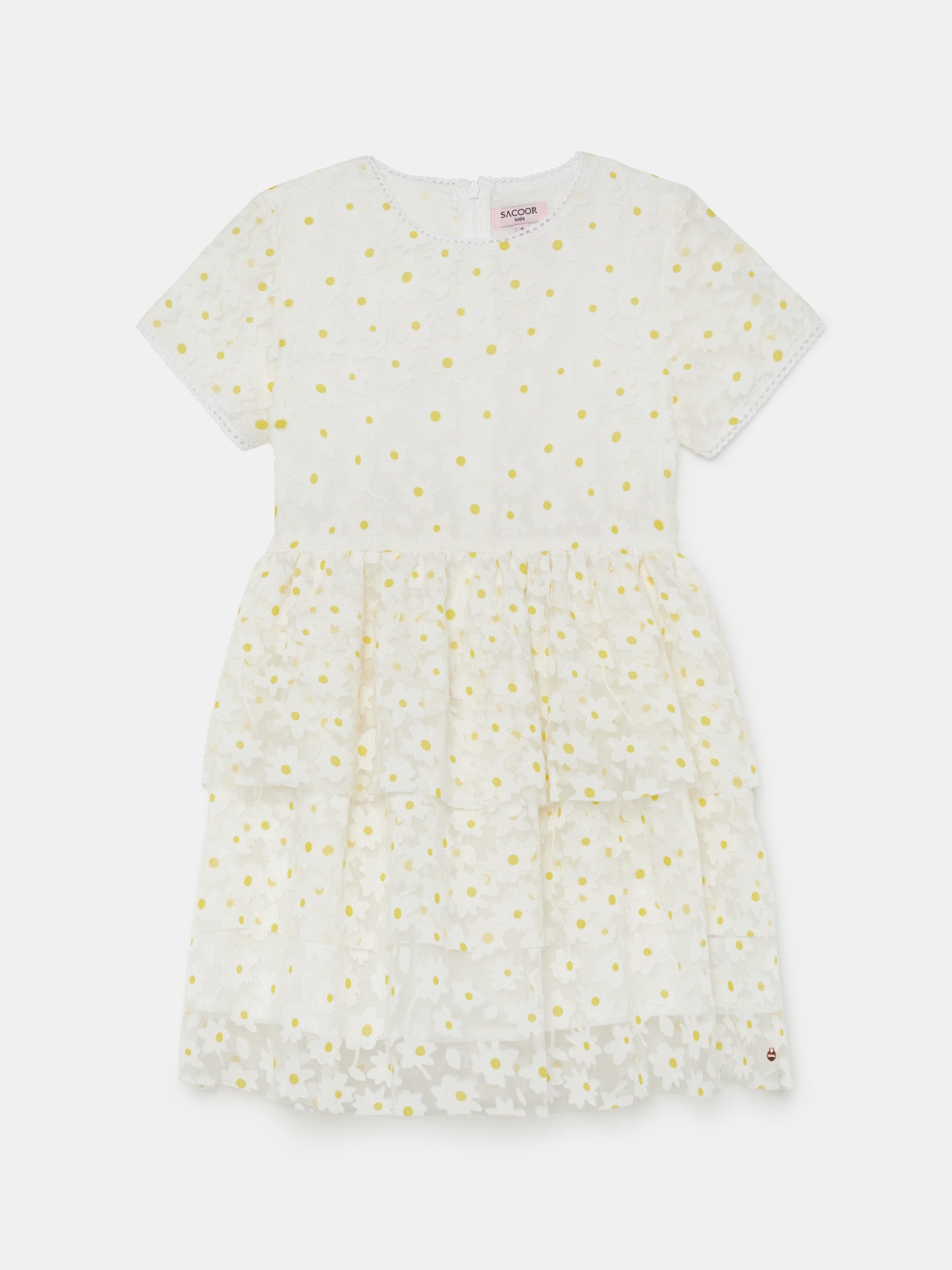 Short sleeve dress made of Flowers tule fabric. Featuring short sleeves, round neackline and center back opening with invisible zipper. Rich details such as decorative tape and Sacoor personalized rose gold plate.