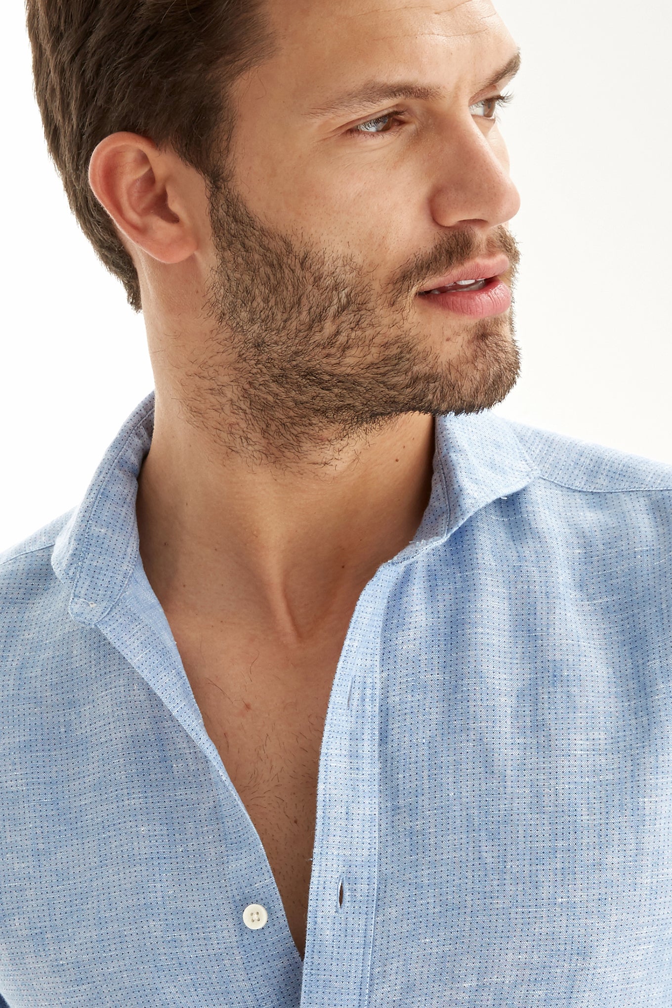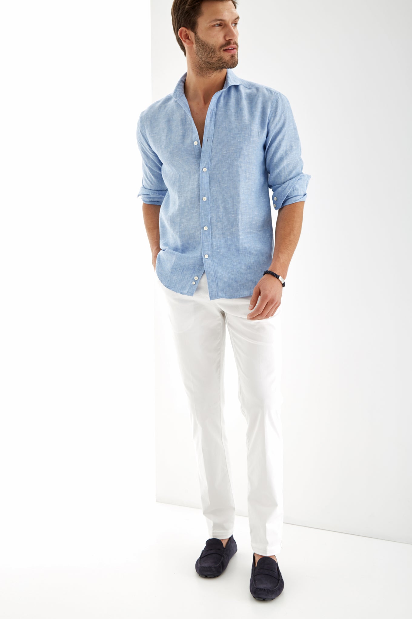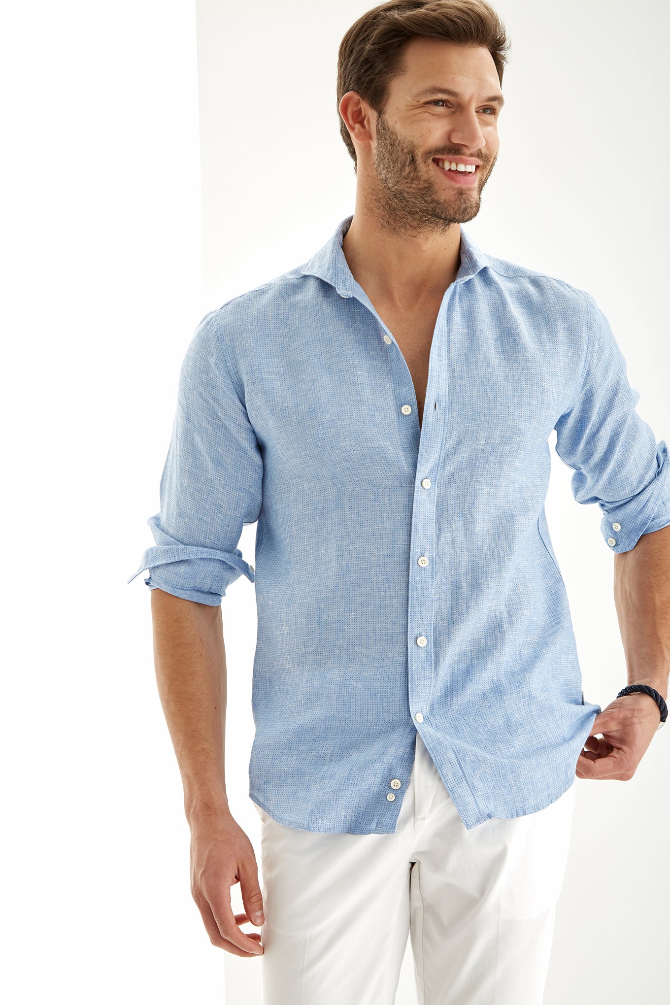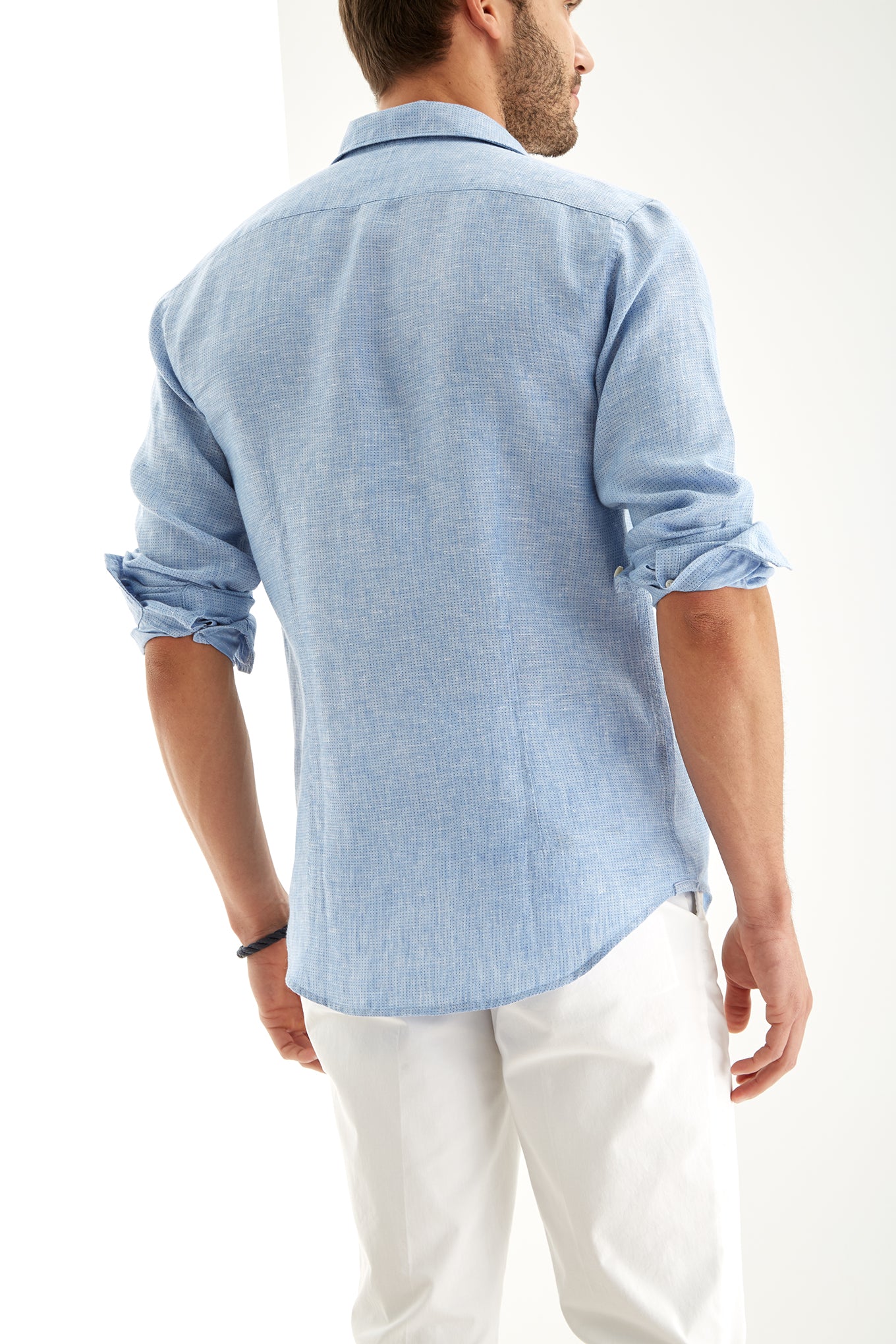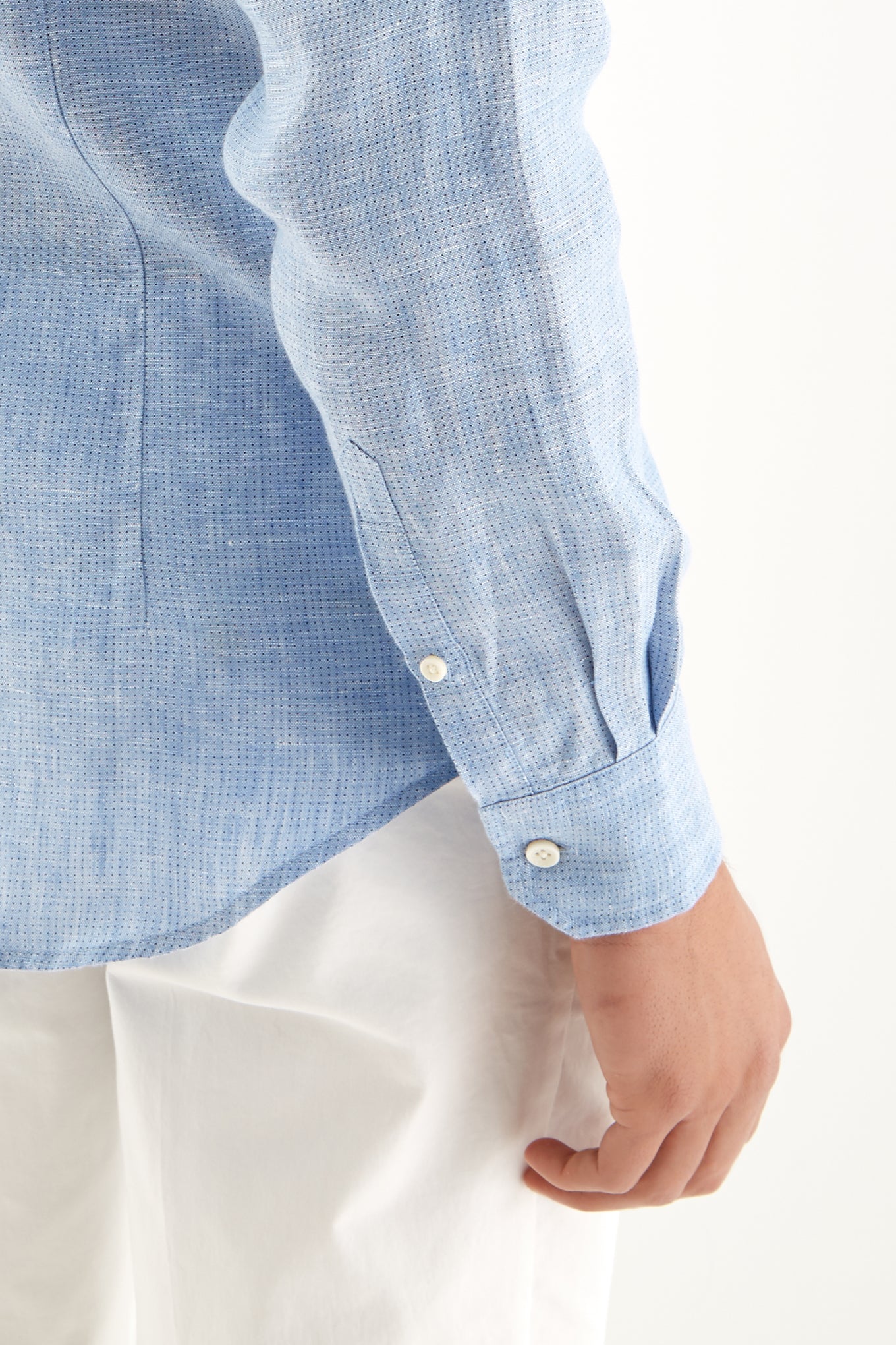 Men's micro print polka dot slim fit sports shirt. Features collar with stays and long sleeves with cuff buttons. Made of 100% linen. Available at Sacoor Brothers' online store.