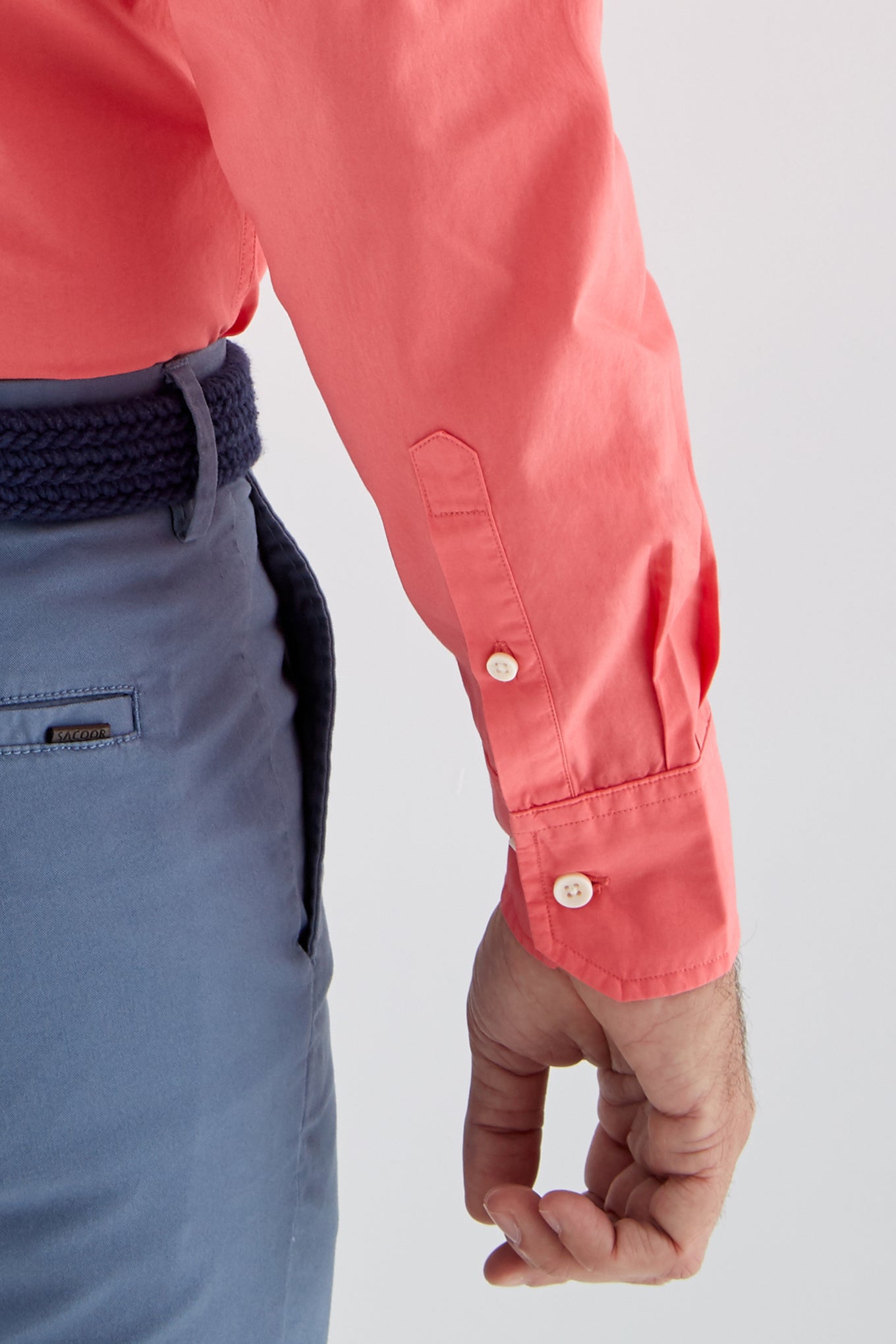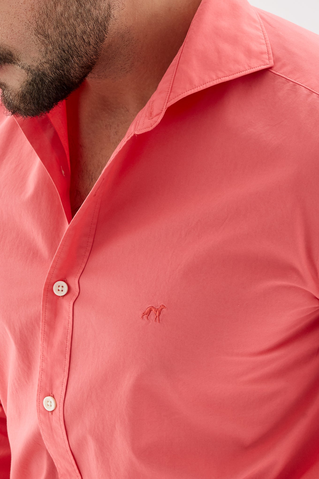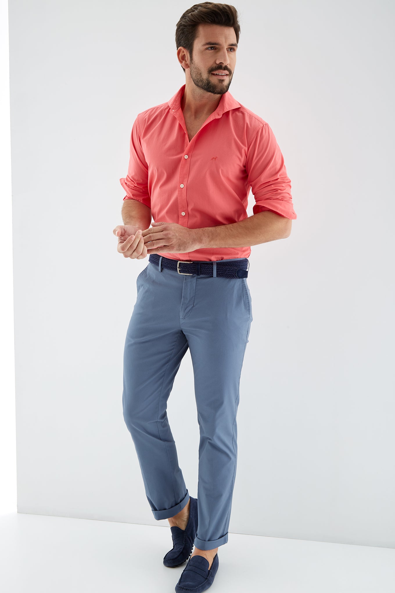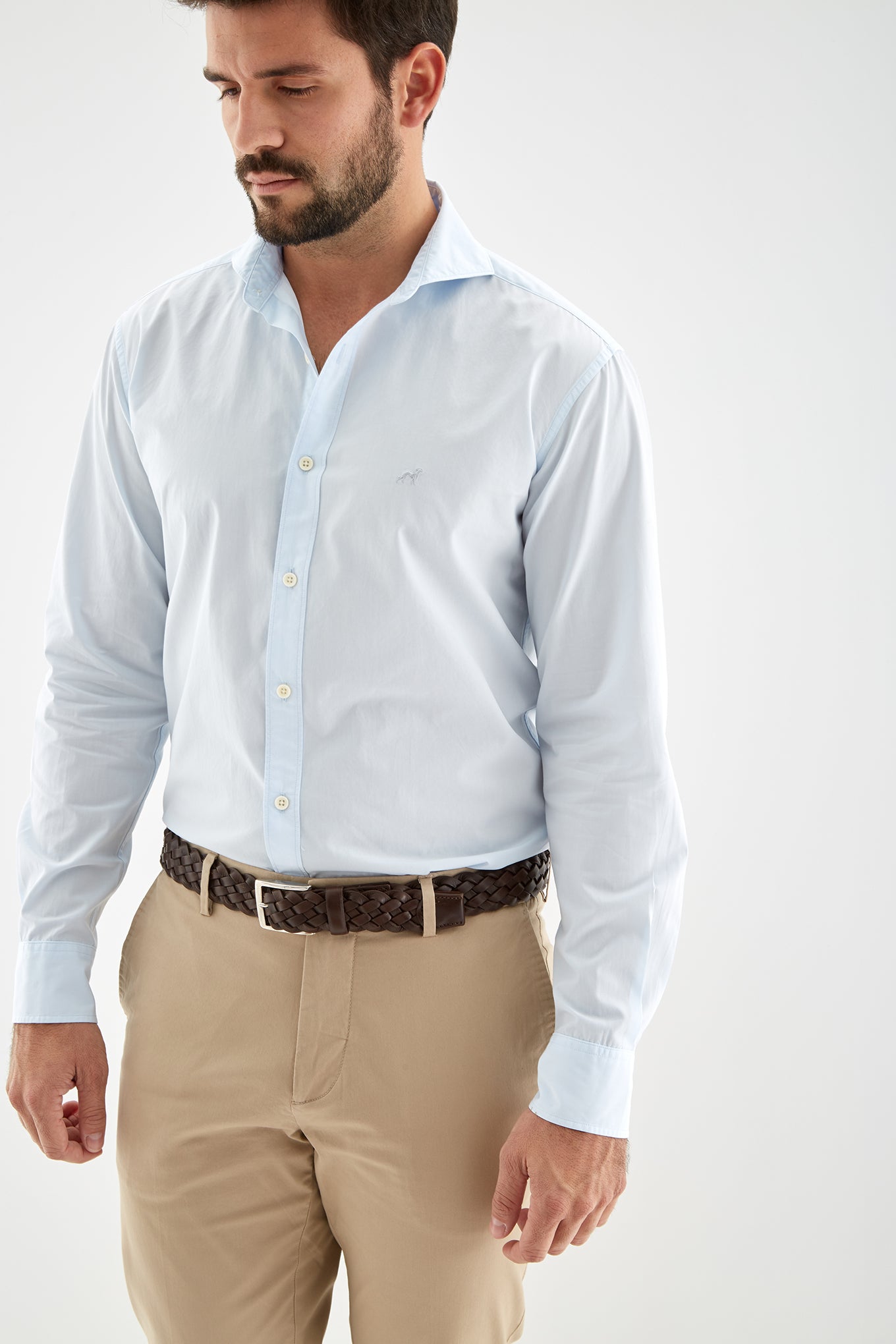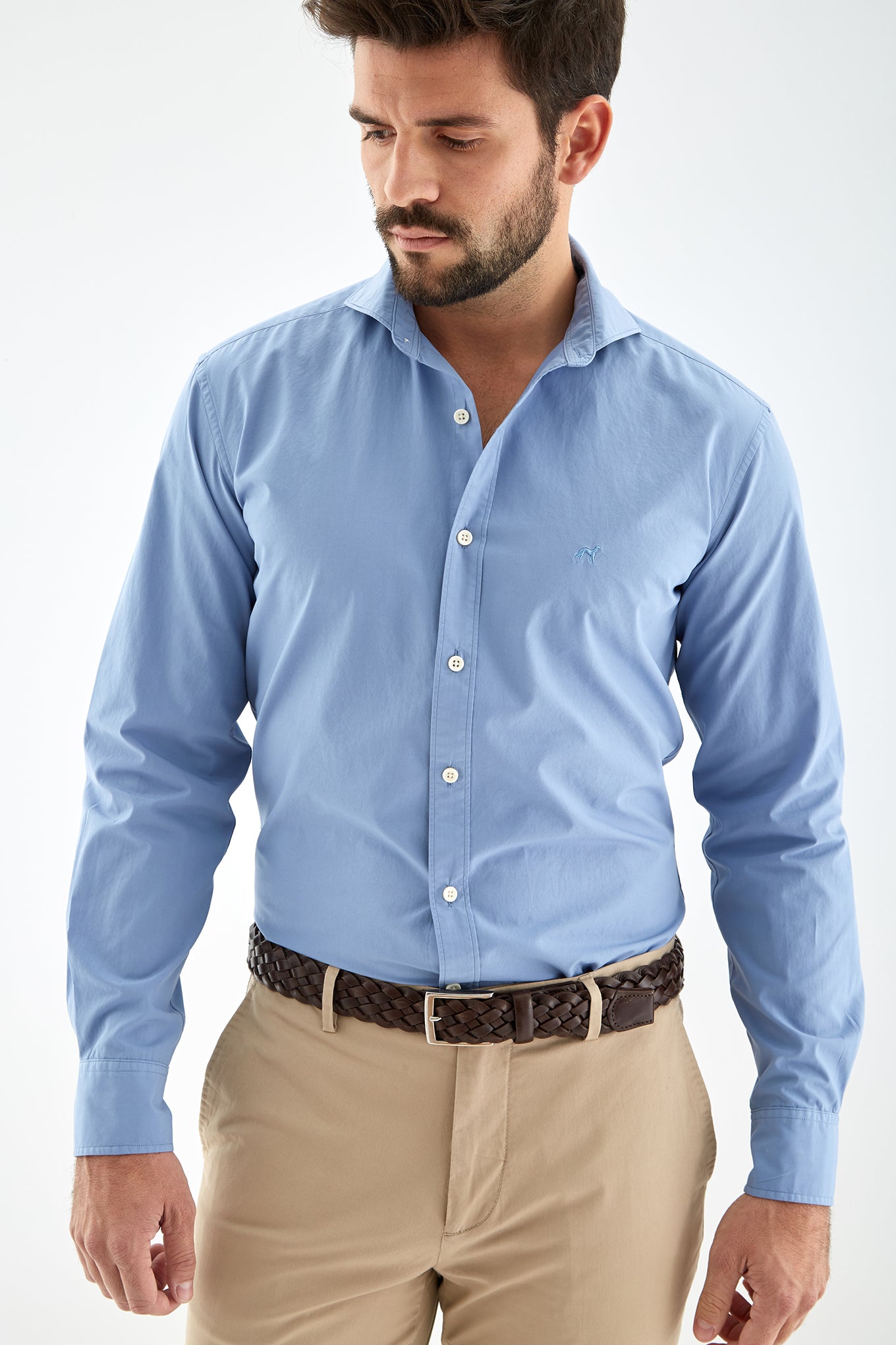 Men's plain slim fit sports shirt. Logo detail embroidered on the chest. 100% cotton long sleeve shirt, with cuff buttons and collar with stays. Available at Sacoor Brothers' online store.