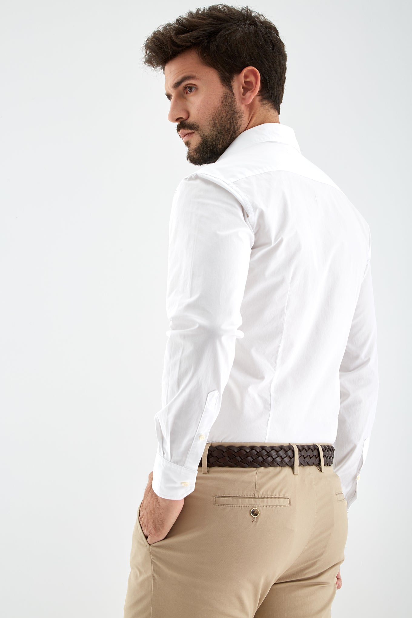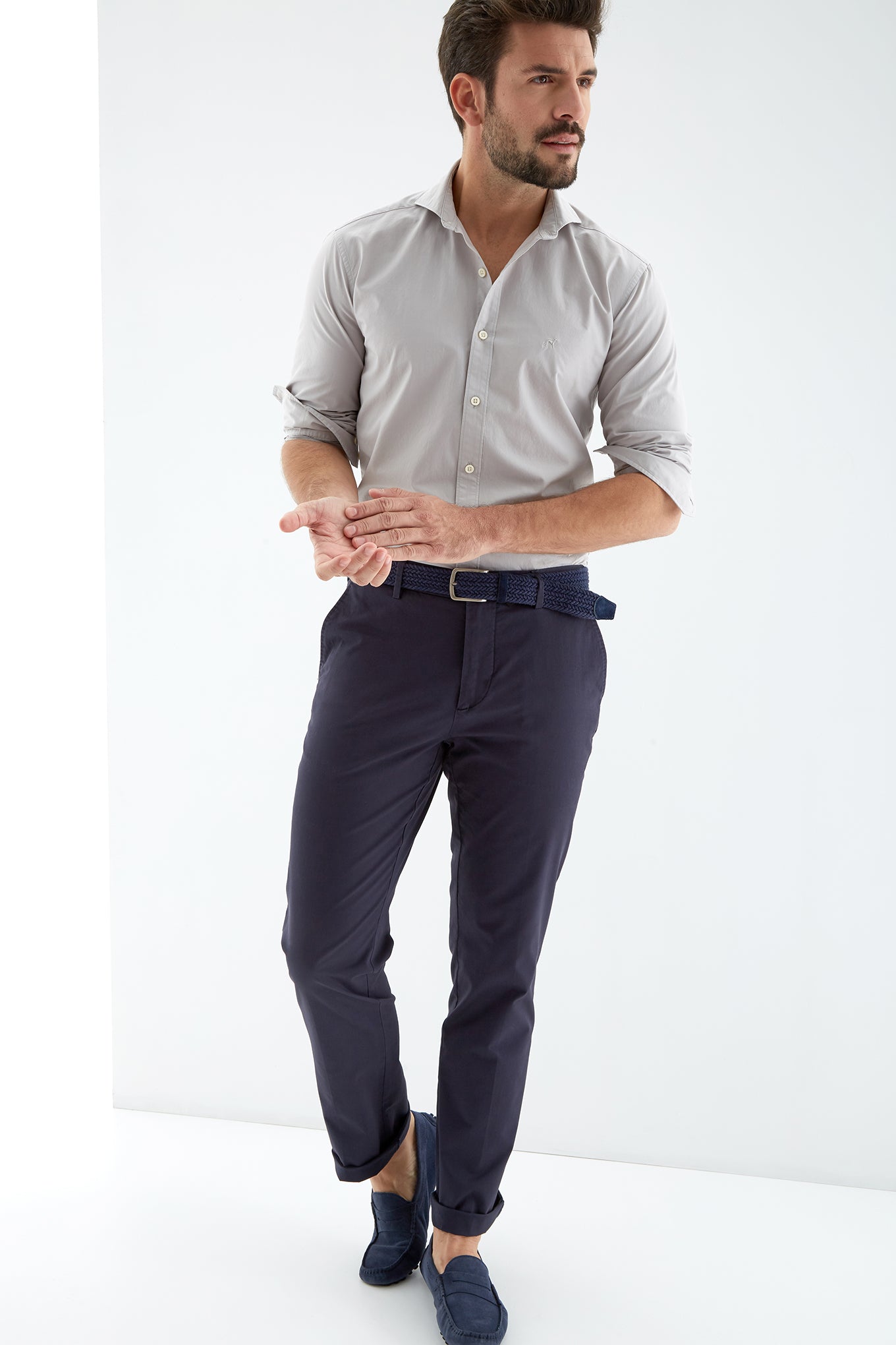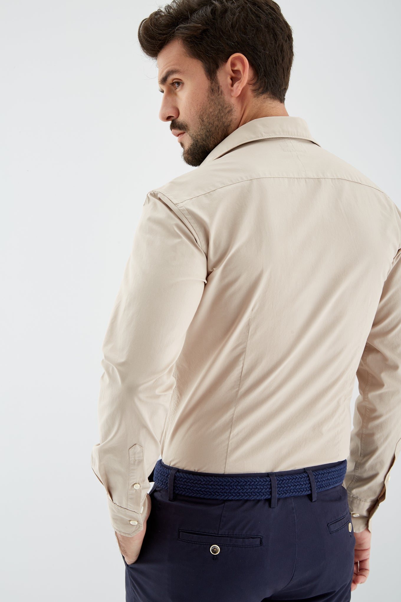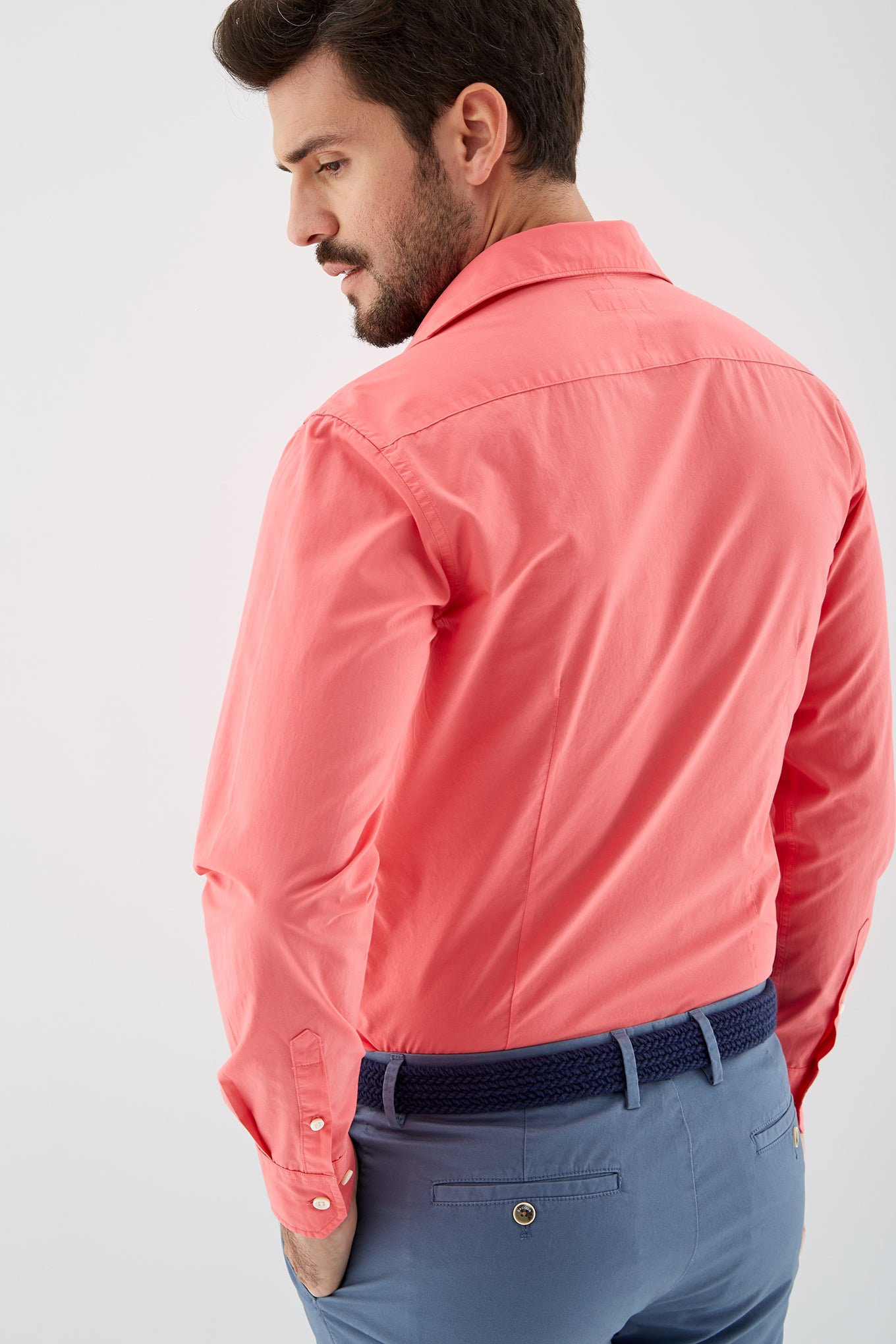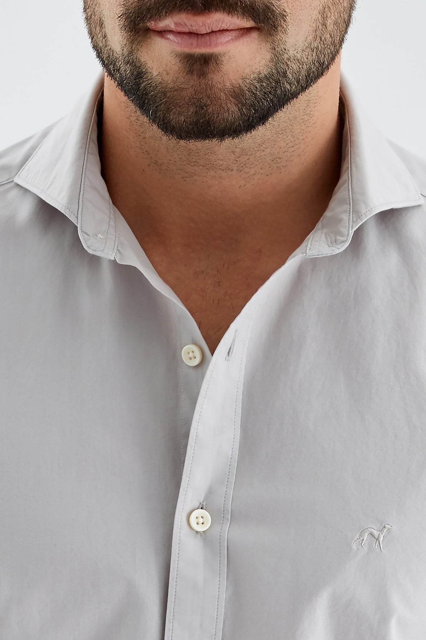 Men's plain slim fit sports shirt. Logo detail embroidered on the chest. 100% cotton long sleeve shirt, with cuff buttons and collar with stays. Available at Sacoor Brothers' online store.