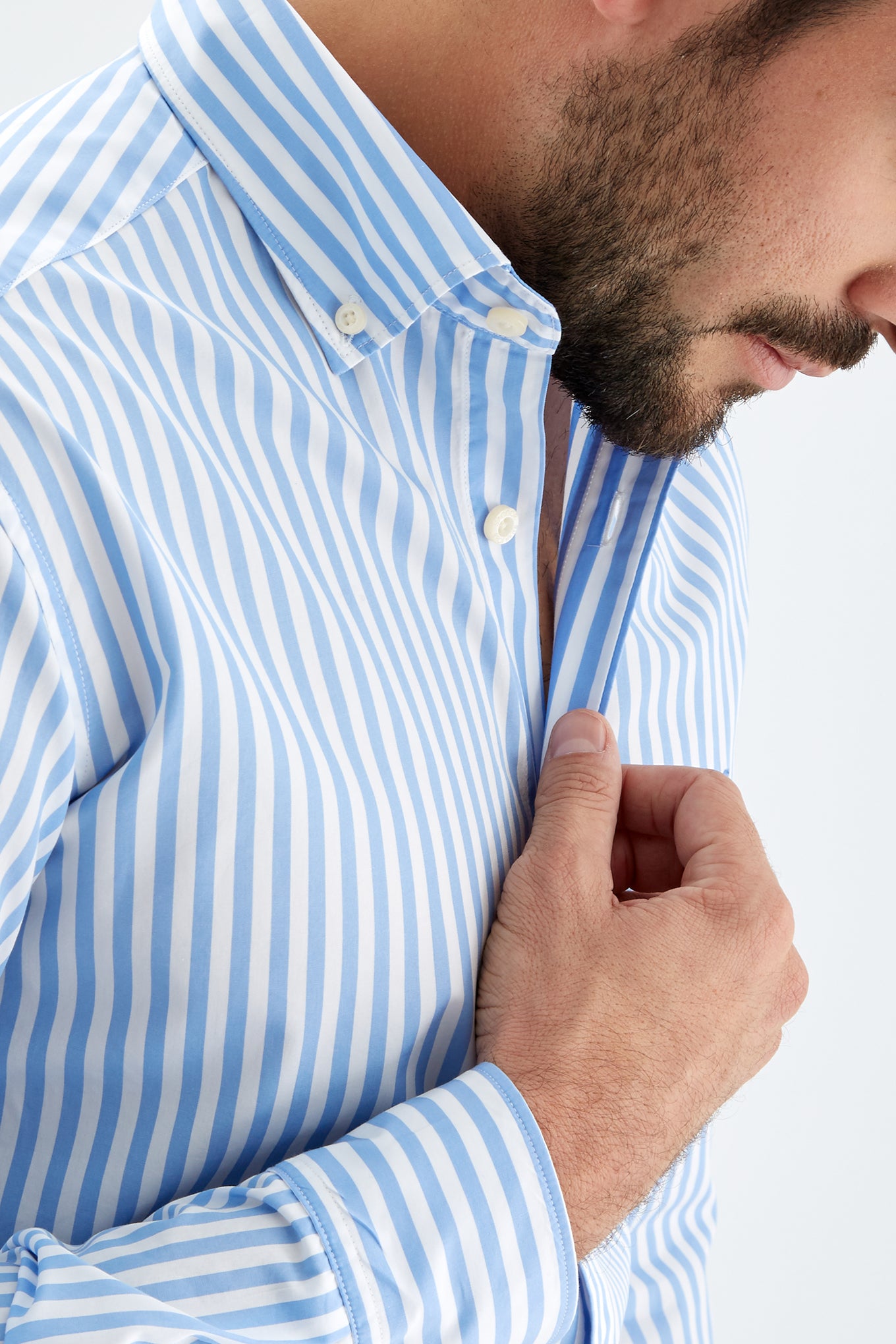 Men's striped slim fit sports shirt. Logo detail on the chest. Pure cotton long sleeve shirt with collar and cuff buttons. Available at Sacoor Brothers' online store.