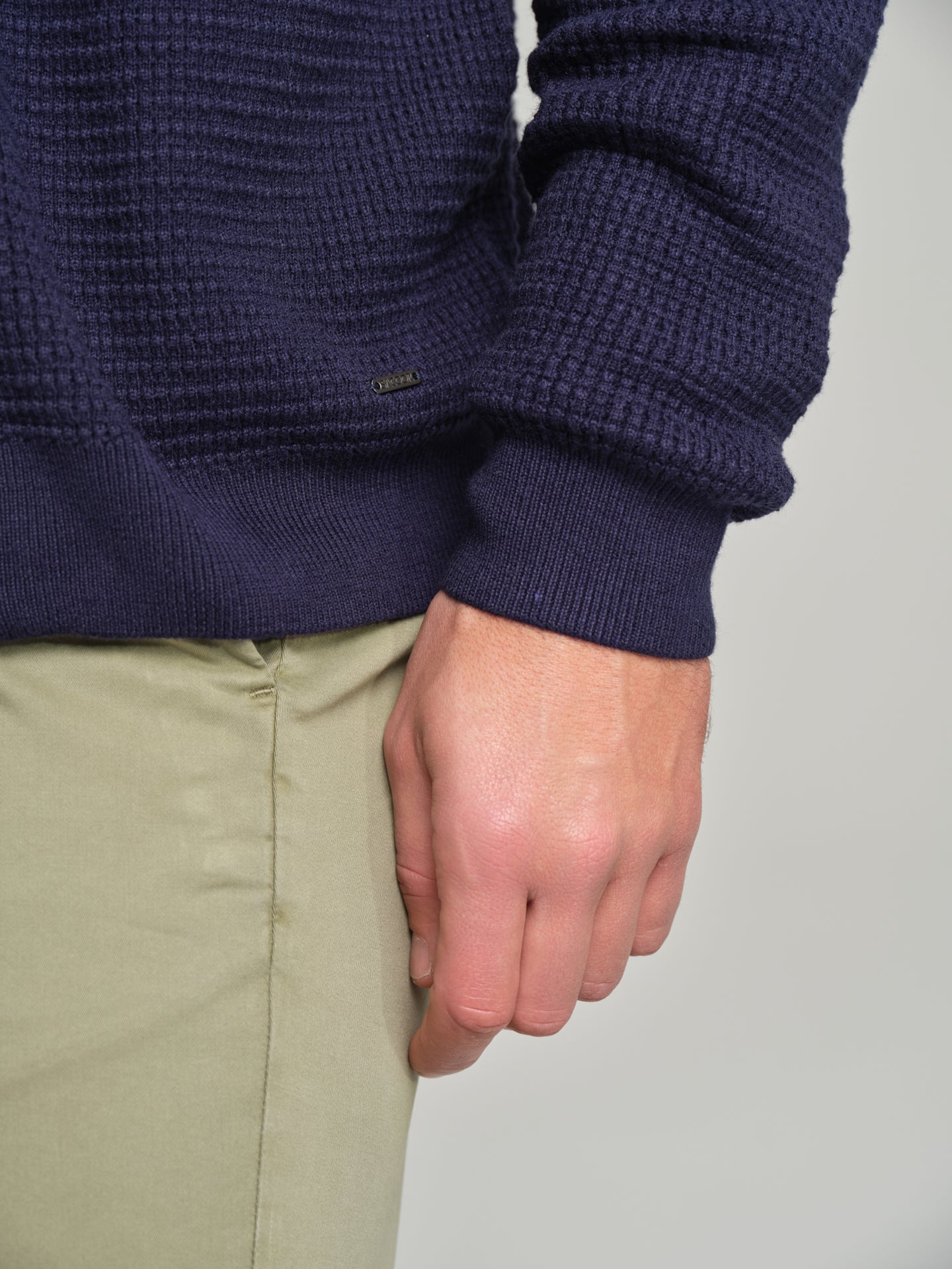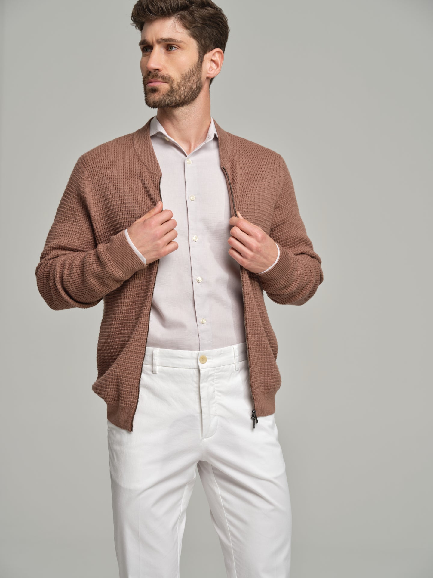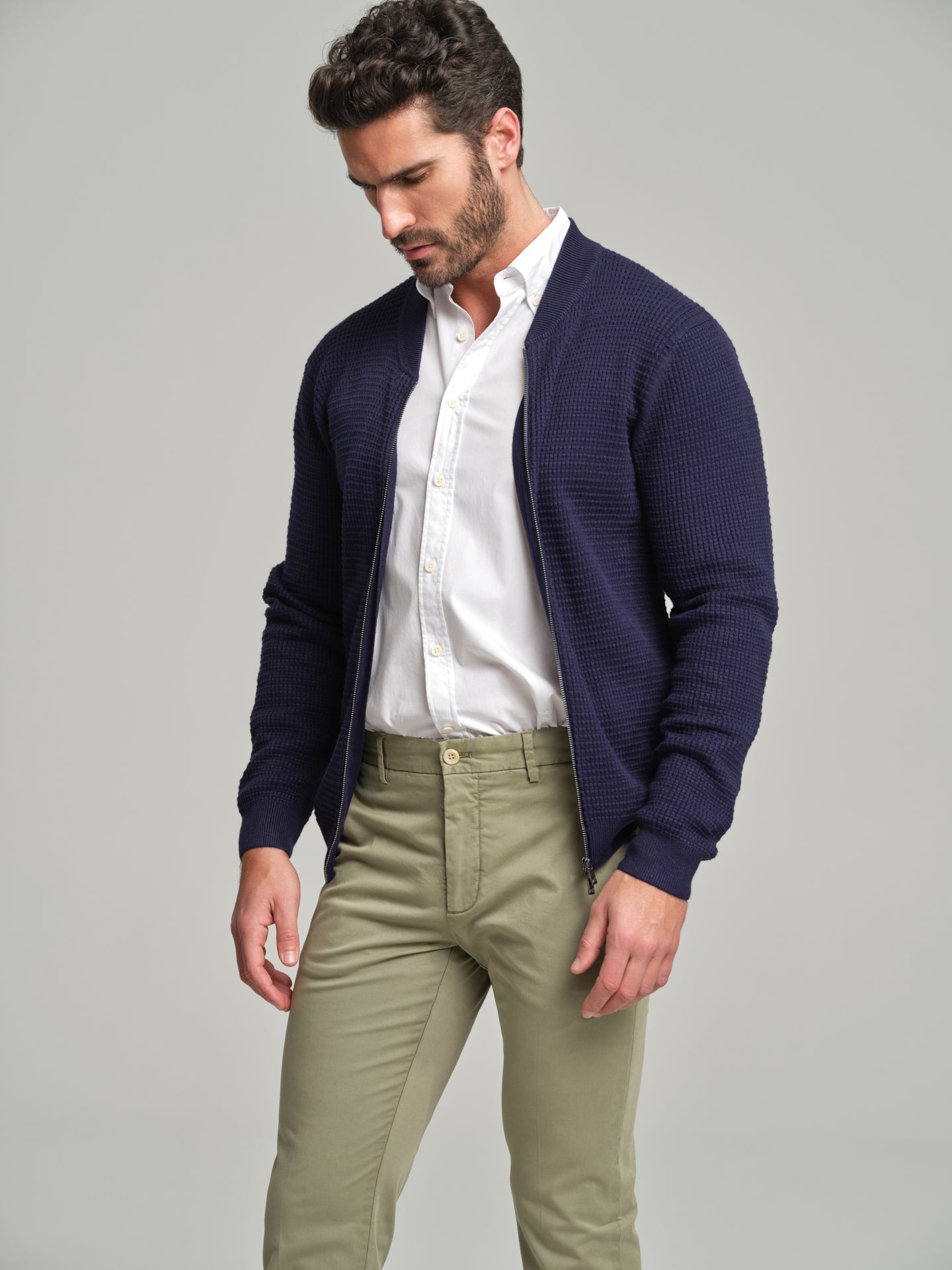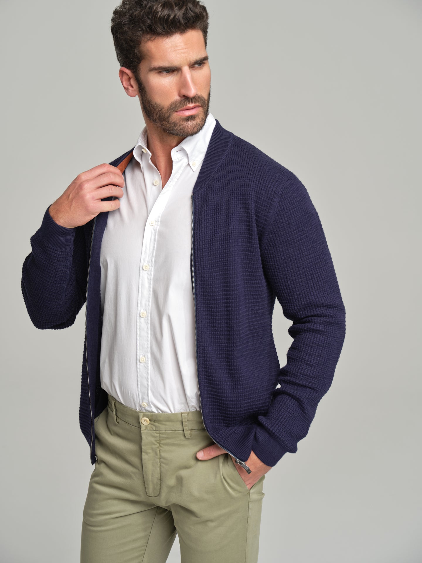 Relax' long sleeve waffle-knitted bomber made from blended cotton, viscose and silk. Fastening through a metal zipper and engraved puller at front. Contrasting color on inside collar. Brand metal plate at bottom.