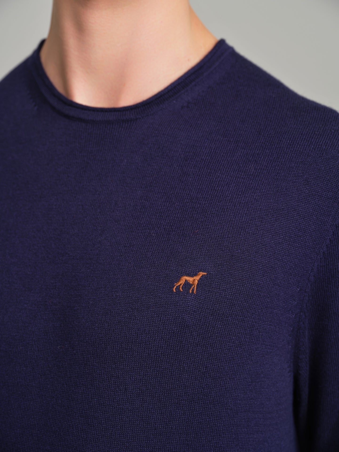 Long sleeve sweater with chest embroidery. Made from blended cotton, viscose and silk. Contrast color inside collar. Bottom and sleeves with delicate roll edges.