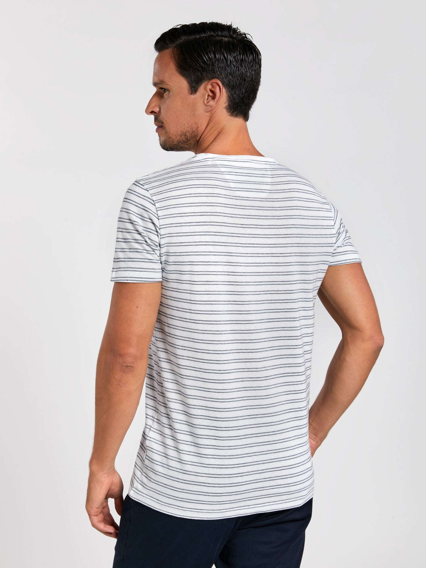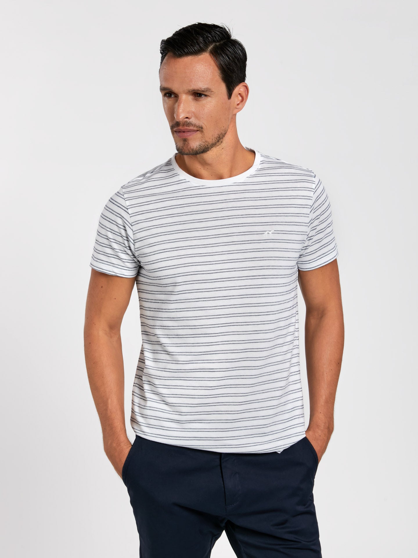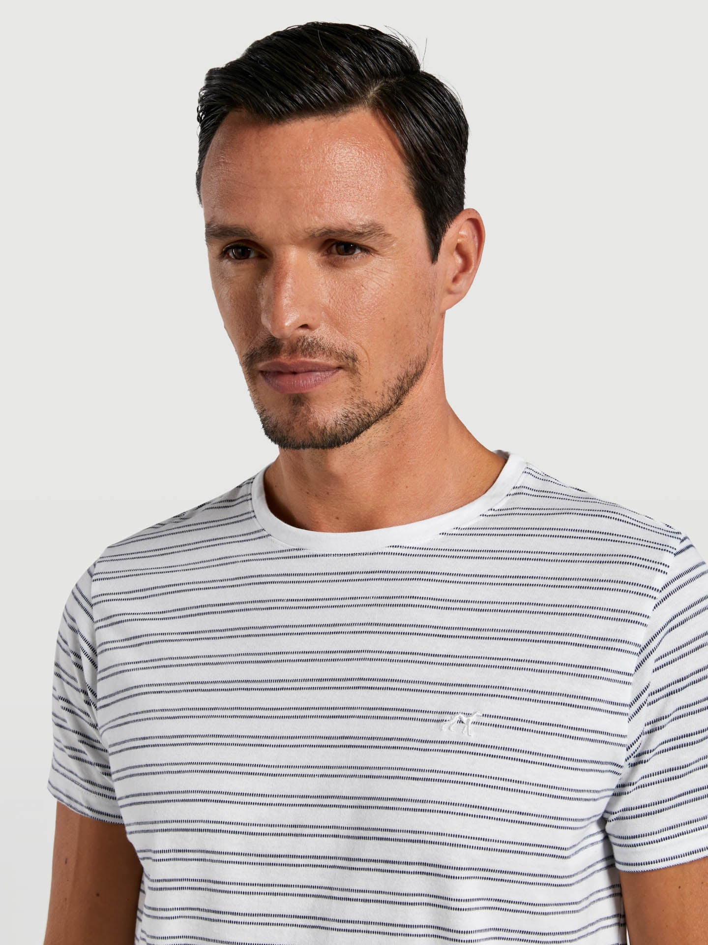 Relax' 100% Cotton jersey t-shirt with fancy stripes and chest logo embroidery. Leisure fit with round neckline and short sleeves with double-needle hem. This capsule collection explores the space between refinement and relaxation, comfort and effortless style, functionality and elegance.