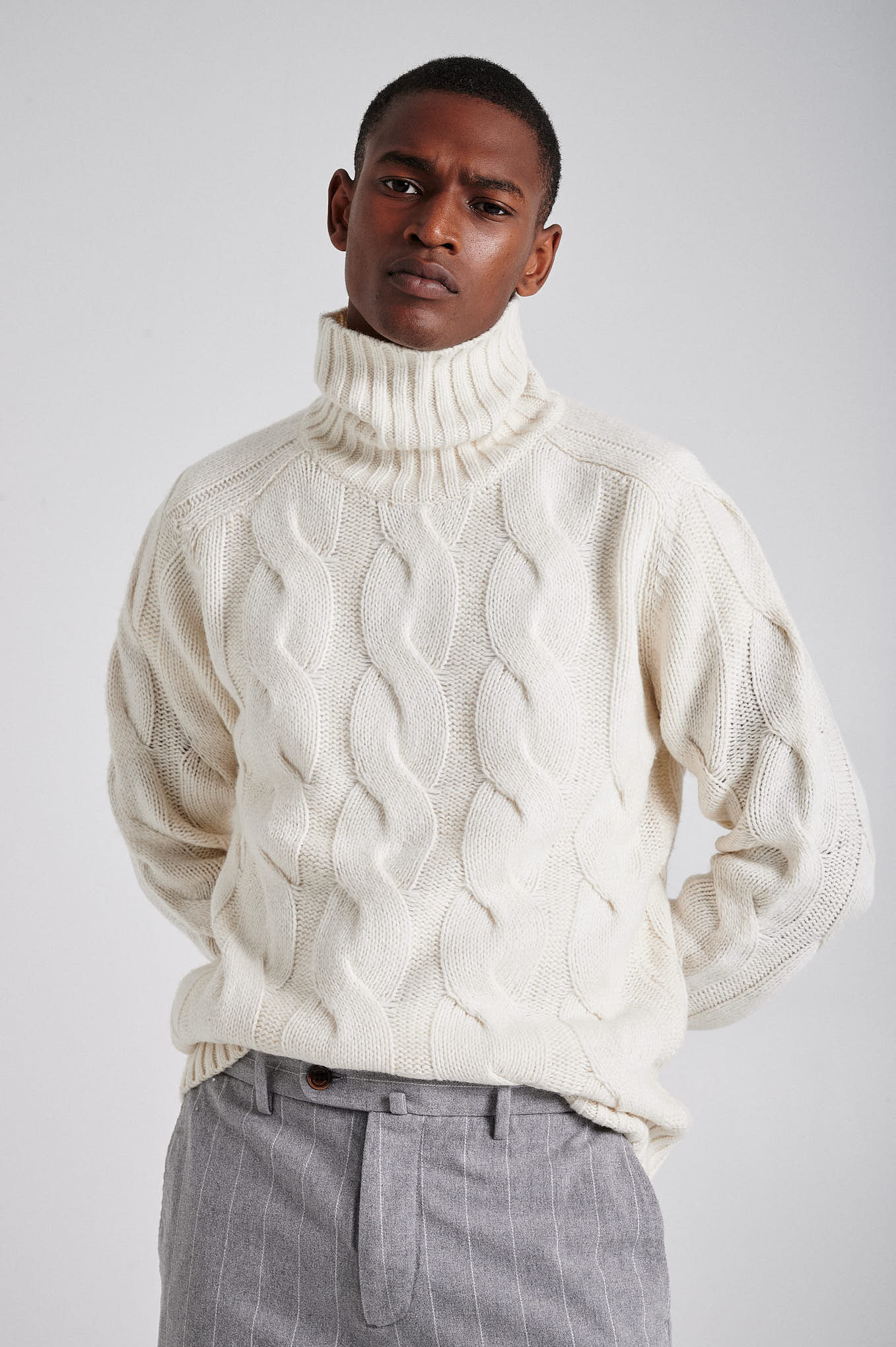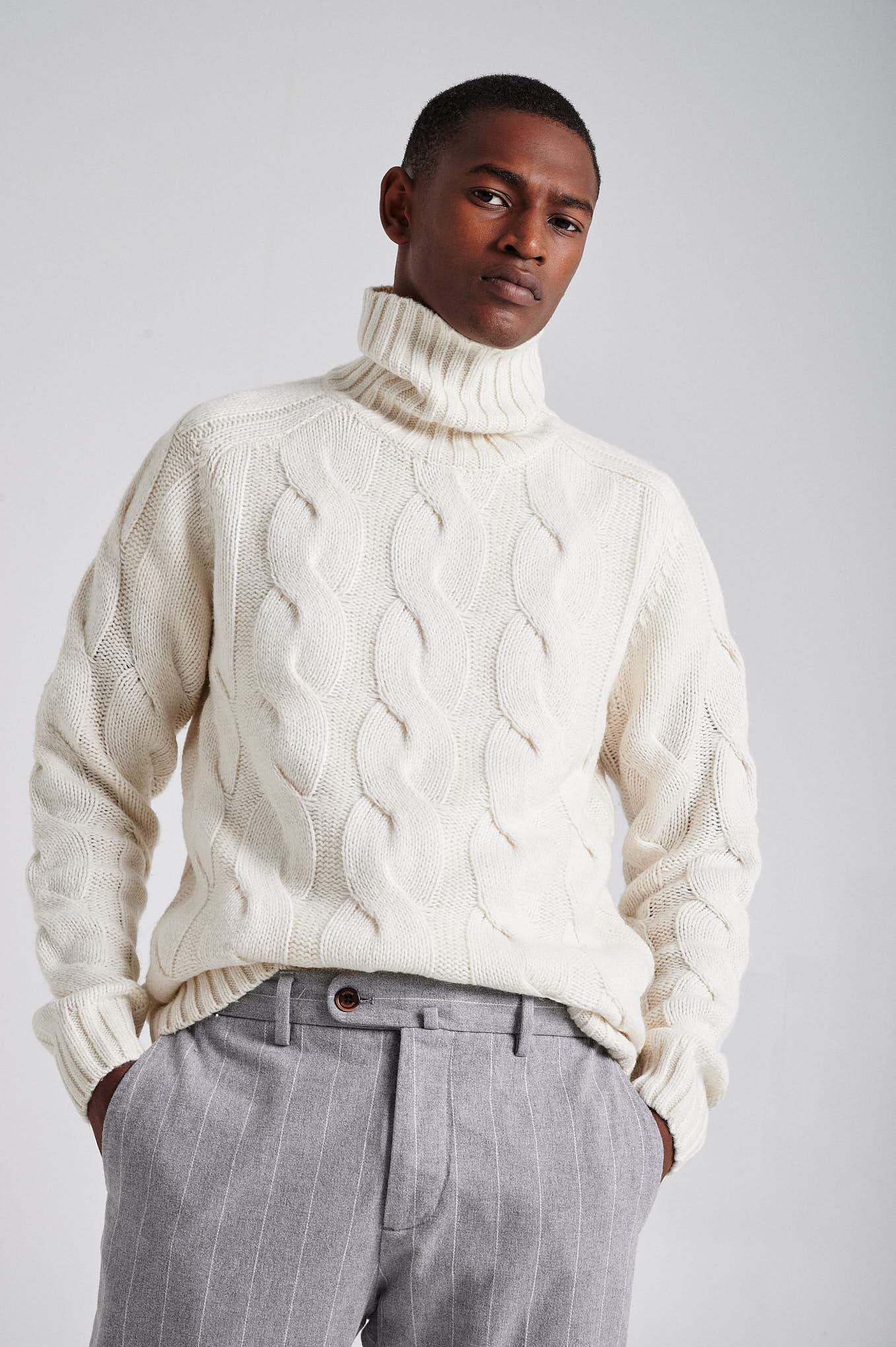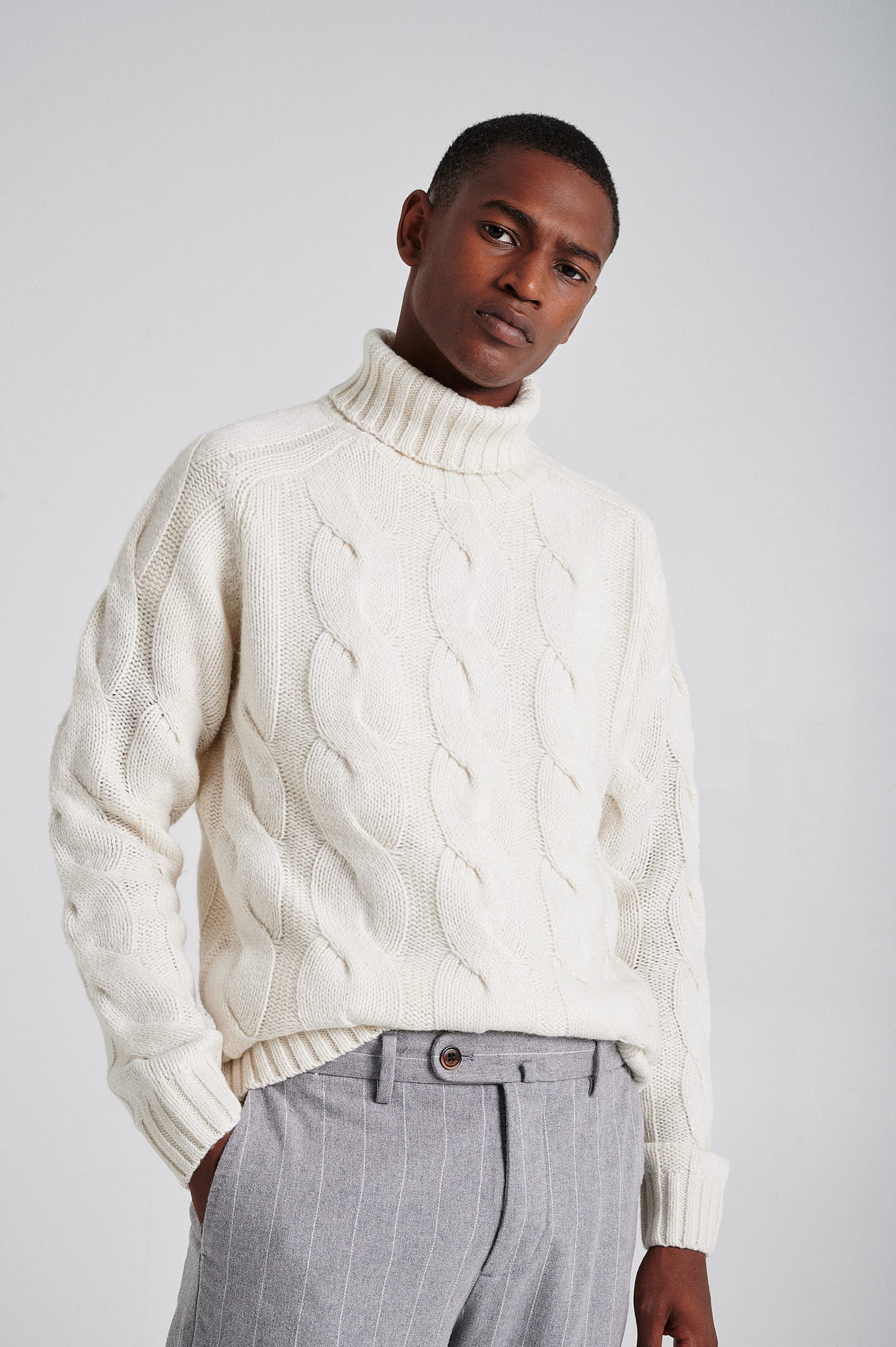 Long sleeve turtleneck sweater in blended lambswool and cotton. Chunky cable on body and sleeves. Personalized metal plate at the bottom.