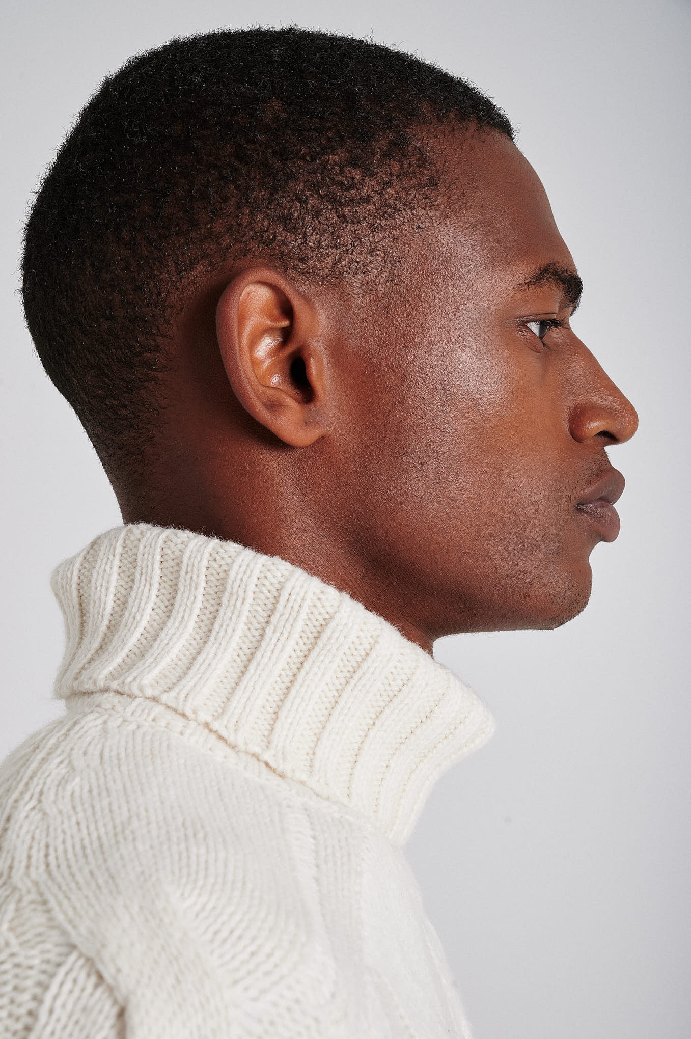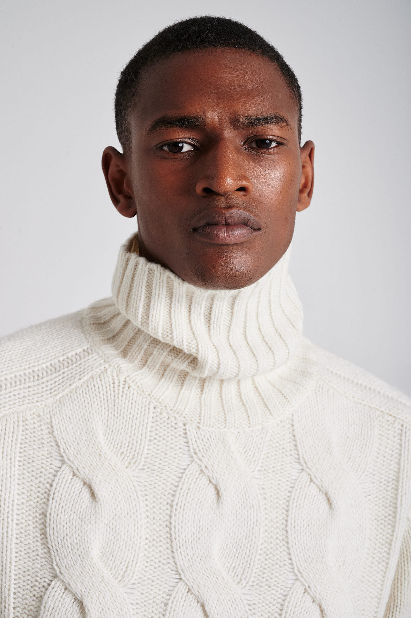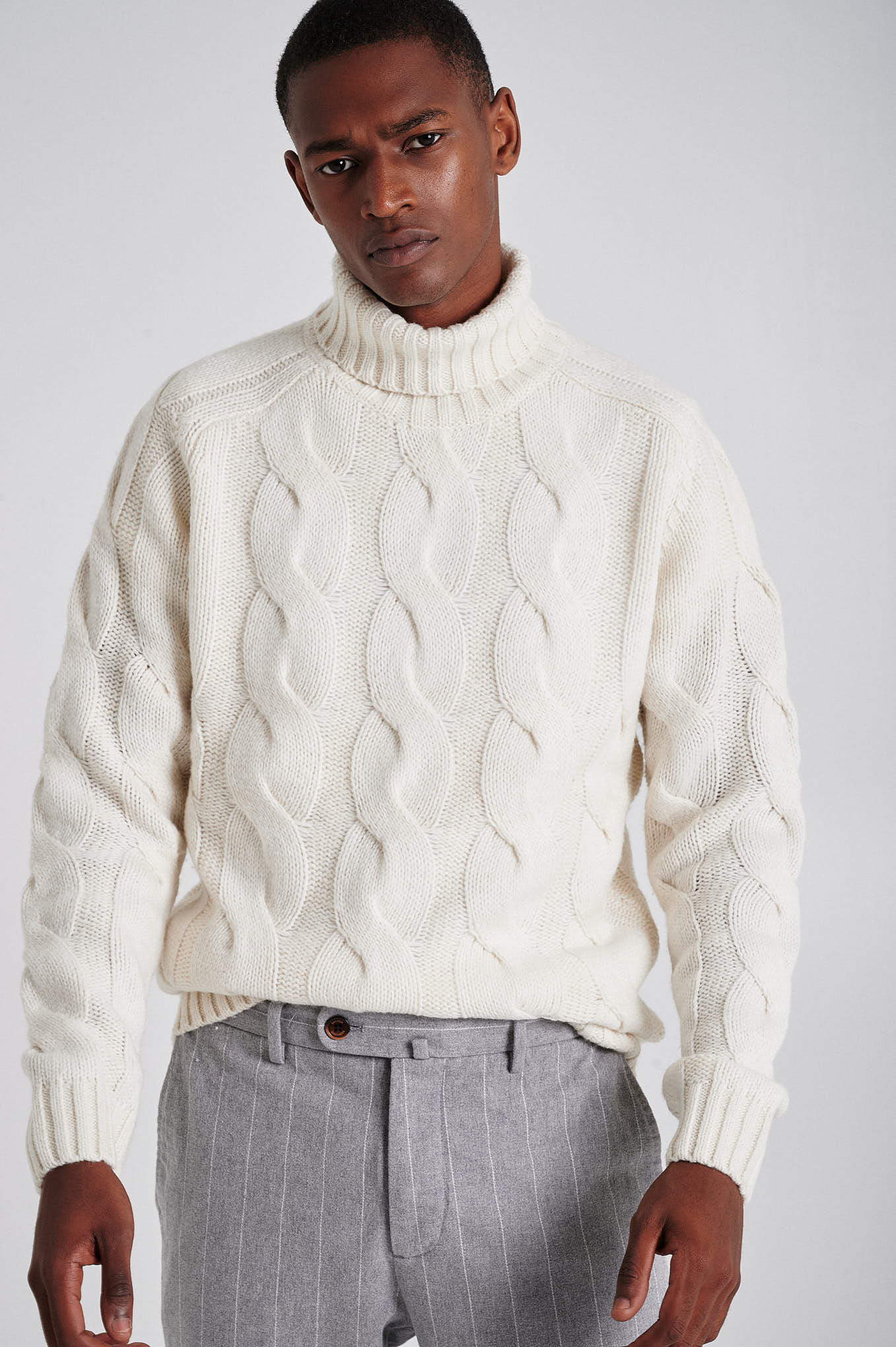 Long sleeve turtleneck sweater in blended lambswool and cotton. Chunky cable on body and sleeves. Personalized metal plate at the bottom.