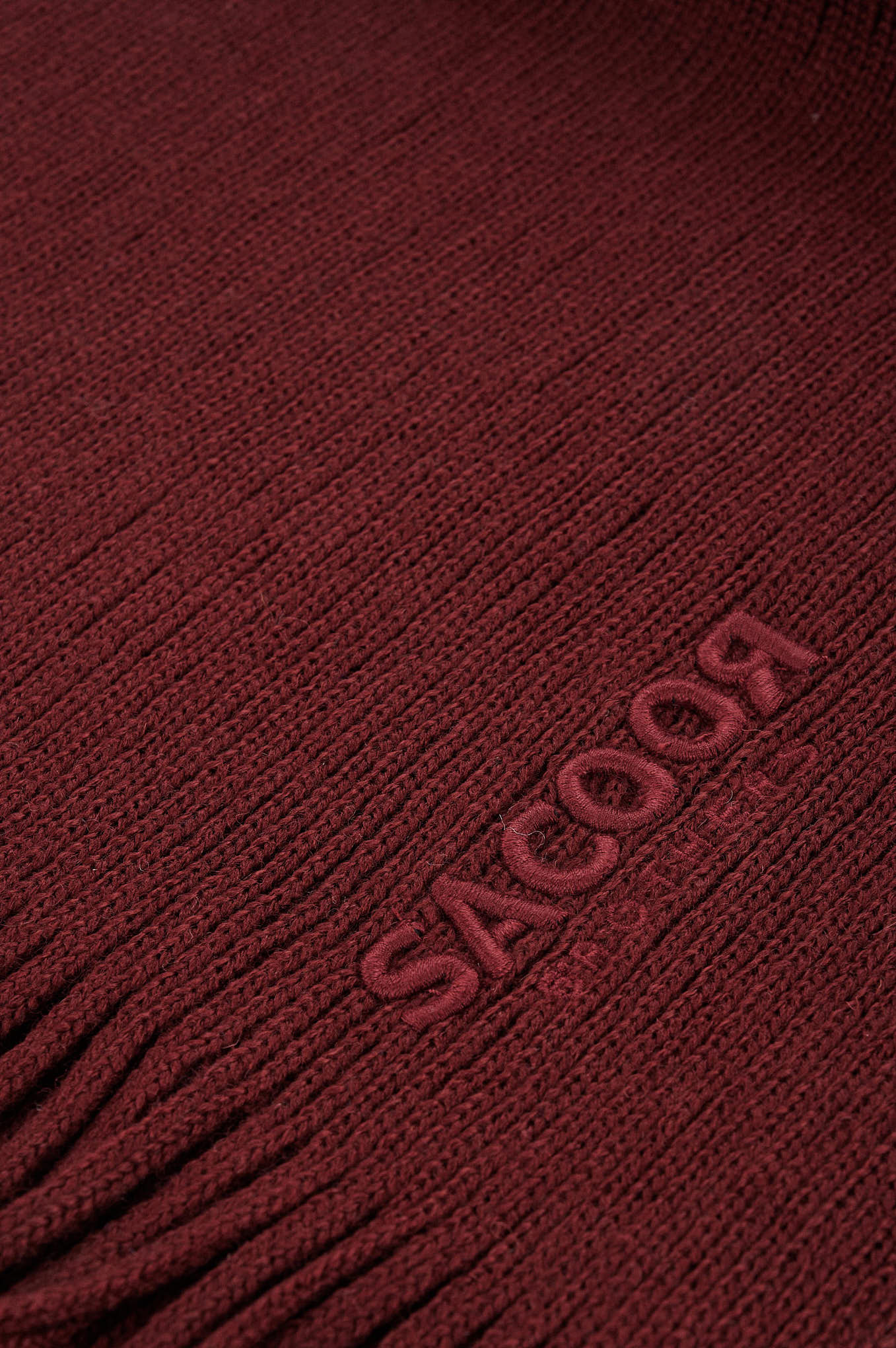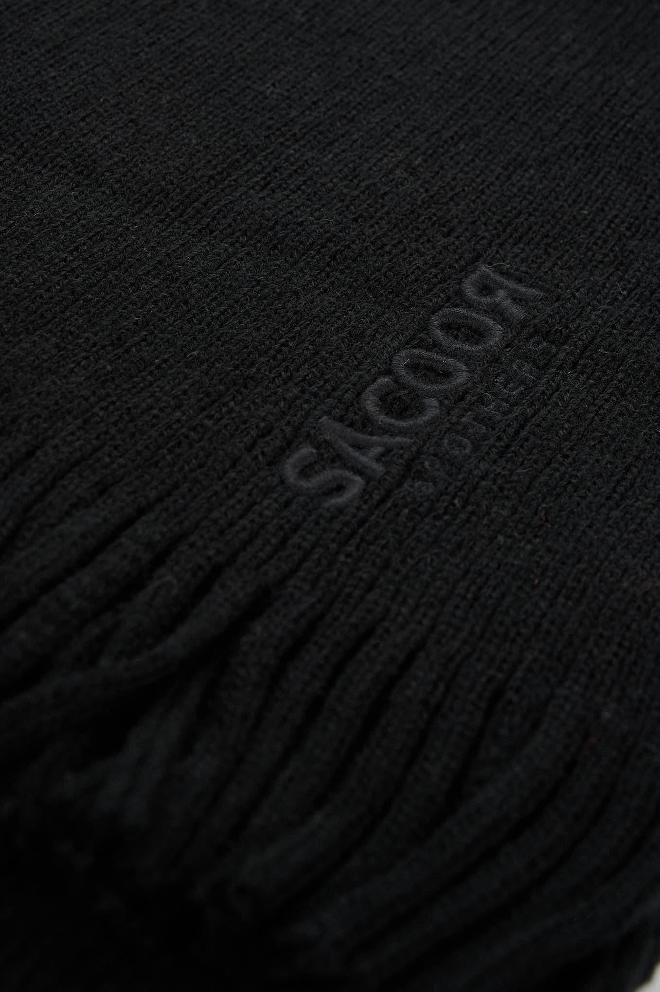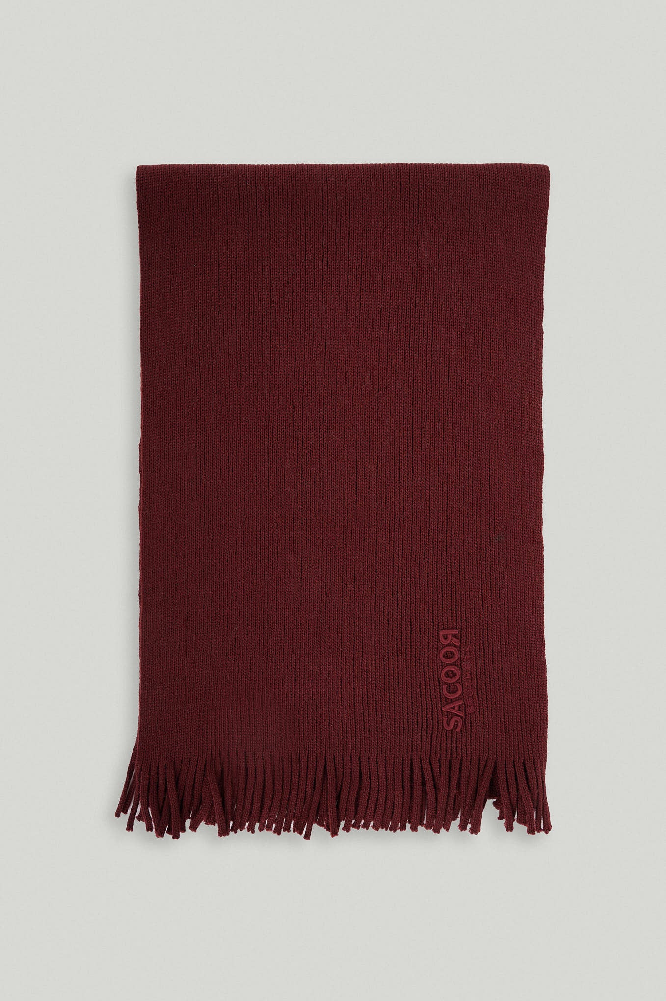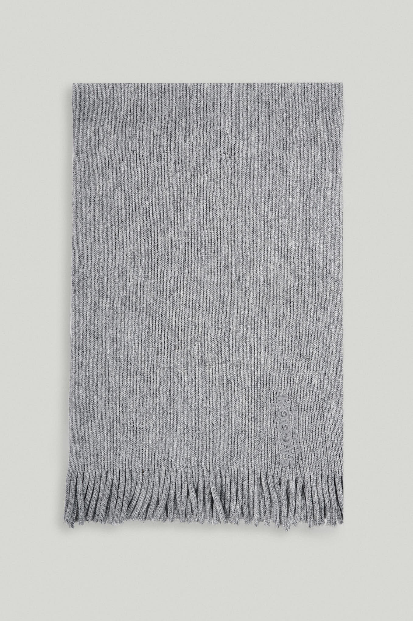 Knitted scarf made from wool and nylon blend. Fringes edges finishing and brand's tone on tone personalized embroidery at side.