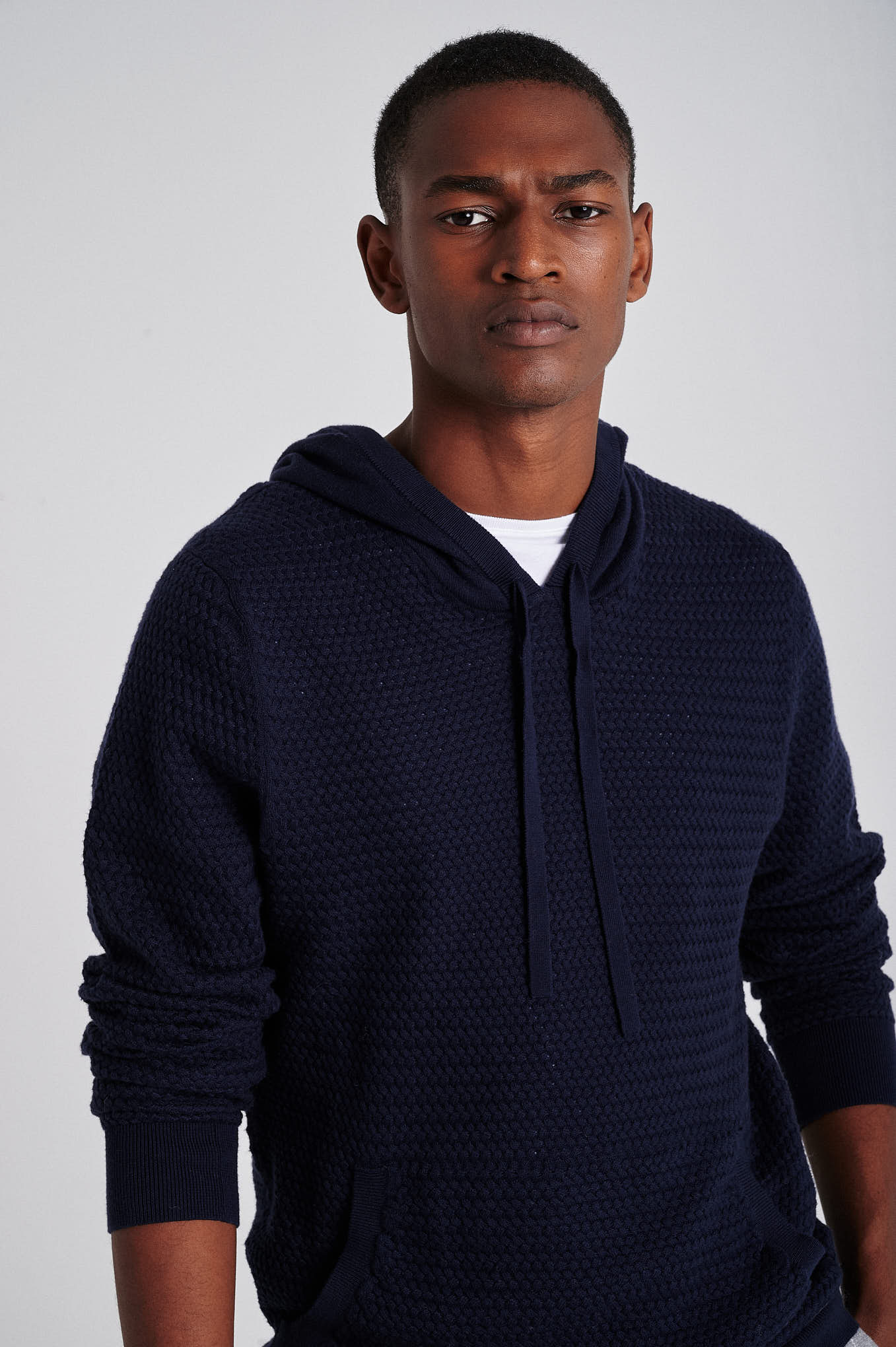 Long sleeve hooded sweater in 100% organic cotton. All over fancy knitting. kangaroo pocket on front with personalized metal plate.