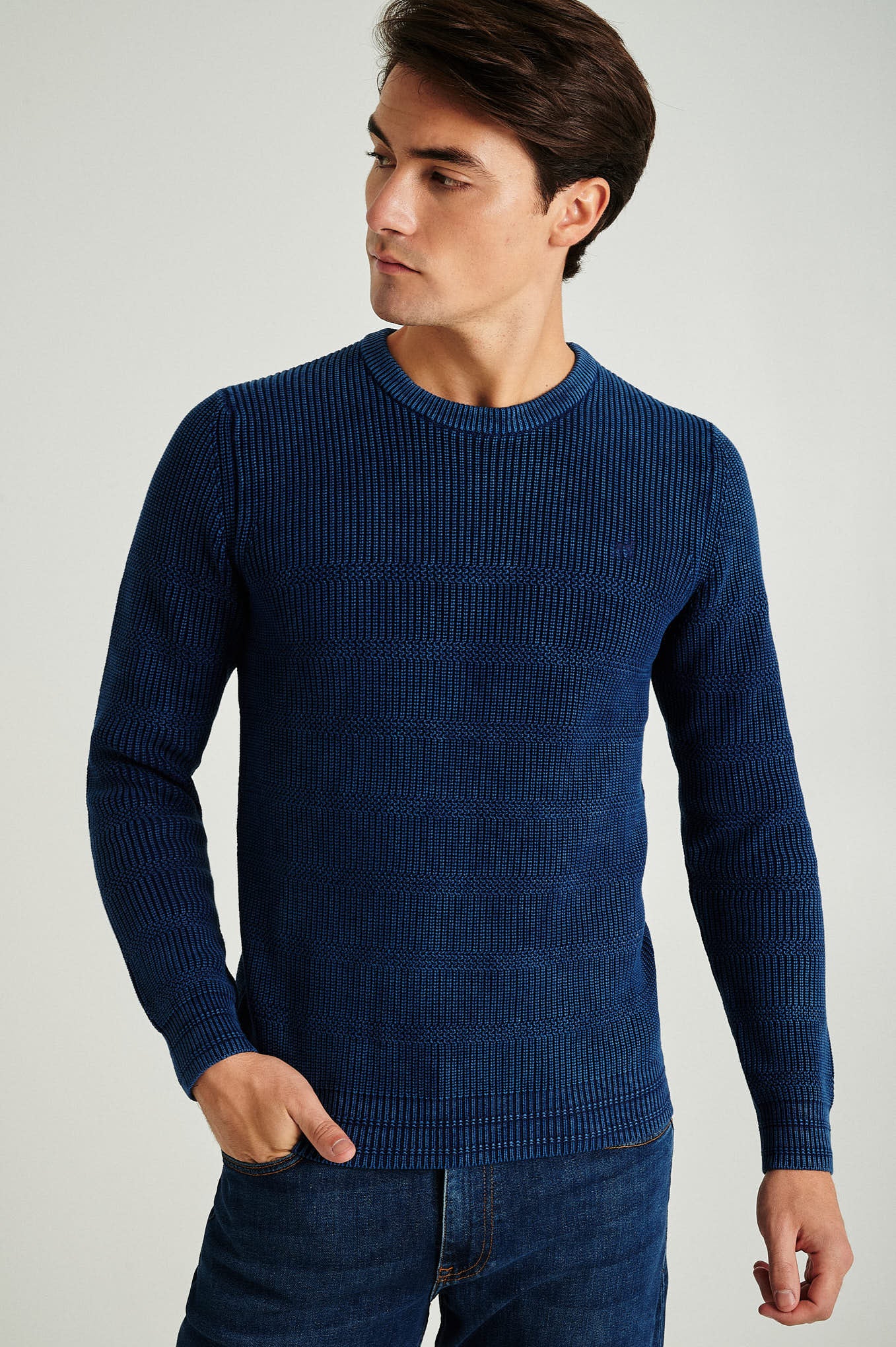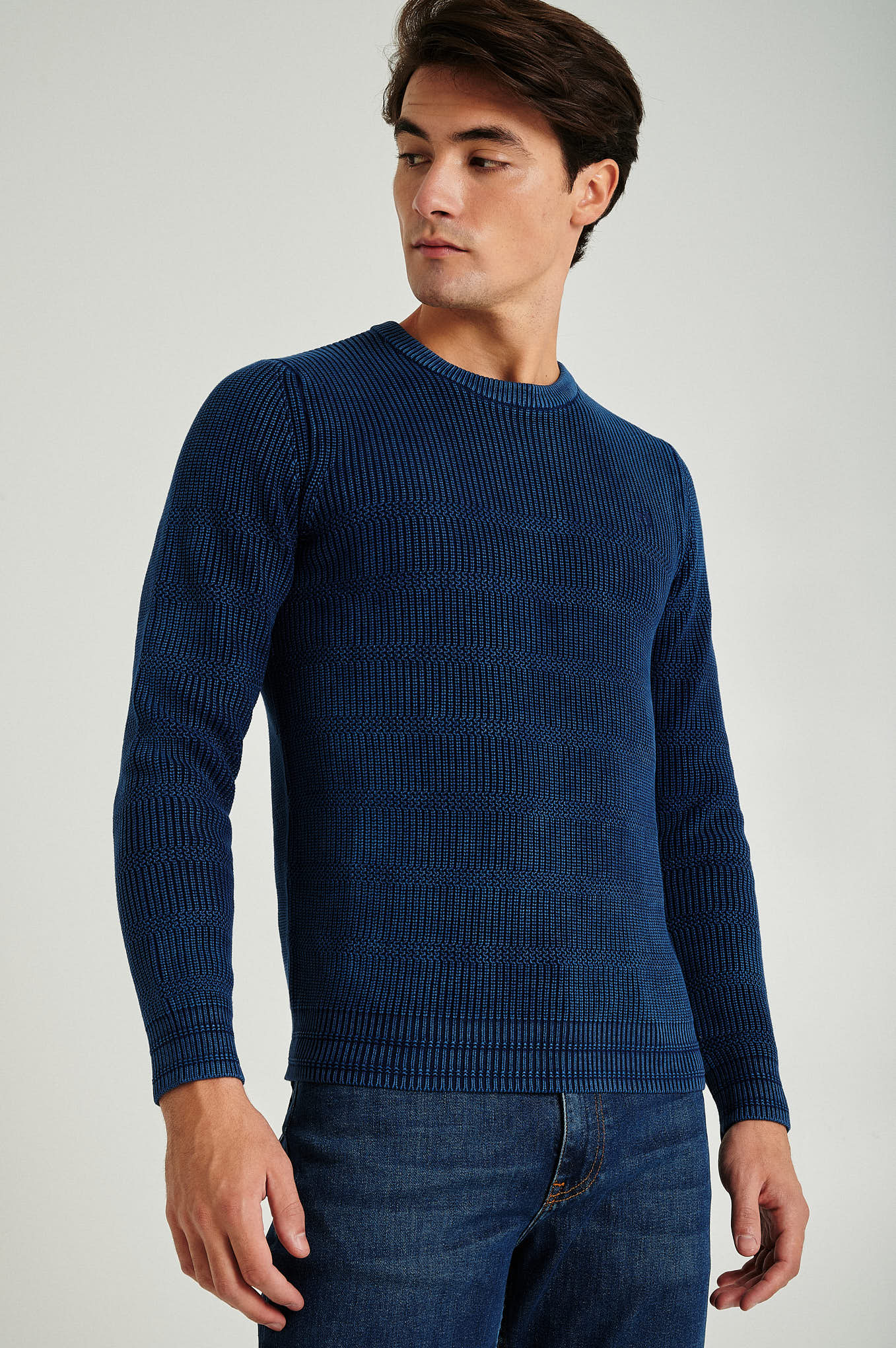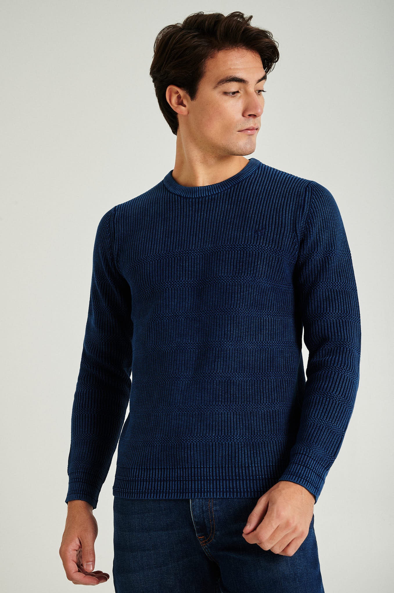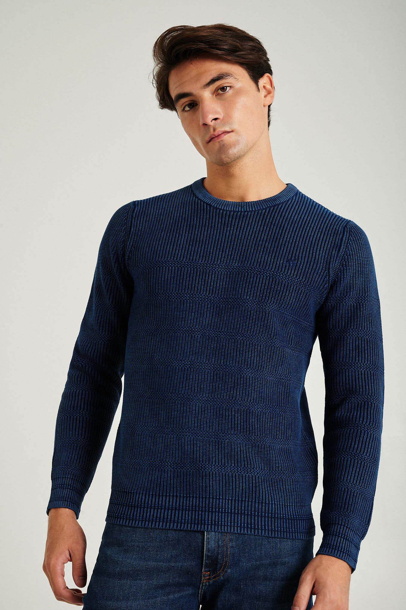 Long sleeve round neck sweater in 100% organic cotton, real indigo garment dye. All over fancy stripes with half-cardigan stitch. Personalized embroidery on chest.