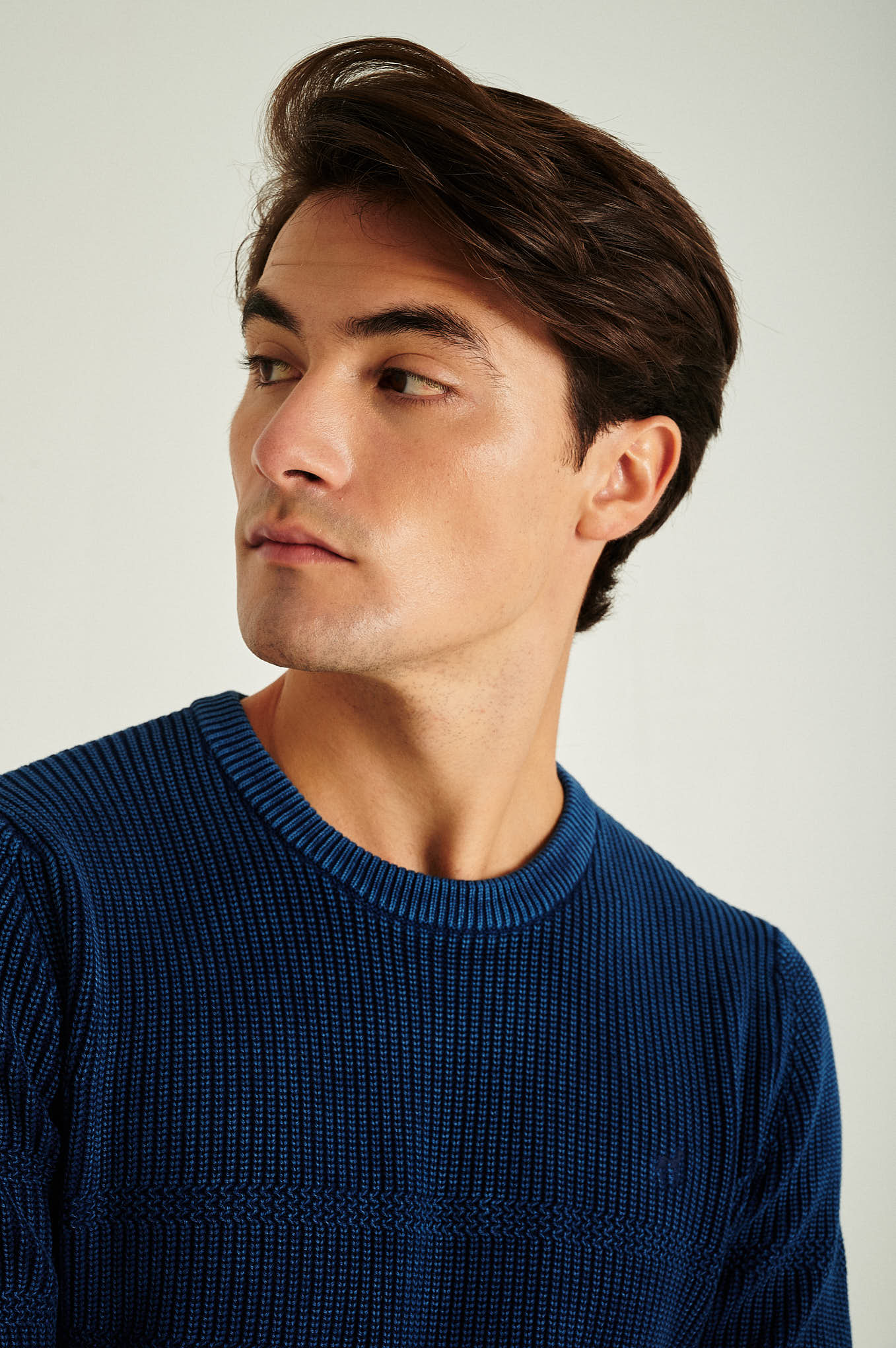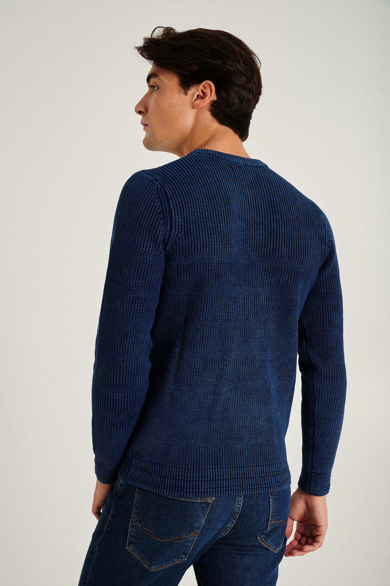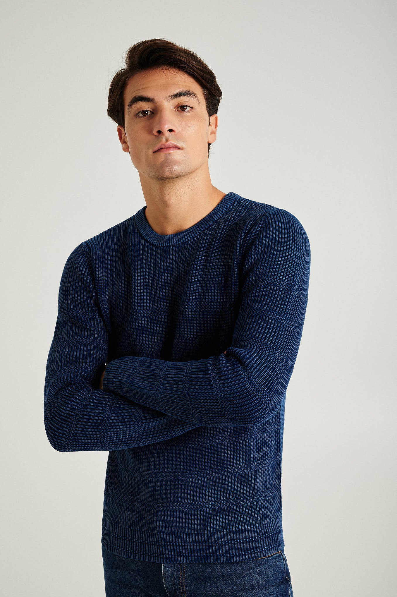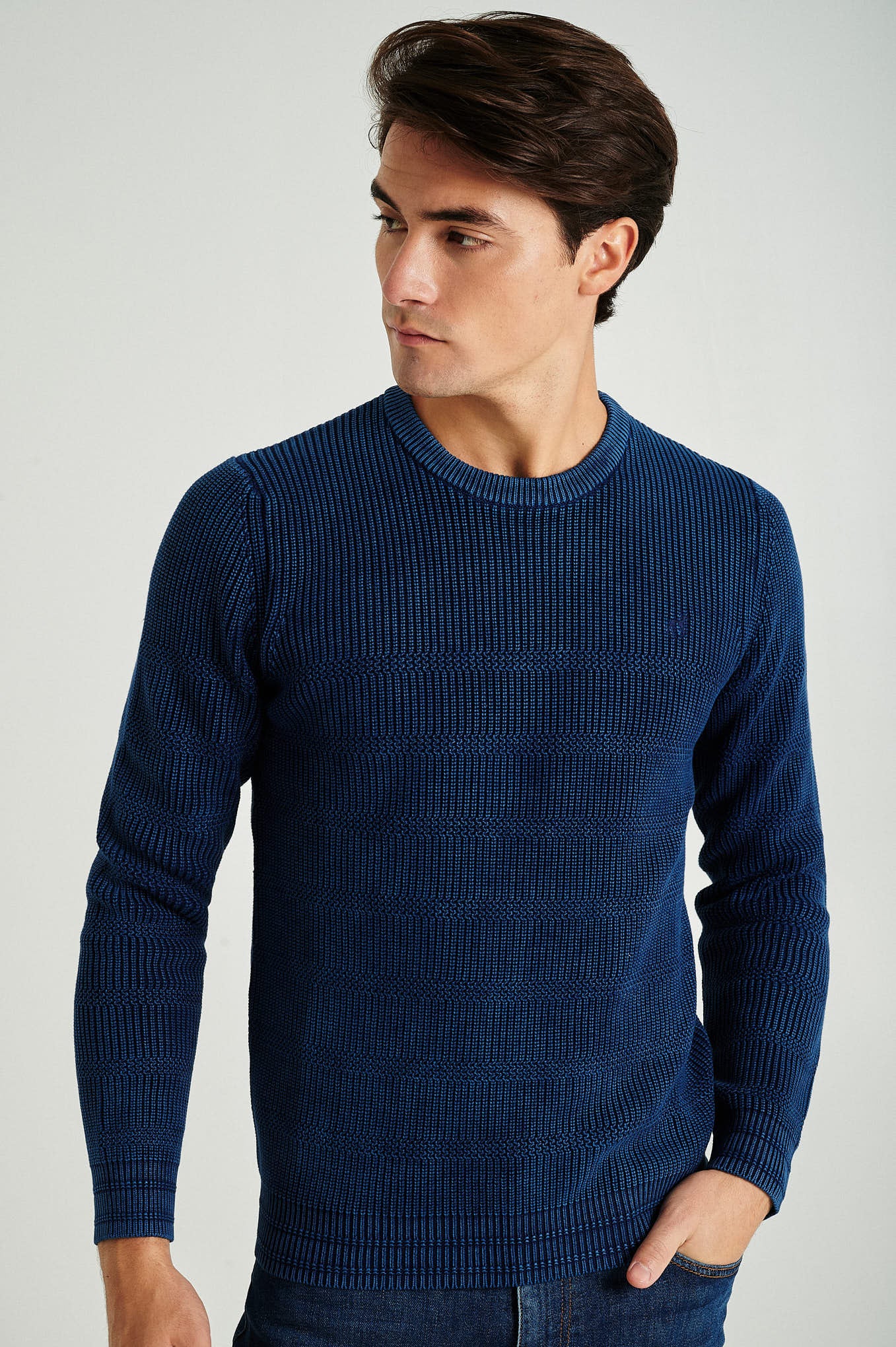 Long sleeve round neck sweater in 100% organic cotton, real indigo garment dye. All over fancy stripes with half-cardigan stitch. Personalized embroidery on chest.
