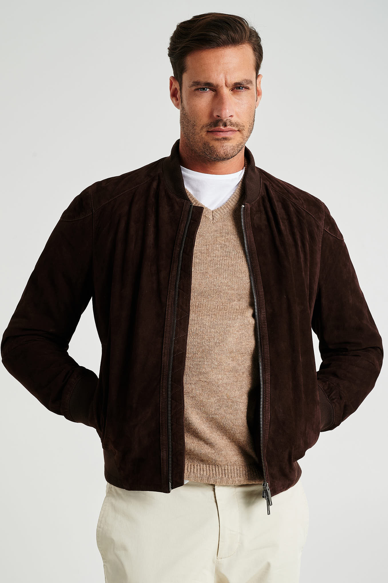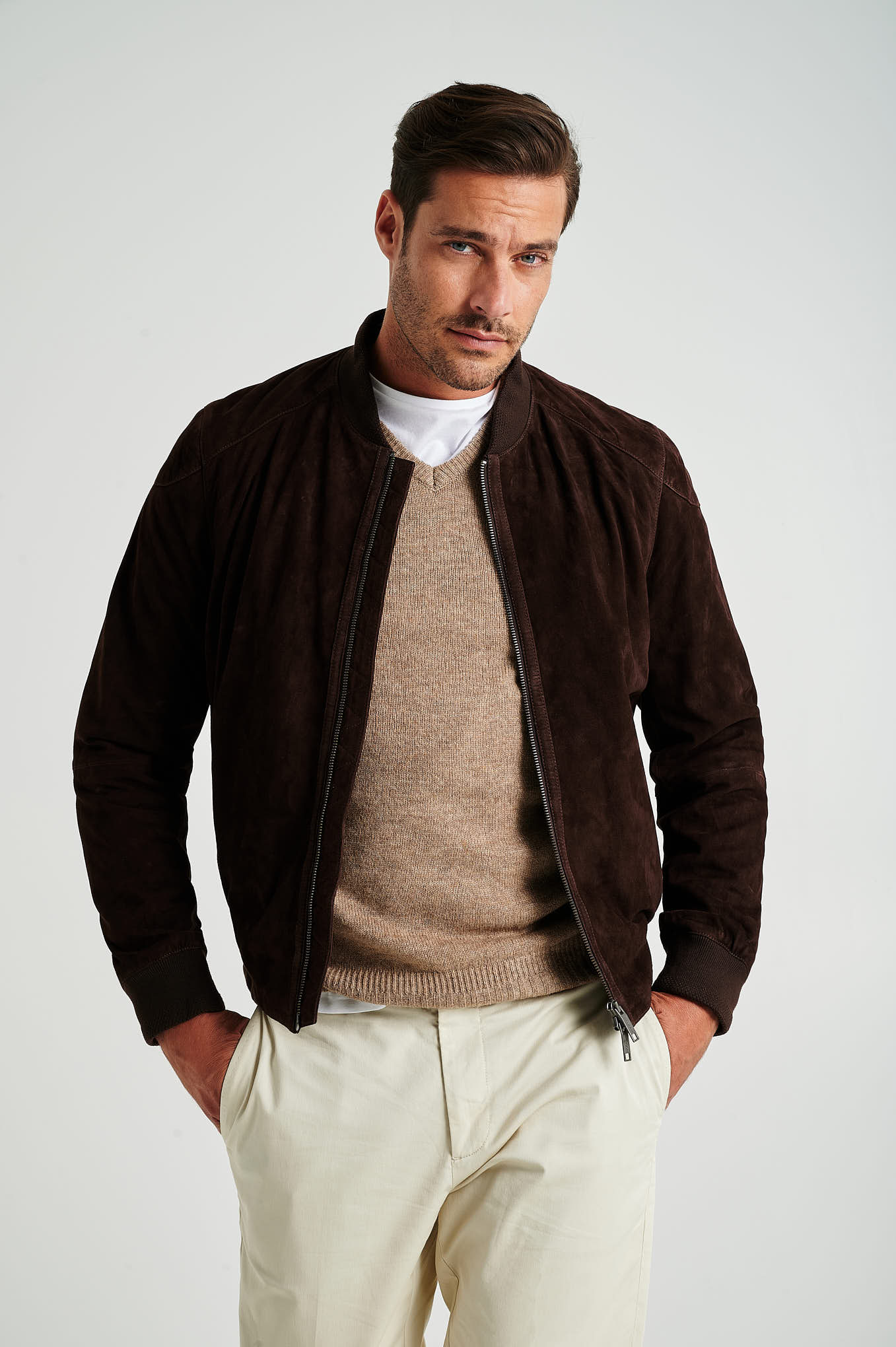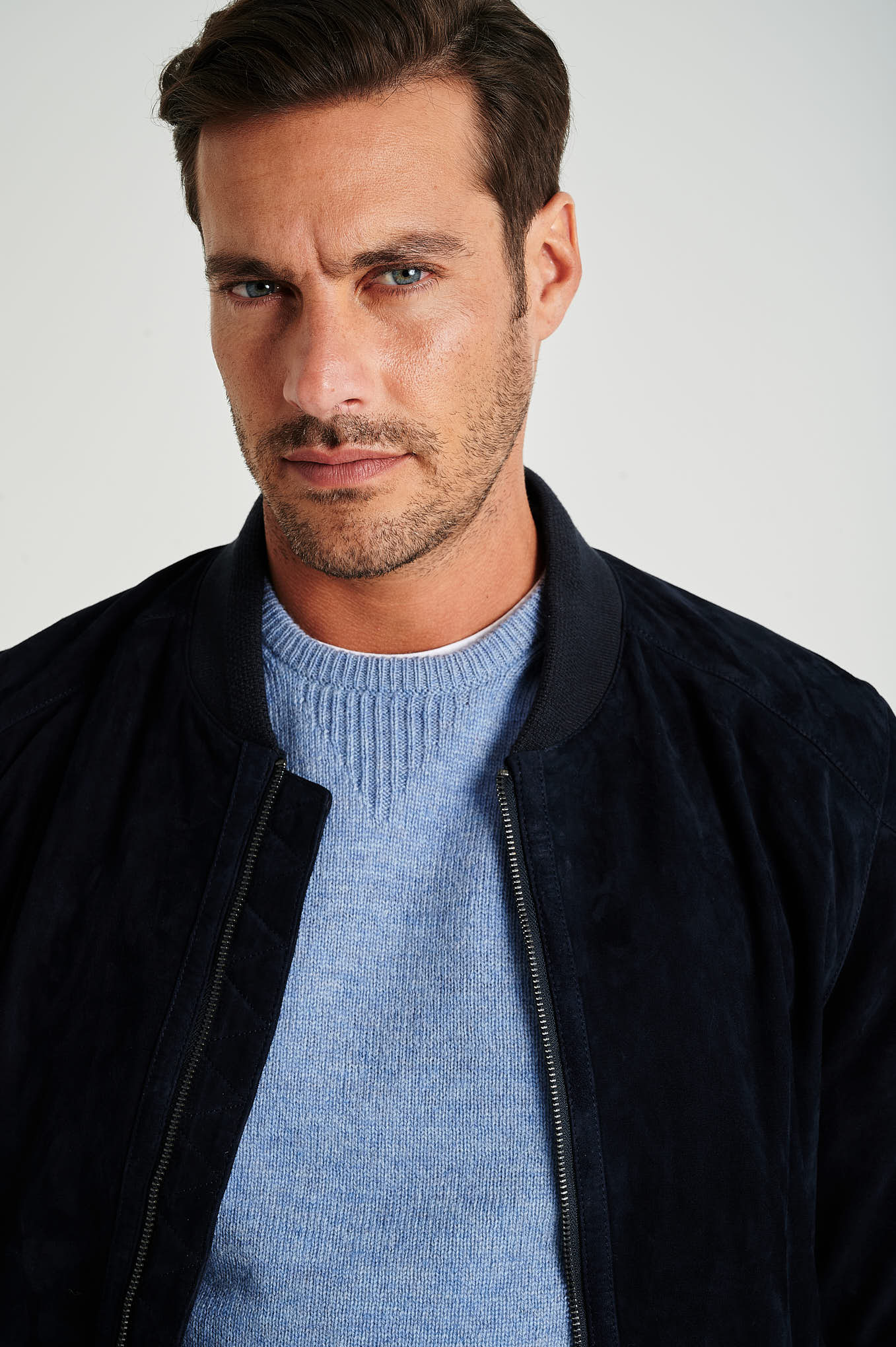 Bomber jacket in genuine suede leather, plain. Chrome free and vegan. Straight cut model. Collar, cuffs and bottom with fancy rib in cotton. Side piped pockets. Closes with zip and personalized pullers. Exists in DARK BLUE and CHOCOLATE color.