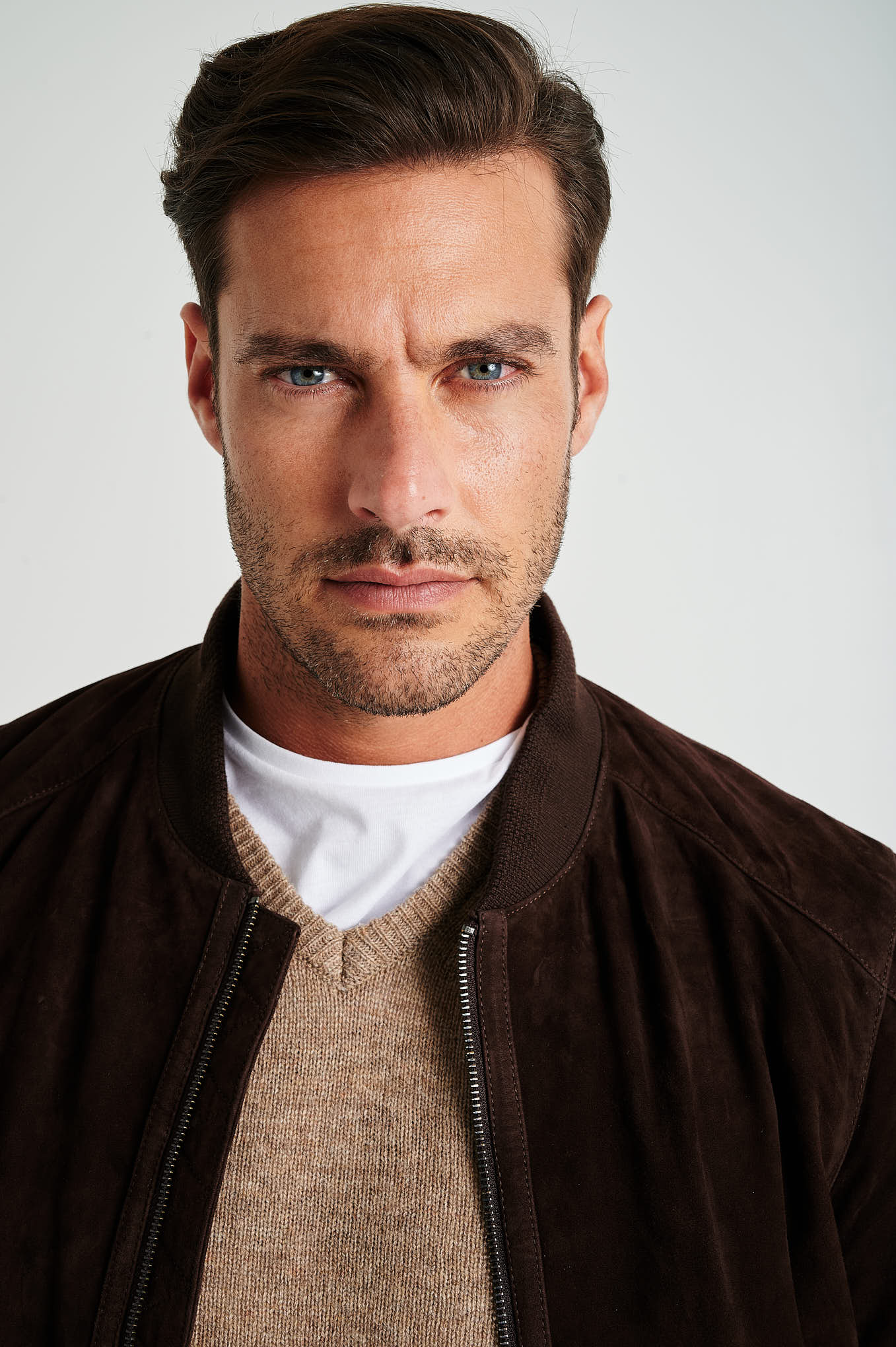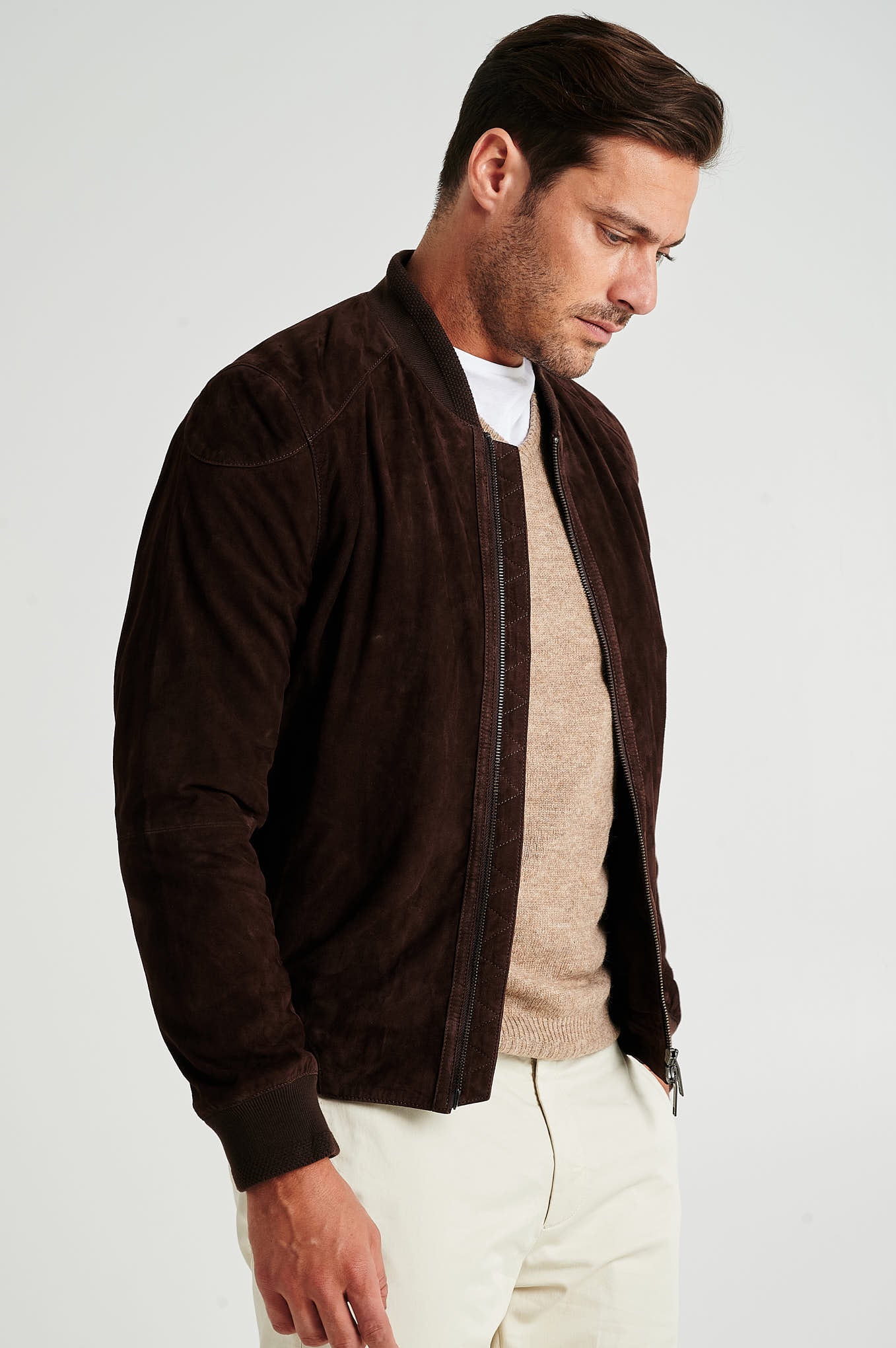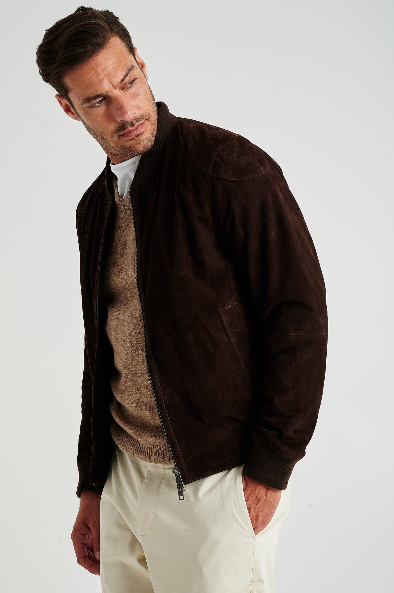Bomber jacket in genuine suede leather, plain. Chrome free and vegan. Straight cut model. Collar, cuffs and bottom with fancy rib in cotton. Side piped pockets. Closes with zip and personalized pullers. Exists in DARK BLUE and CHOCOLATE color.