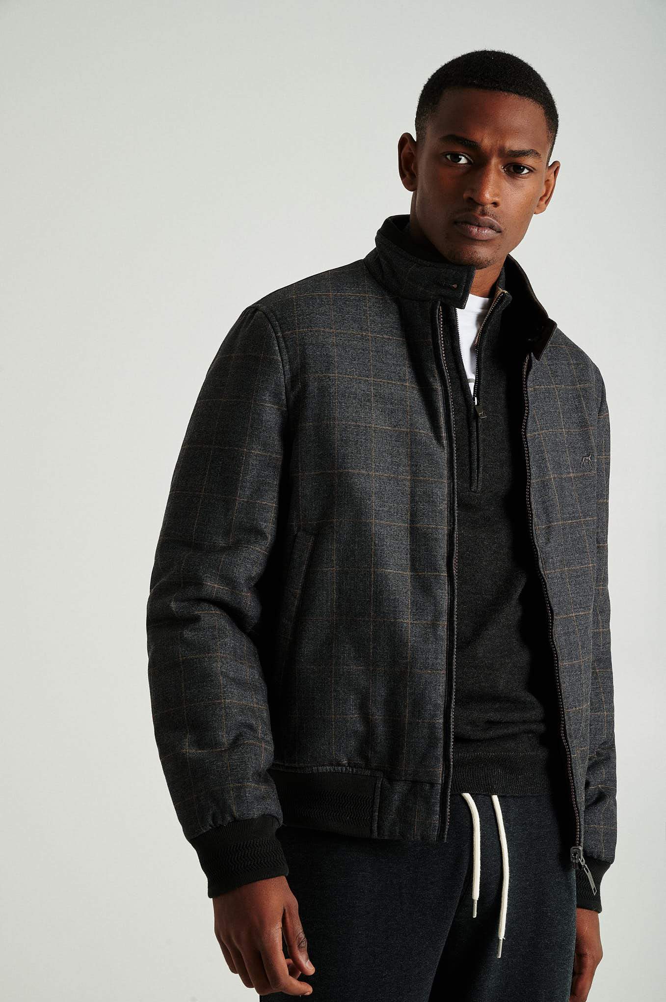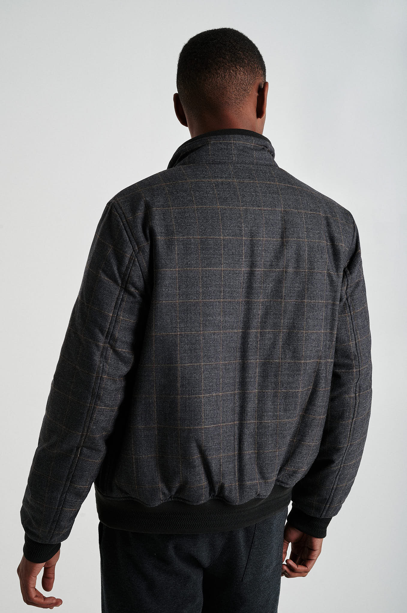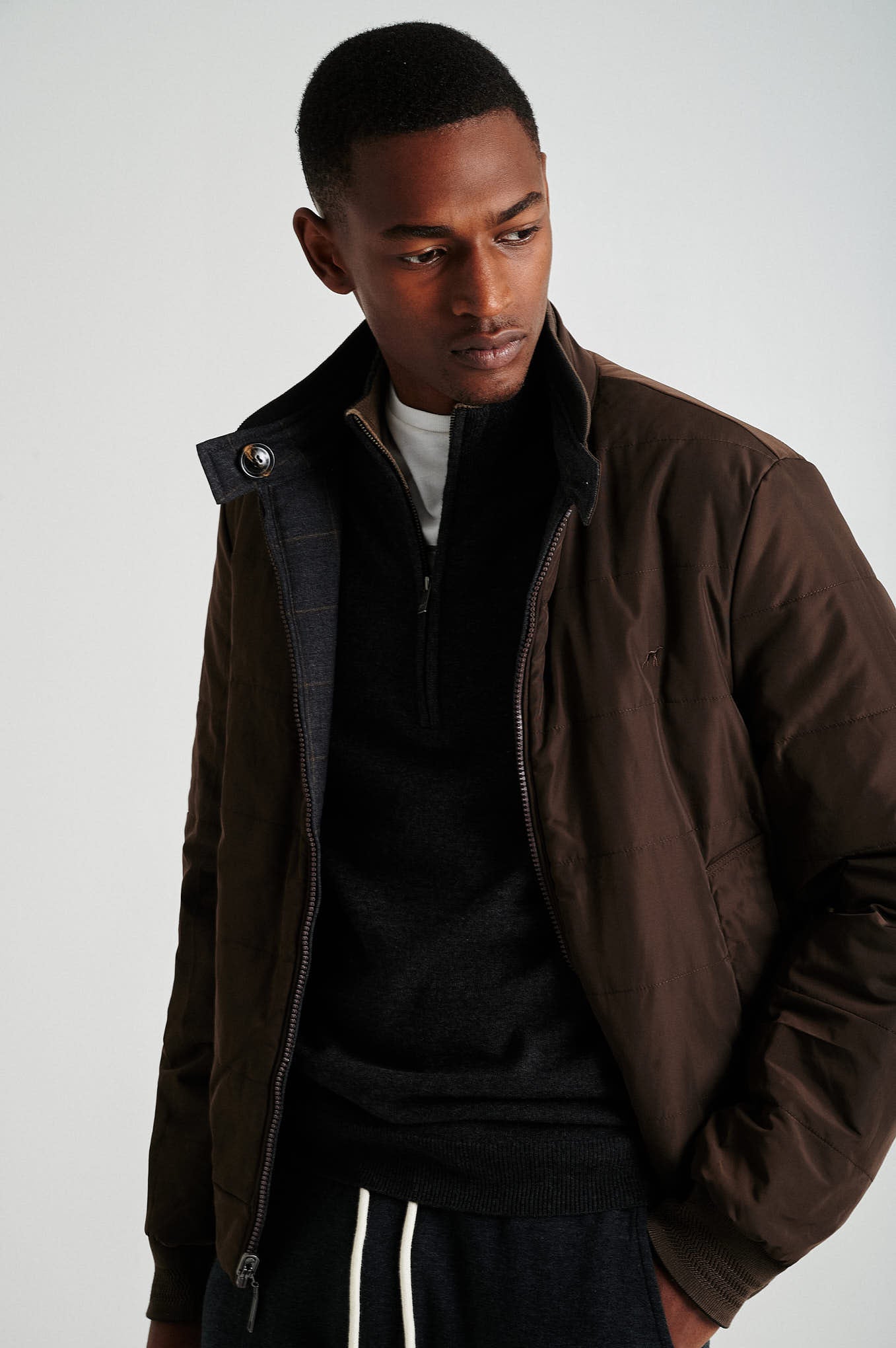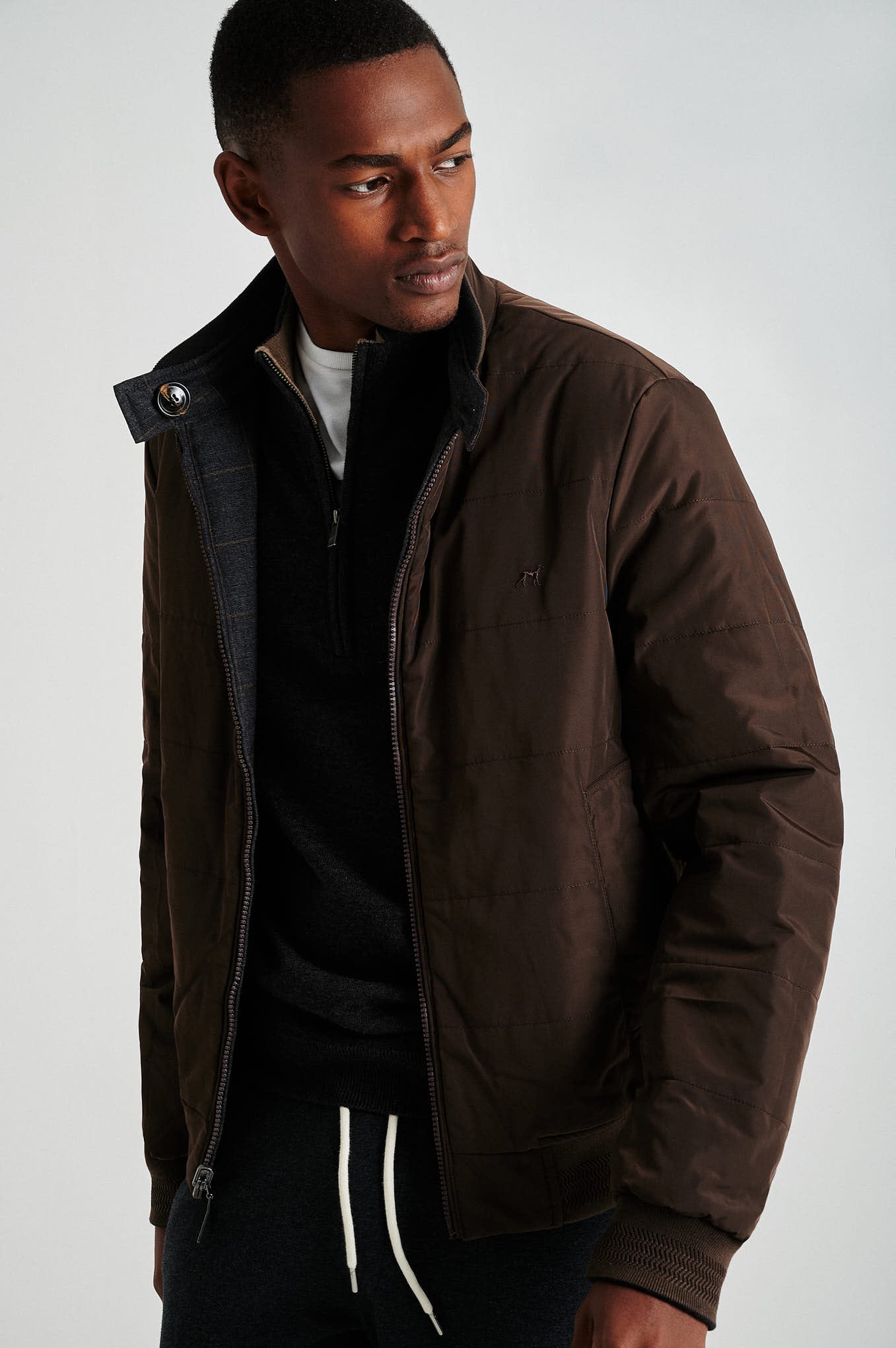 Men's reversible jacket, slightly padded. Outside in tailored woven fabric quality matching with suit, inside in 100% polyester fabric. Logo Sacoor embroidered on chest outside and inside. Raised collar in self fabric with rib details at the top. Bottom and cuffs in rib with different colors outside and inside.