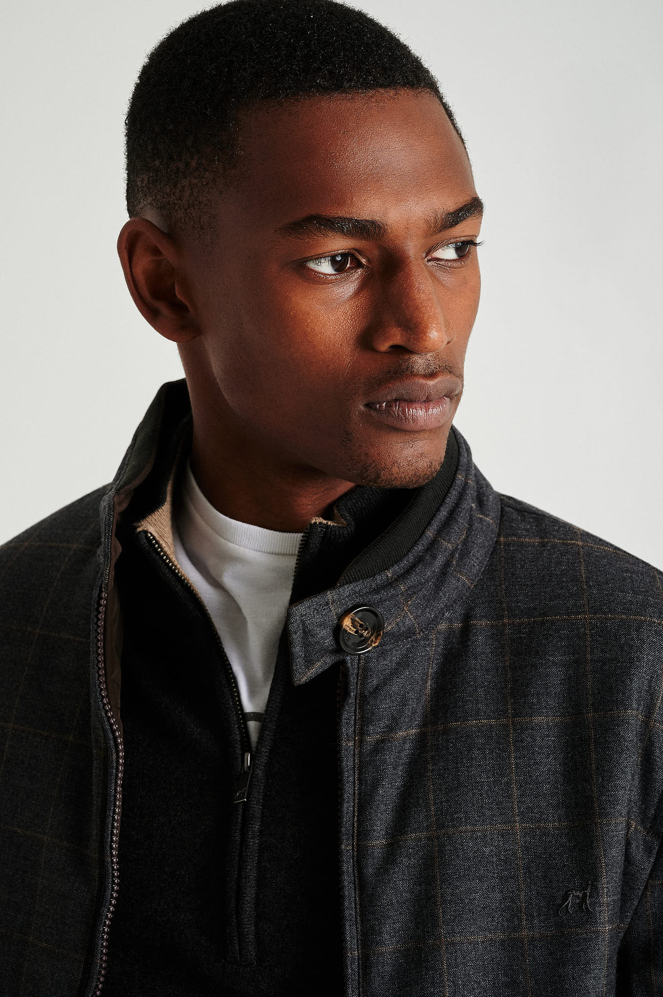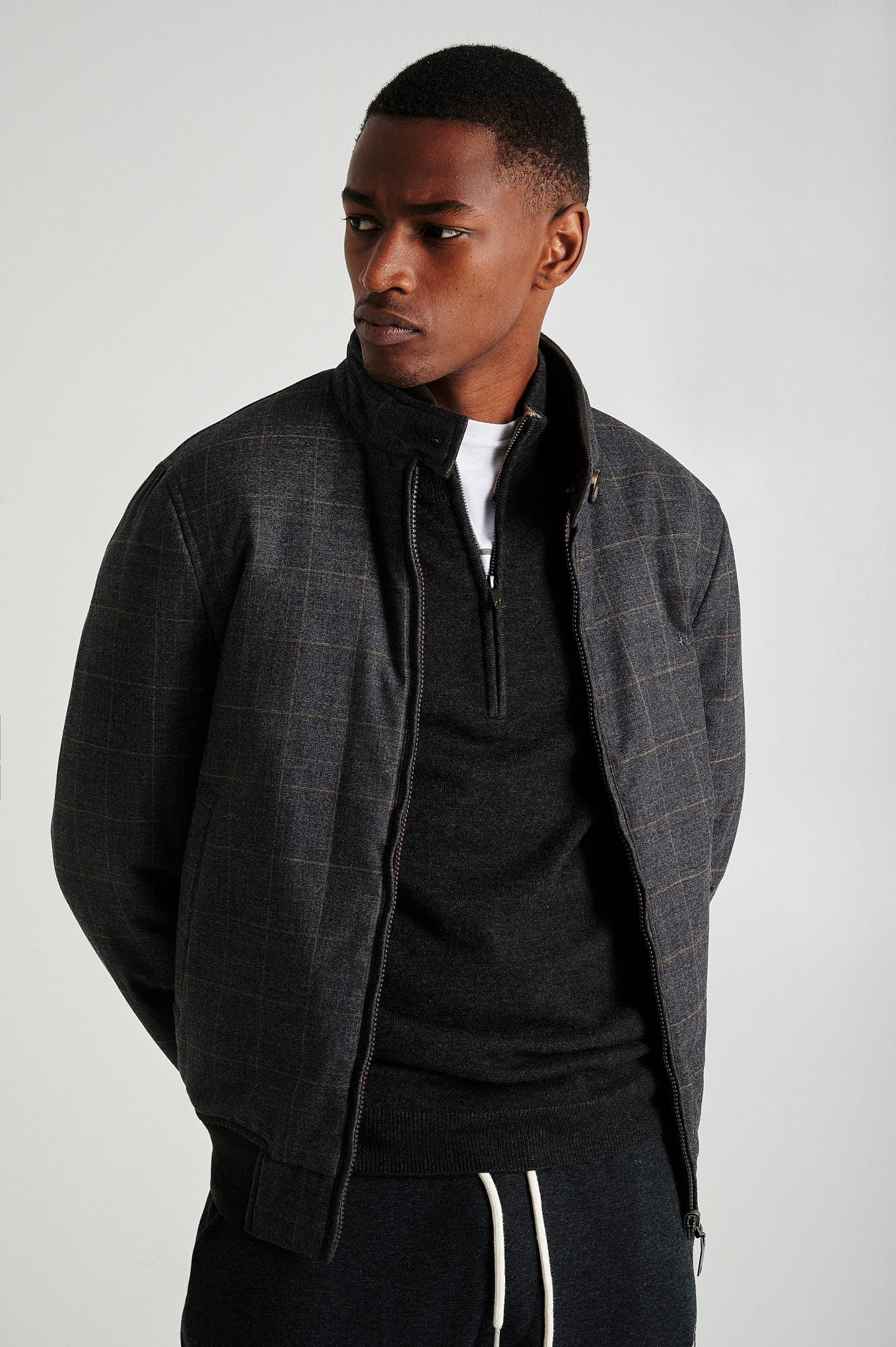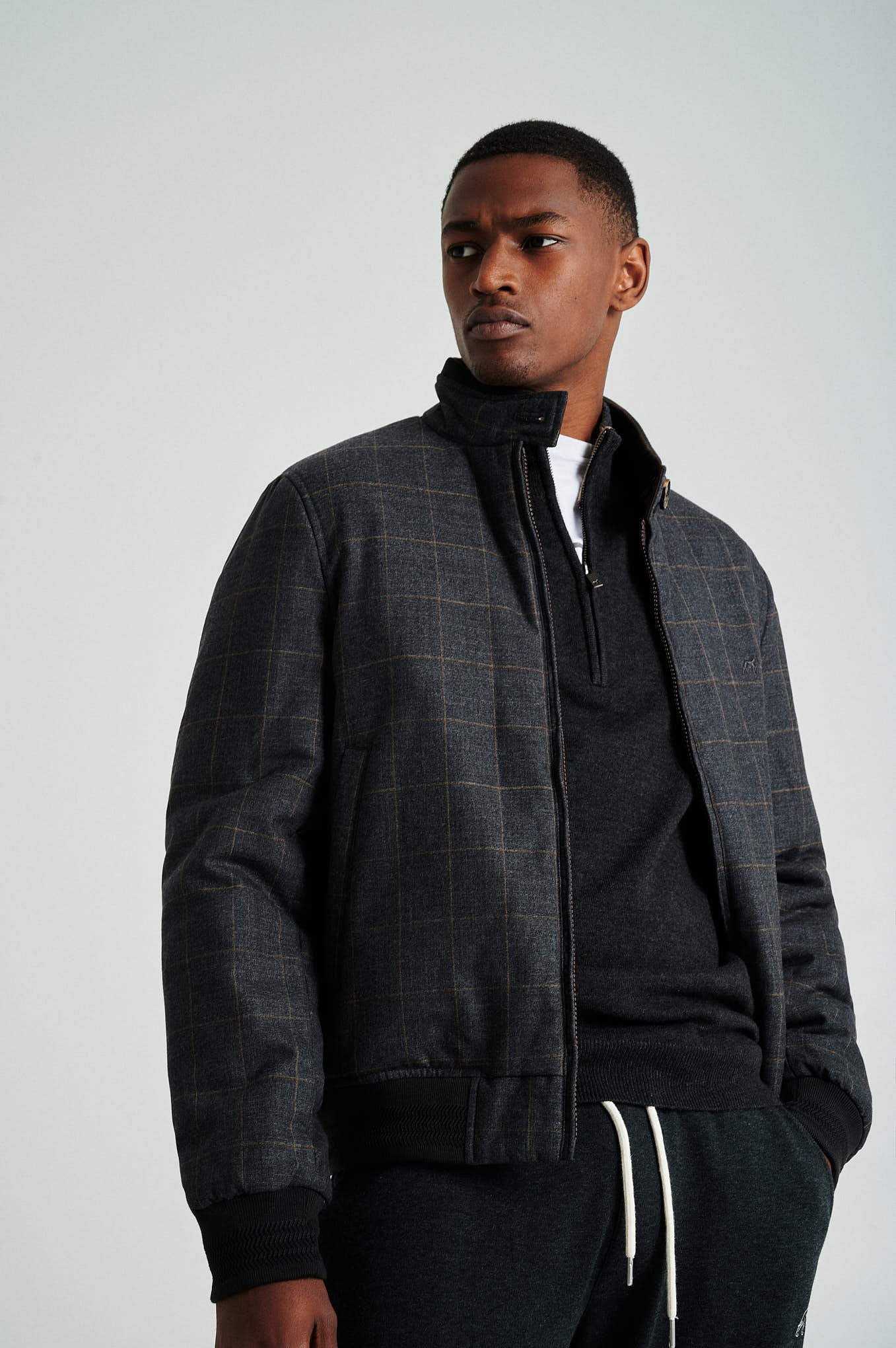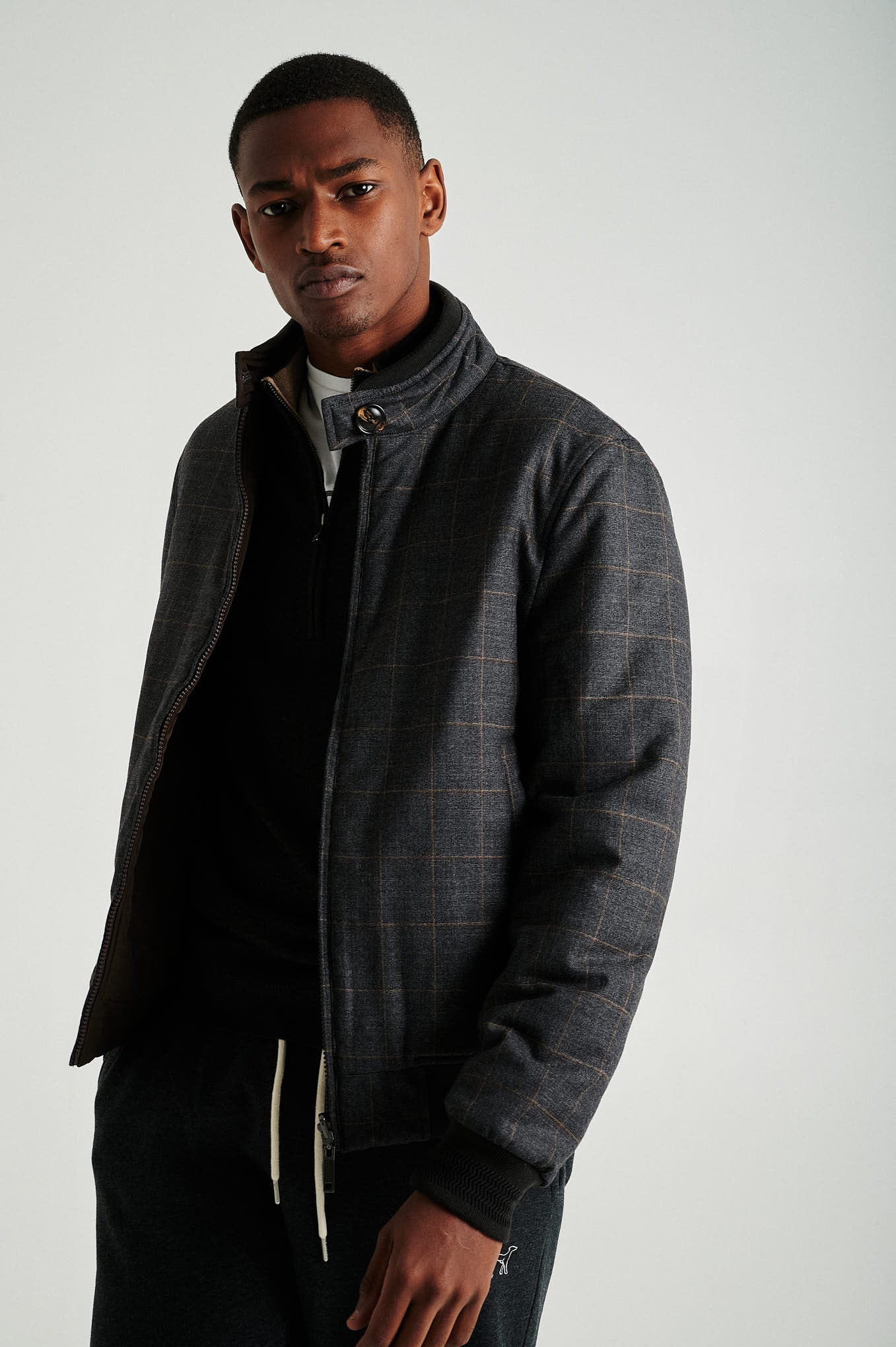Men's reversible jacket, slightly padded. Outside in tailored woven fabric quality matching with suit, inside in 100% polyester fabric. Logo Sacoor embroidered on chest outside and inside. Raised collar in self fabric with rib details at the top. Bottom and cuffs in rib with different colors outside and inside.