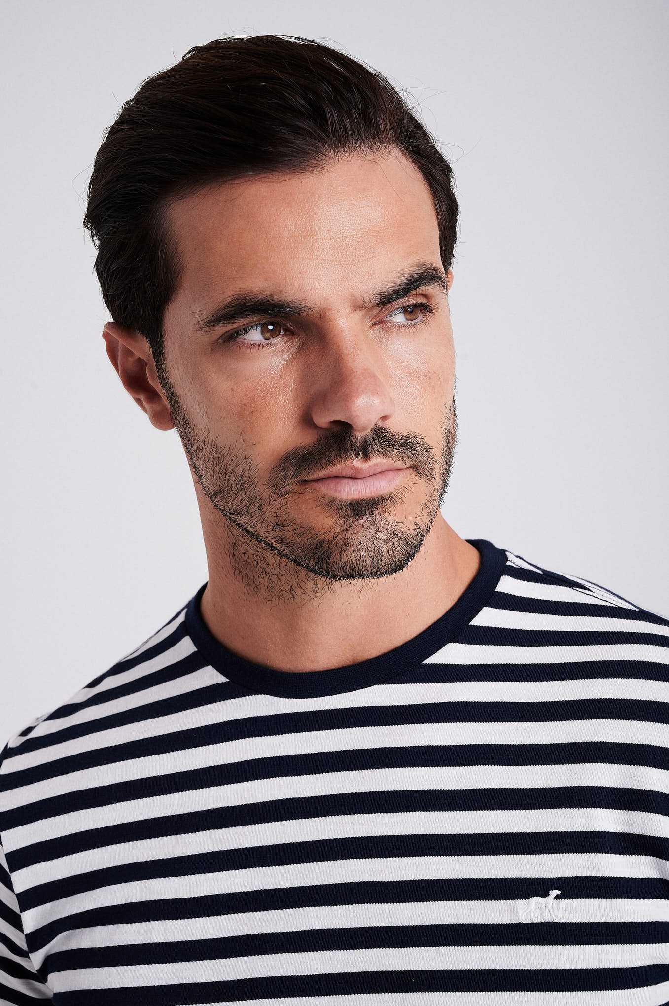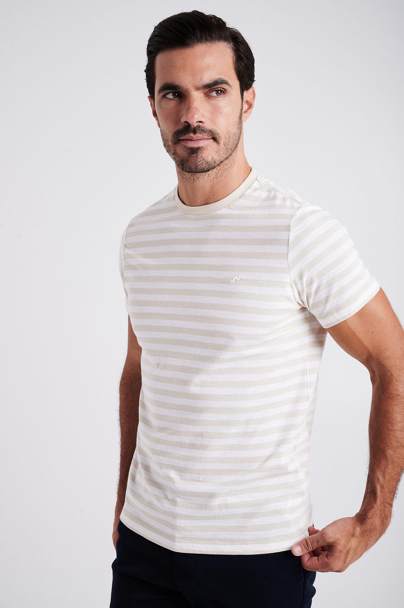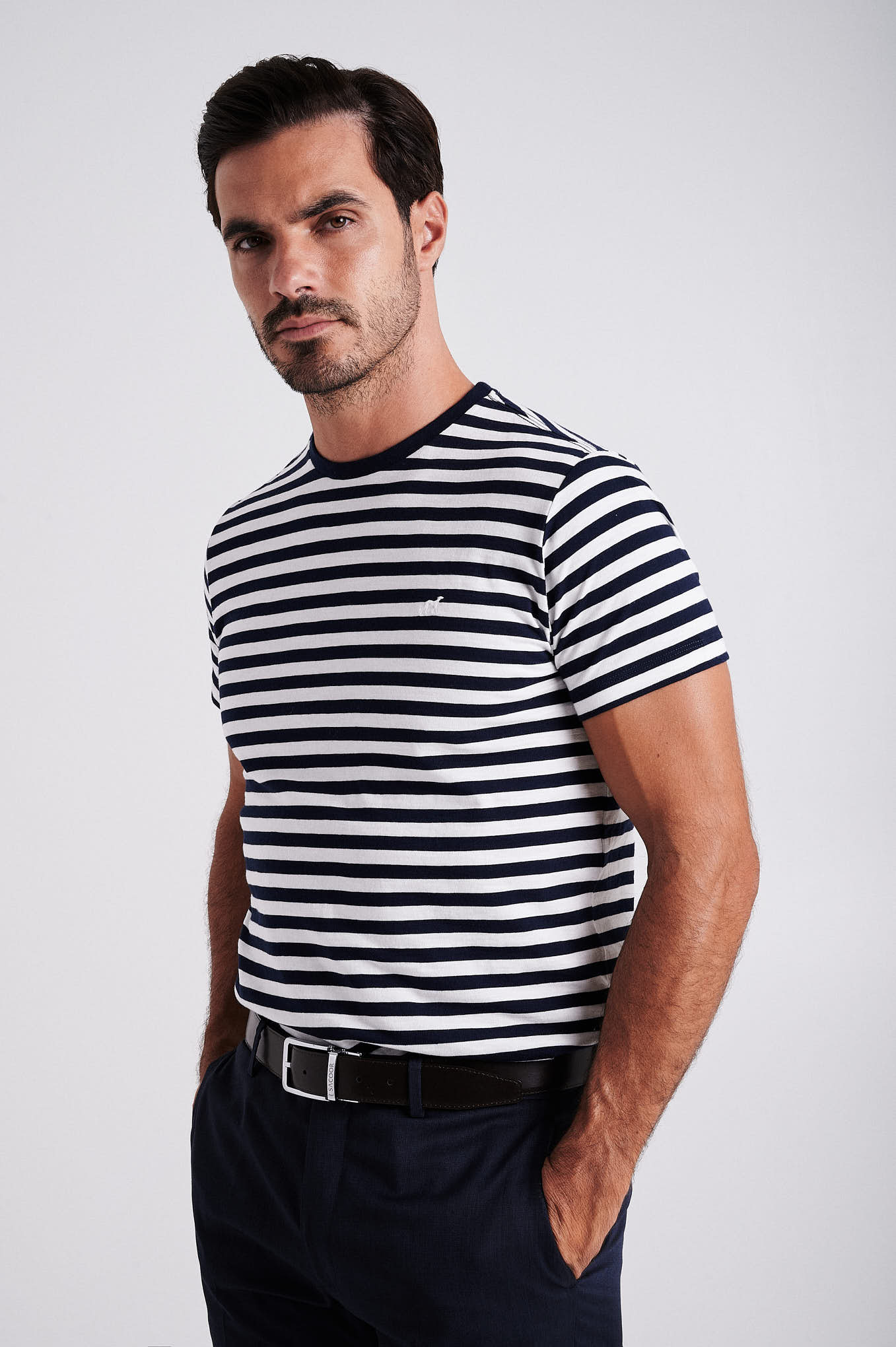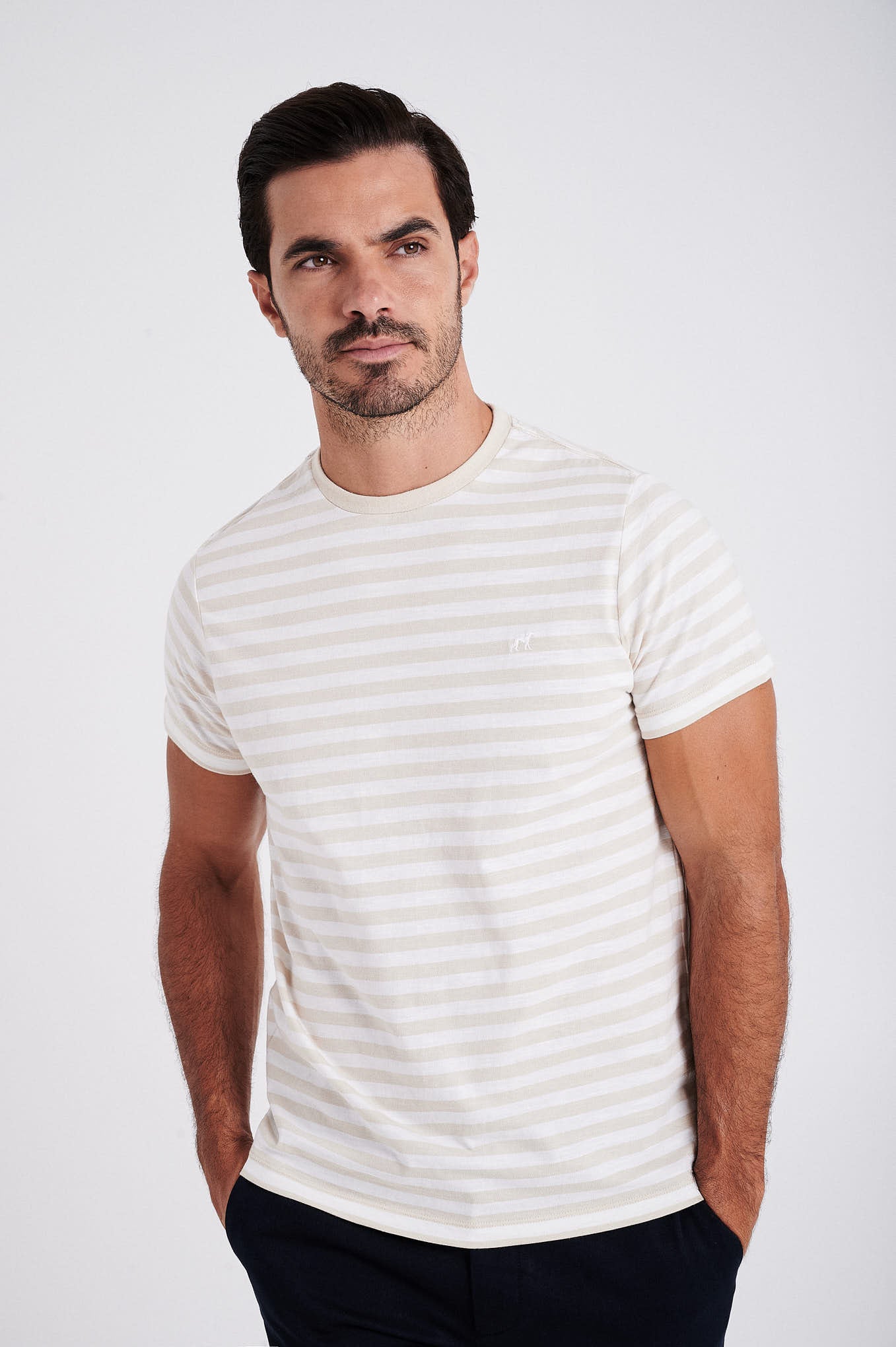 Striped t-shirt with woven label, made from 100% organic cotton jersey. Fitted t-shirt with round ribbed neckline. Short sleeves finished with double-needle hem. Chest embroidery logo matching stripe color.