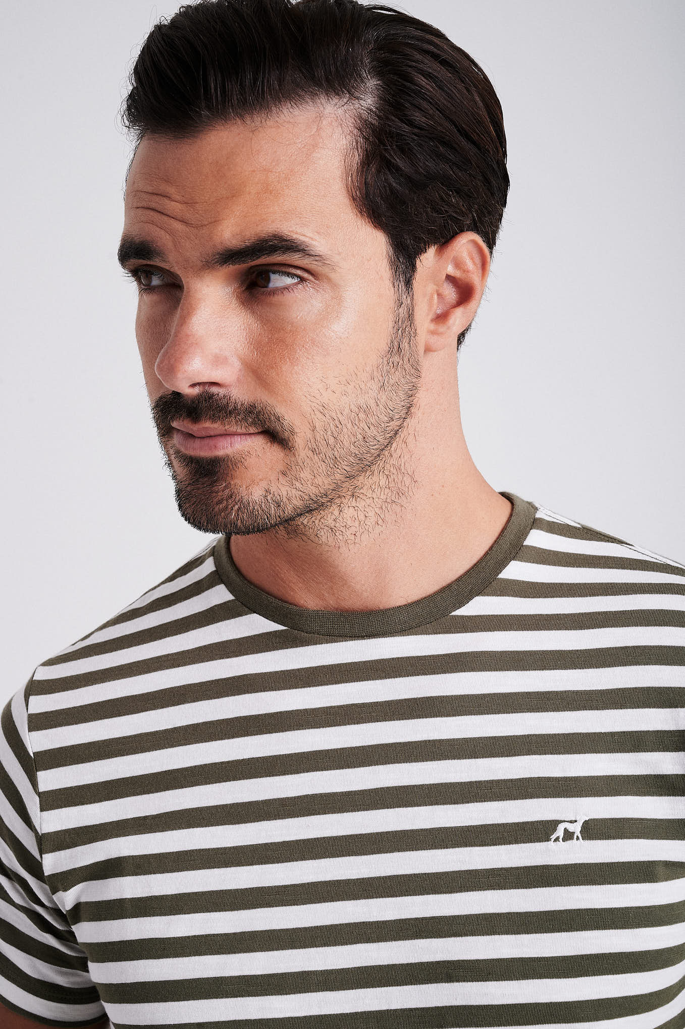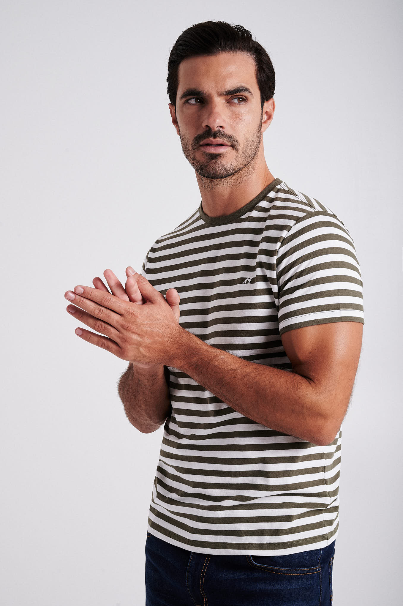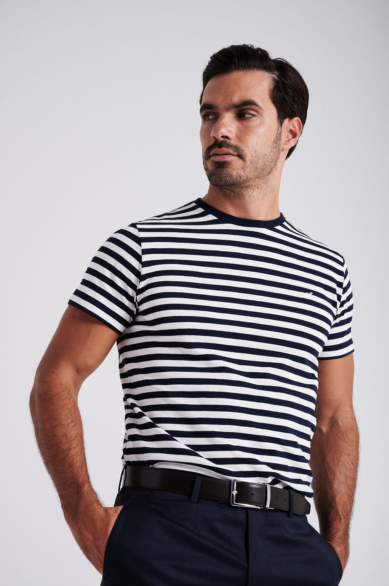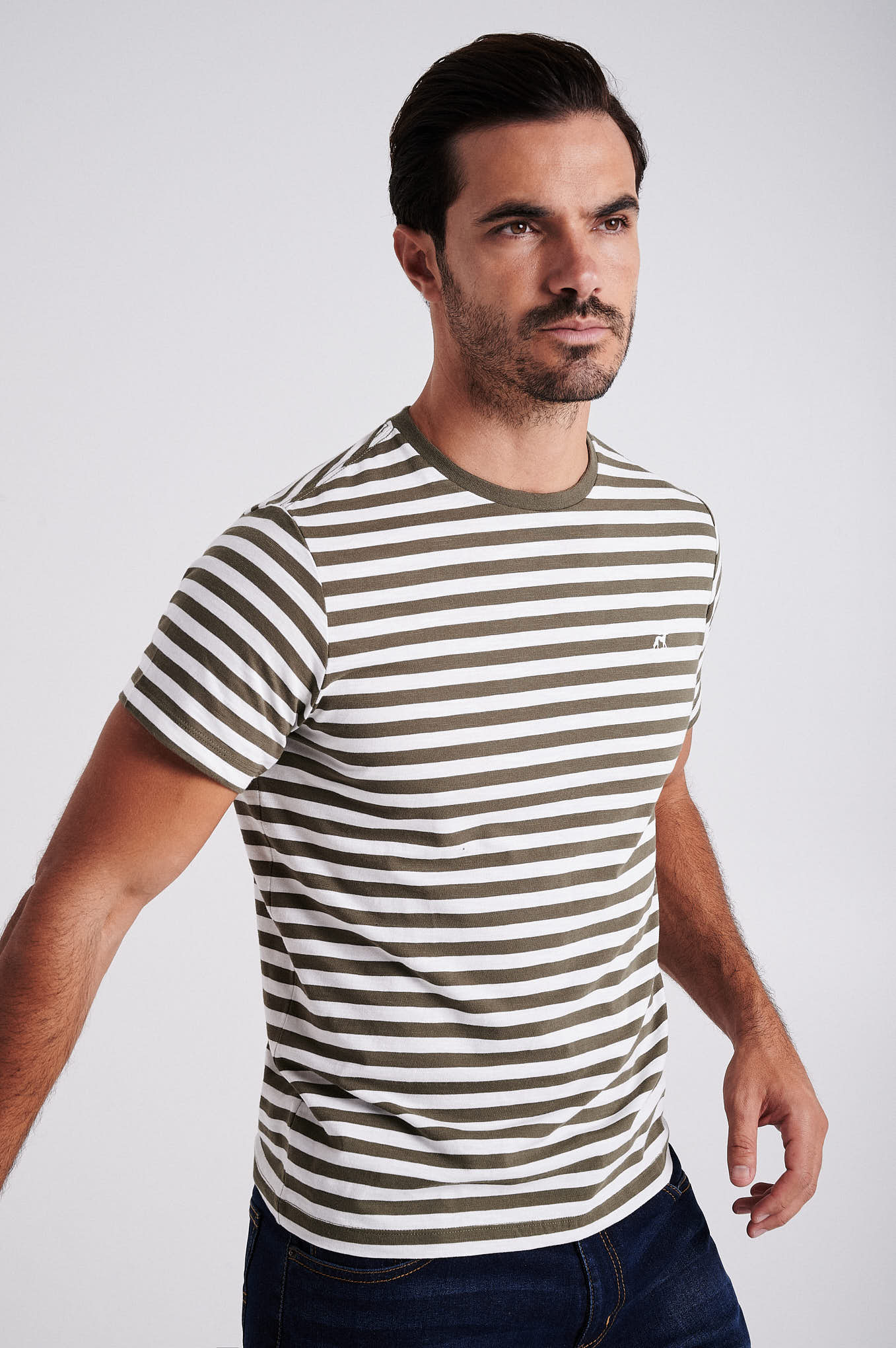 Striped t-shirt with woven label, made from 100% organic cotton jersey. Fitted t-shirt with round ribbed neckline. Short sleeves finished with double-needle hem. Chest embroidery logo matching stripe color.