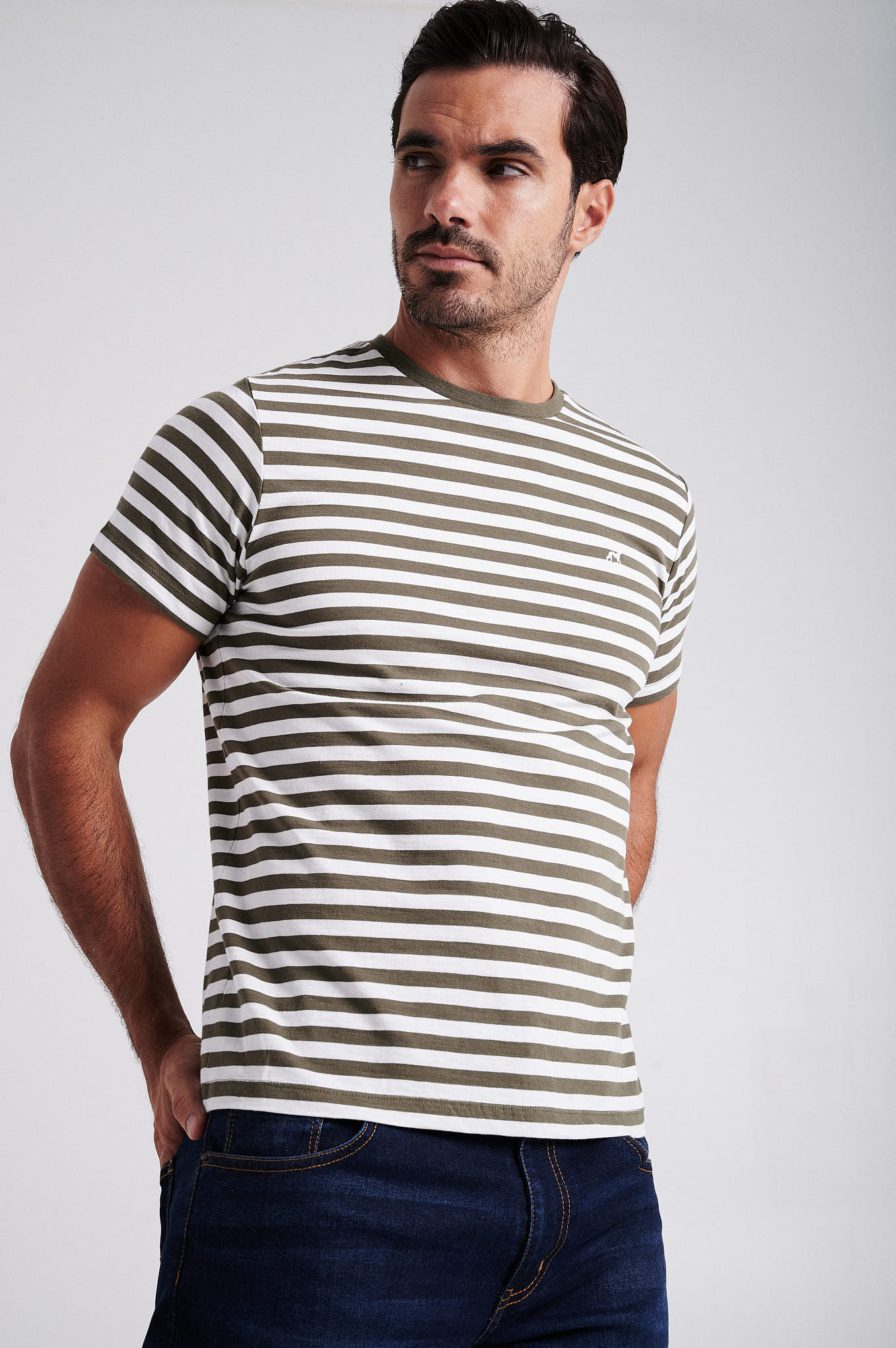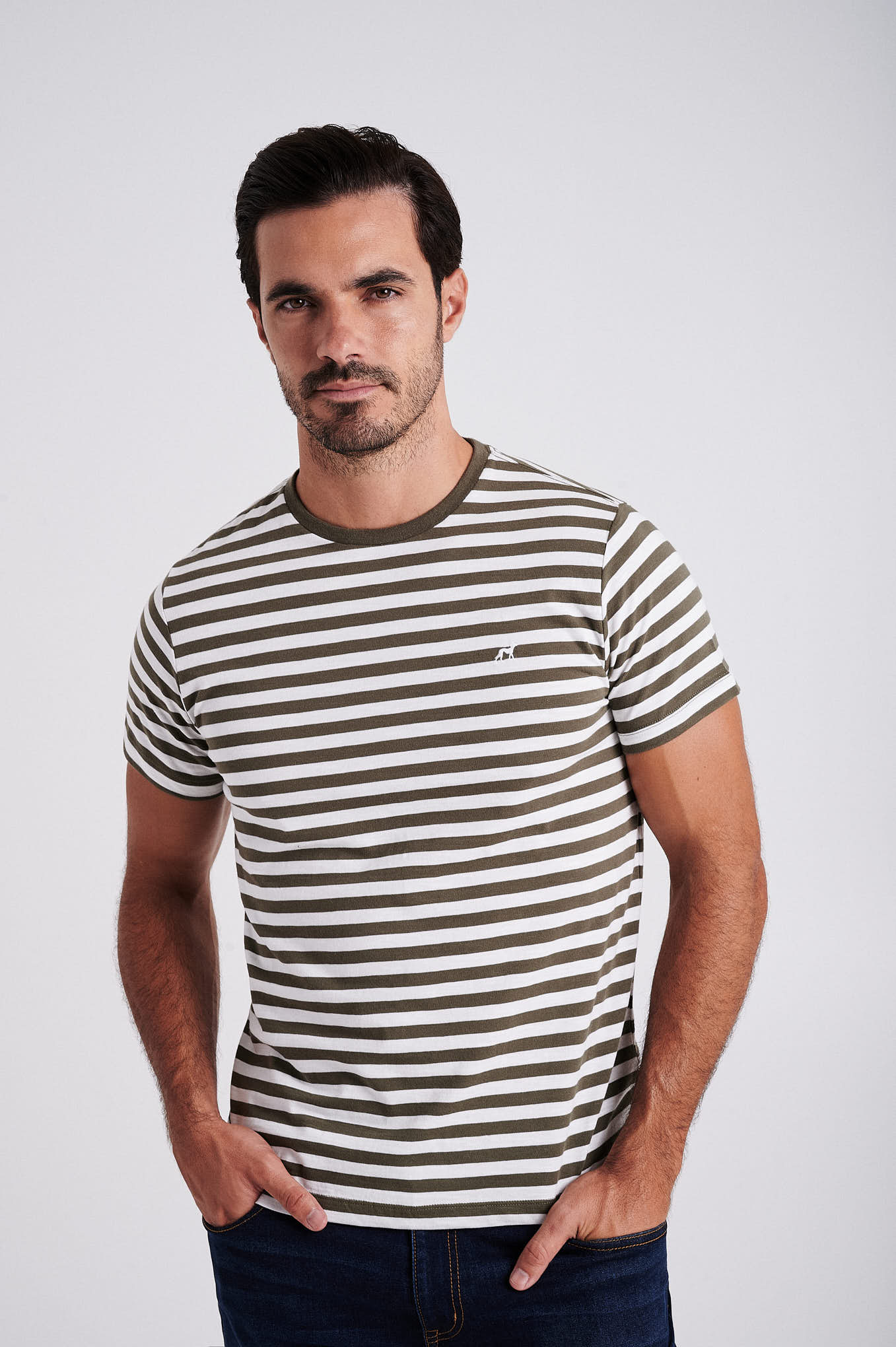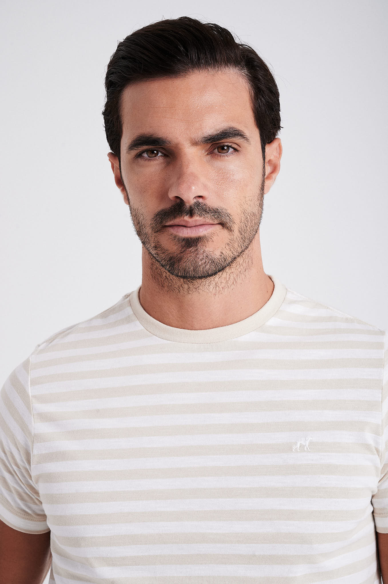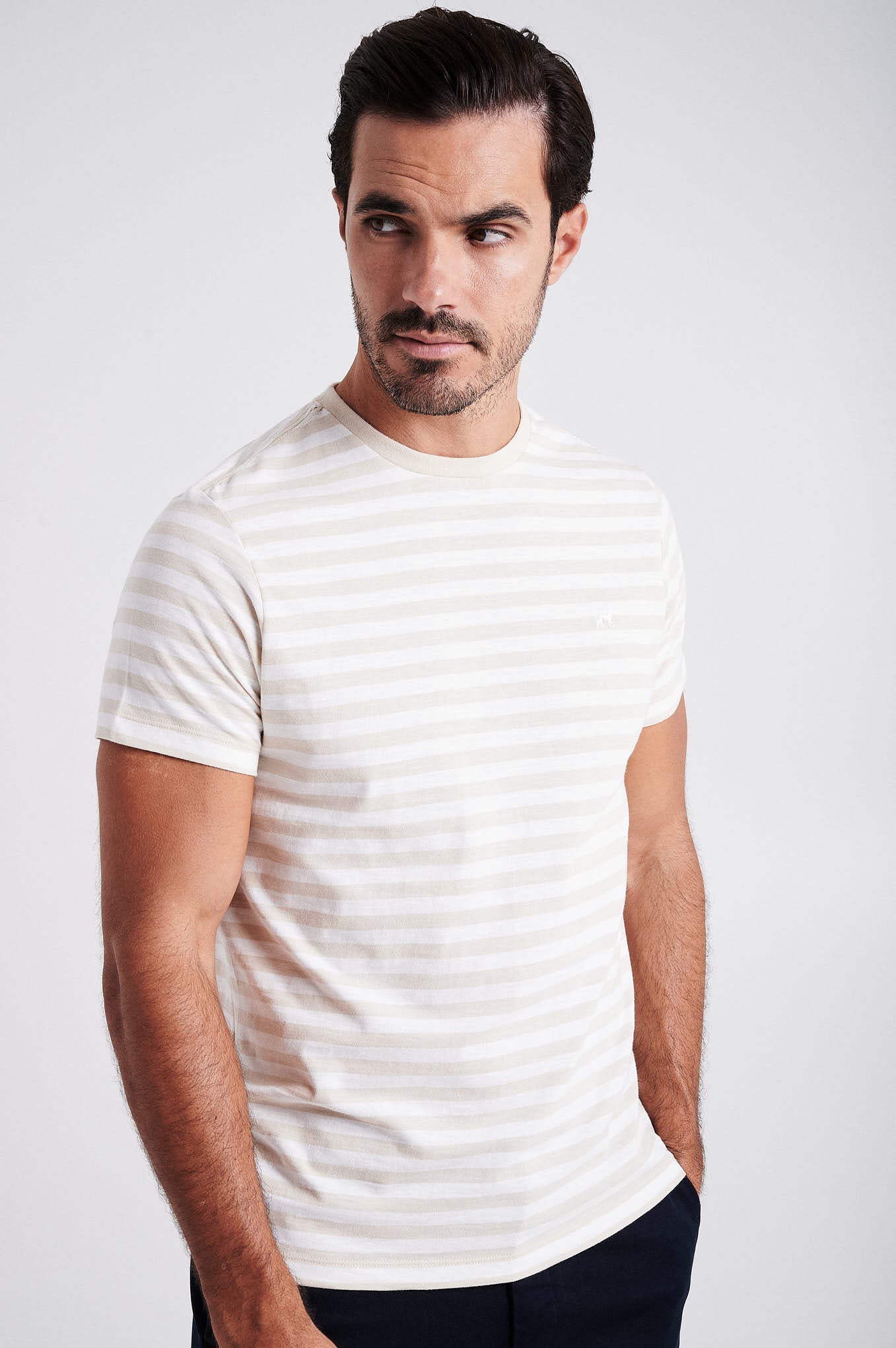 Striped t-shirt with woven label, made from 100% organic cotton jersey. Fitted t-shirt with round ribbed neckline. Short sleeves finished with double-needle hem. Chest embroidery logo matching stripe color.