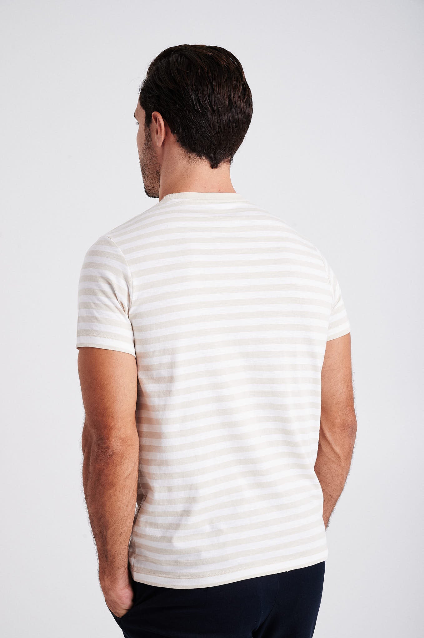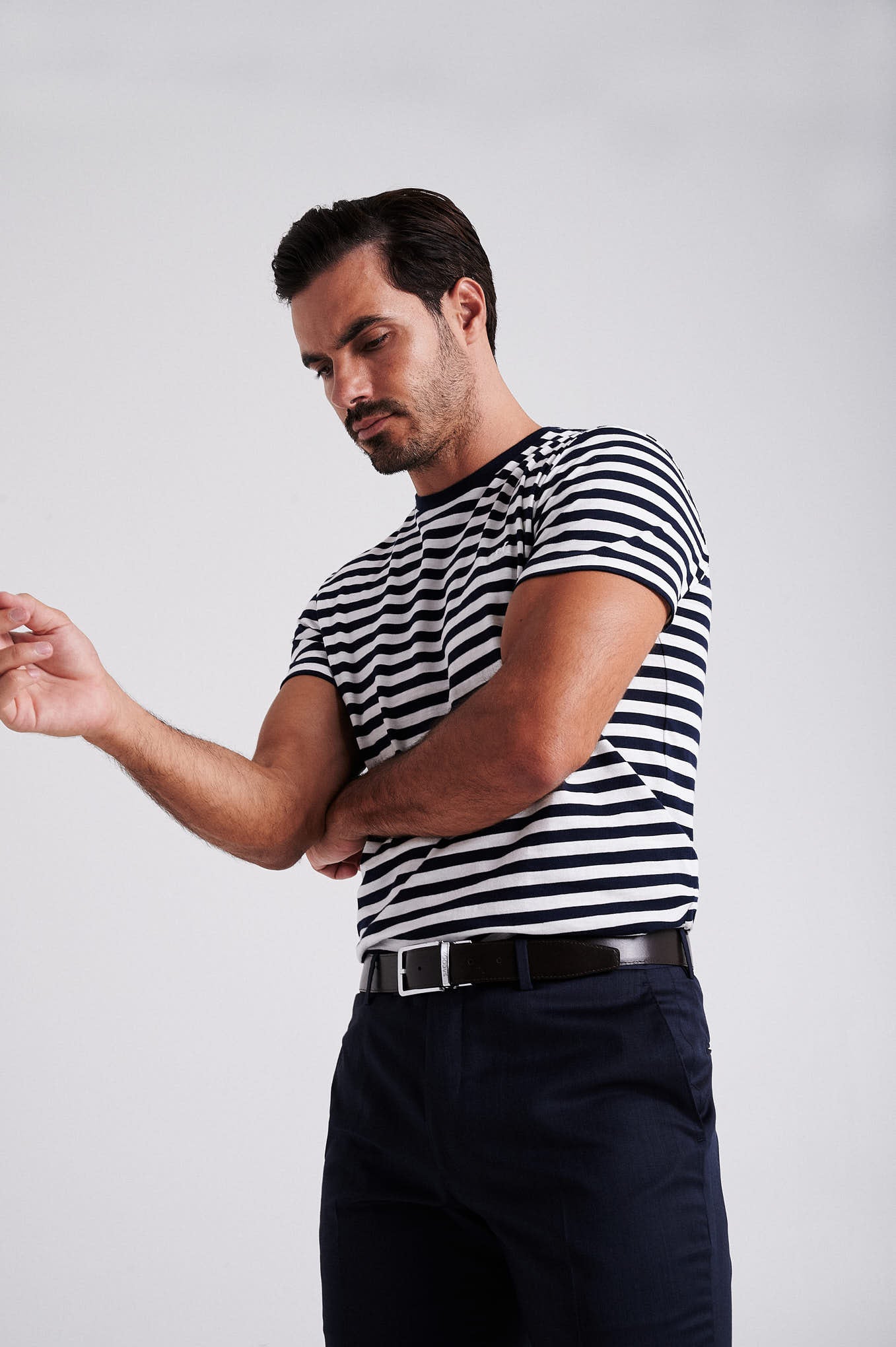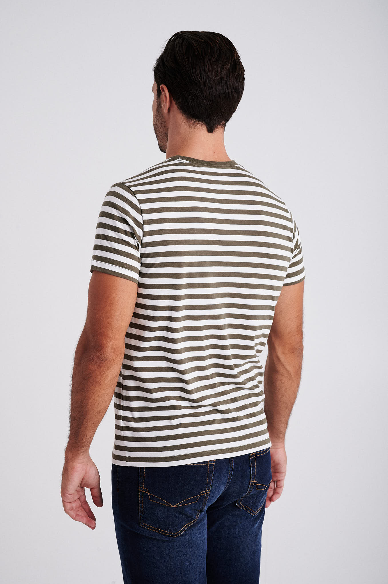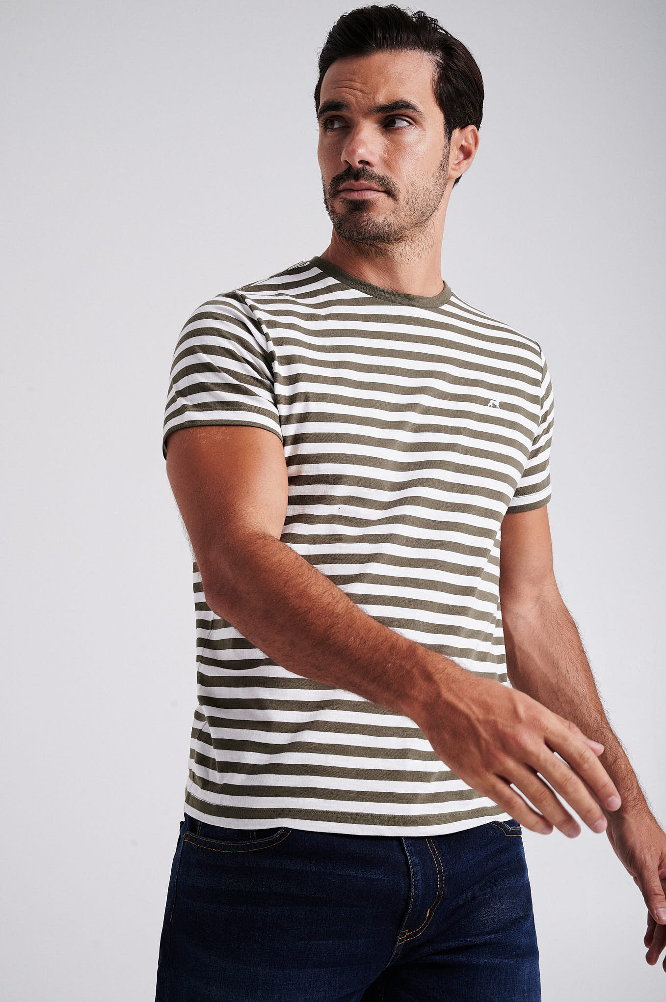 Striped t-shirt with woven label, made from 100% organic cotton jersey. Fitted t-shirt with round ribbed neckline. Short sleeves finished with double-needle hem. Chest embroidery logo matching stripe color.