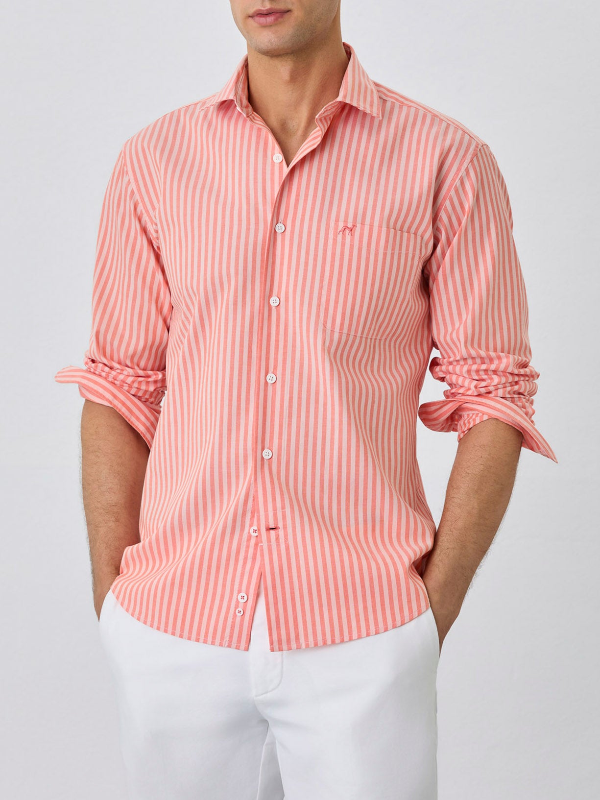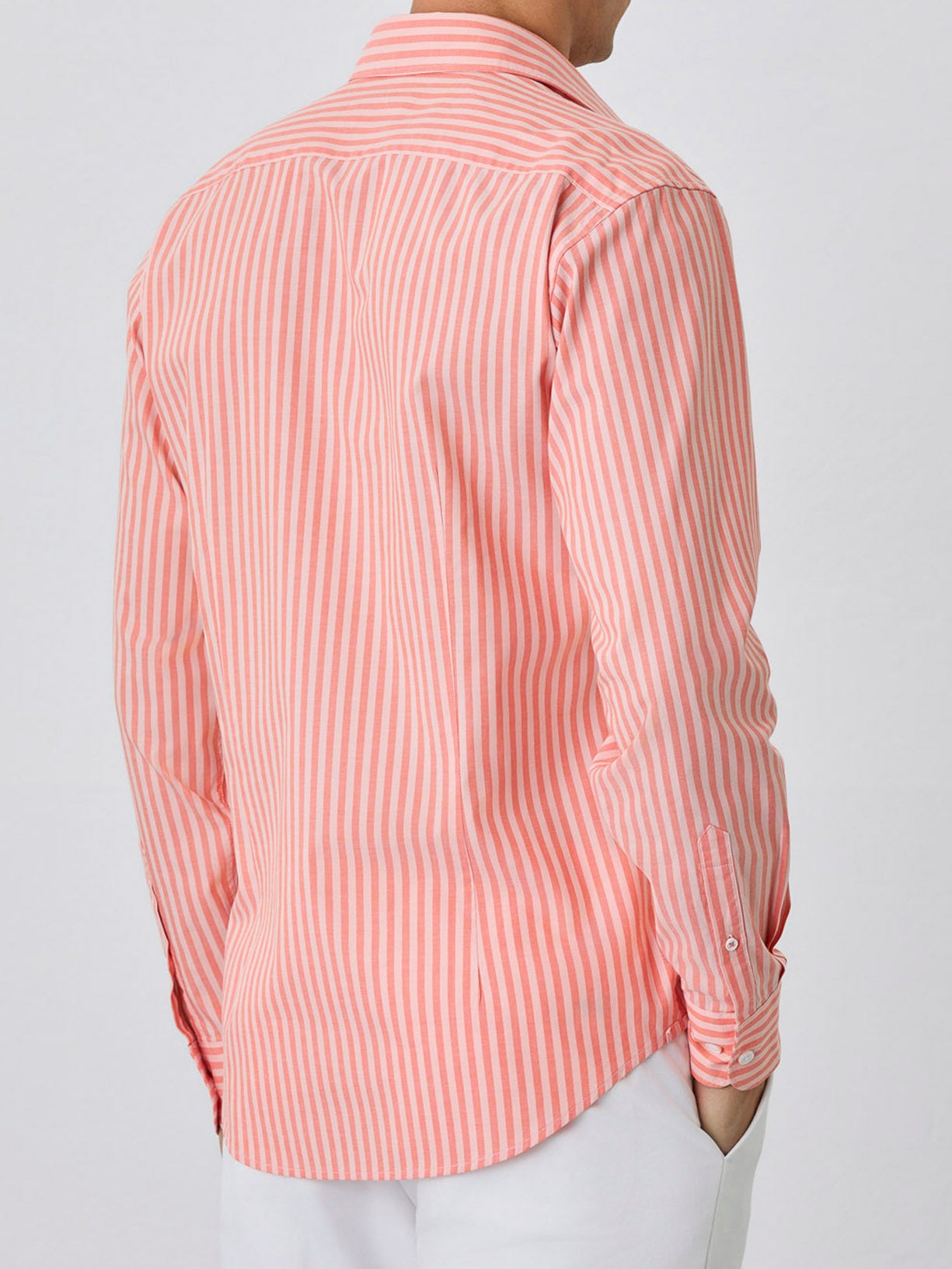 'Respekt' sport shirt made of 100% BCI cotton oxford stripes. Featuring slim fit, open spread collar and front button-up fastening. Long sleeves with single cuffs with 2 buttons and flag label. Chest pocket with logo embroidery. 'Better Cotton Initiative' - this garment is made with the most ecological cotton: it's production sustains the health of soils, ecosystems and people by using natural processes rather than artificial inputs.