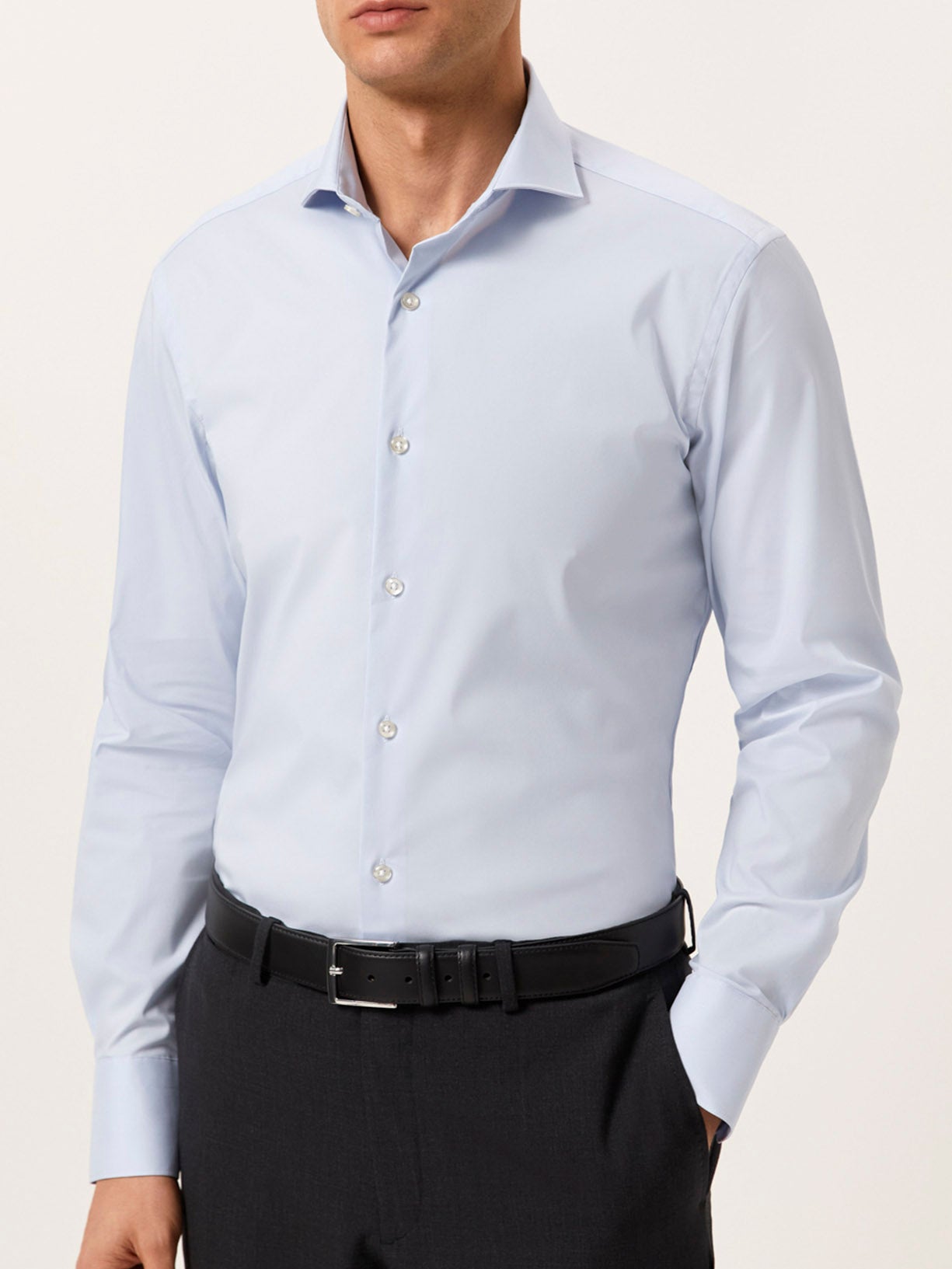 A refined piece that offers lasting elegance and easy versatility. Made from a comfort cotton poplin blend with polyester and spandex, this Travel line shirt ensures perfect comfort, an excellent fit, and top-performance yarns for elasticity, breathability, and a subtle shine. Designed in a regular fit, it features an Oxford collar, front button-up fastening, long sleeves with single cuffs and two buttons, a chest pocket, and side gussets in the same fabric. This shirt is perfect for office wear and any occasion where a sharp look matters. Shirts for every occasion — once you try it, you won’t want to wear anything else.