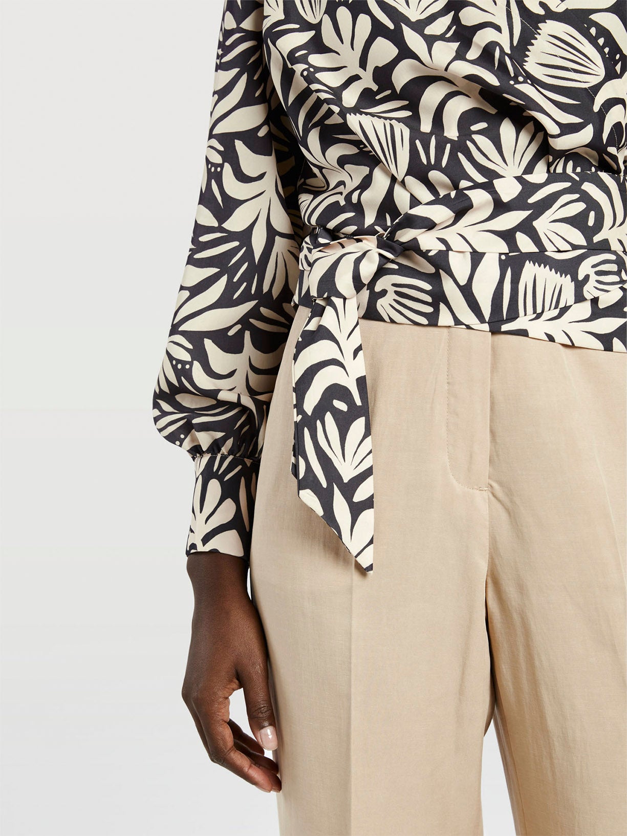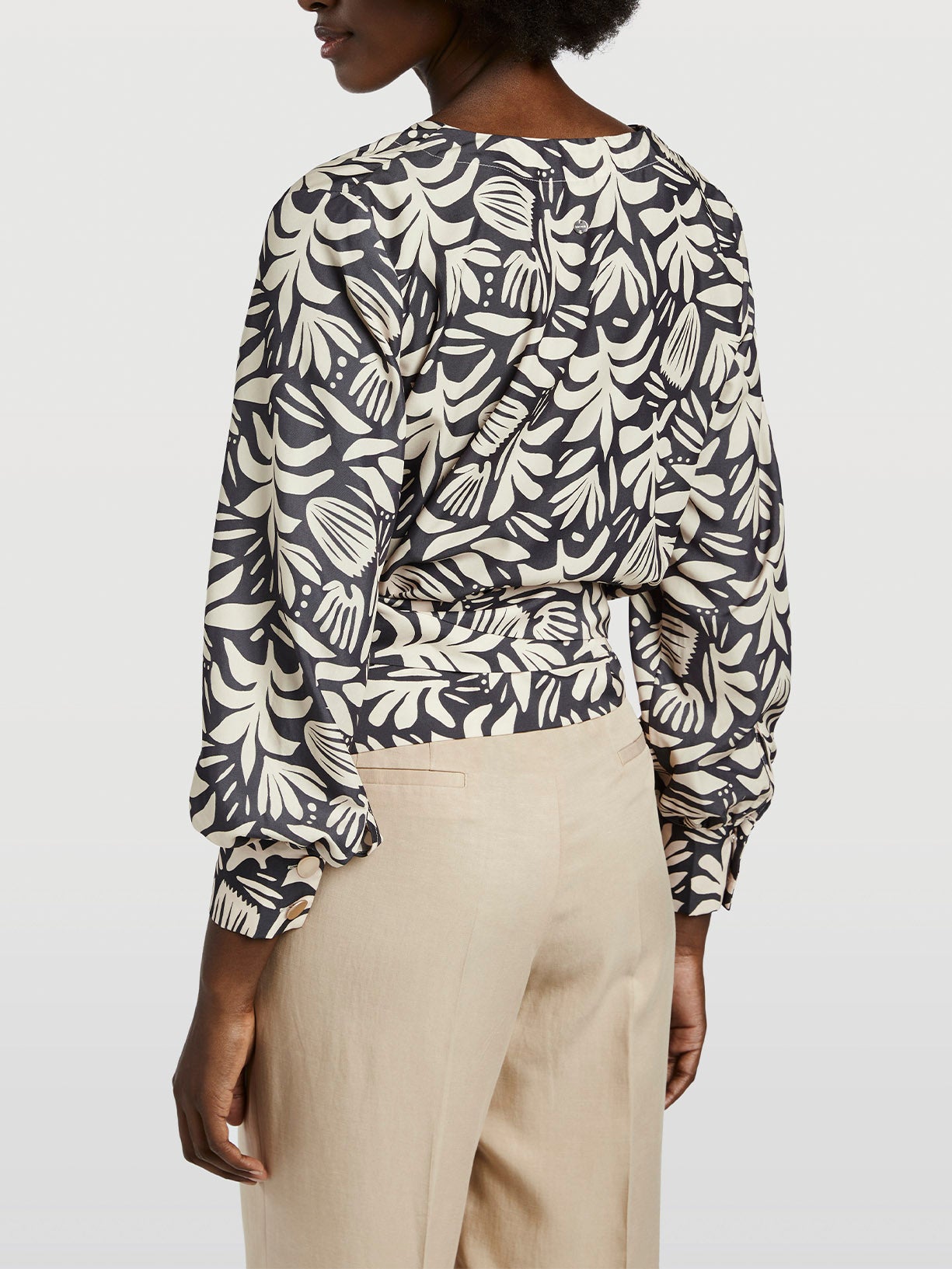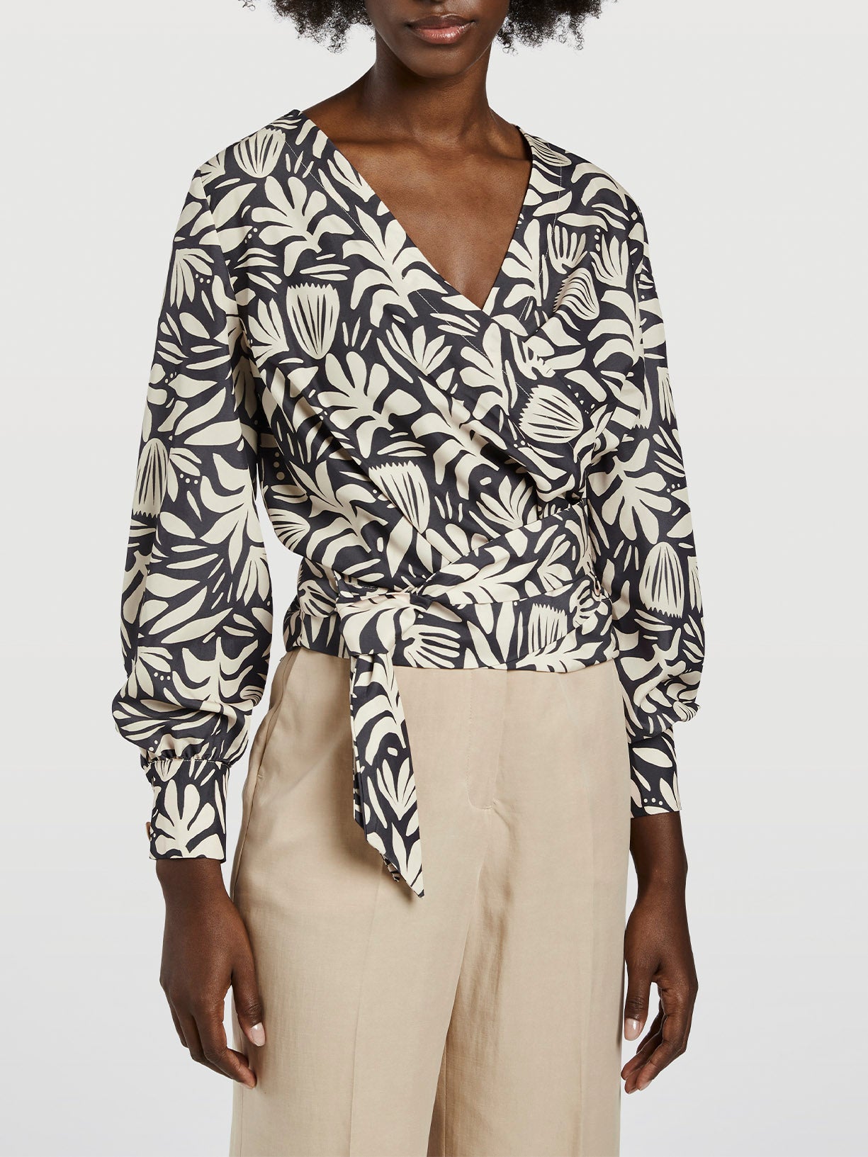 Printed asymmetric crisscross blouse. Features V neckline, closure through inside button and a long tip that passes on a side fabric hanger and 3/4 sleeves with two-buttons cuffs.