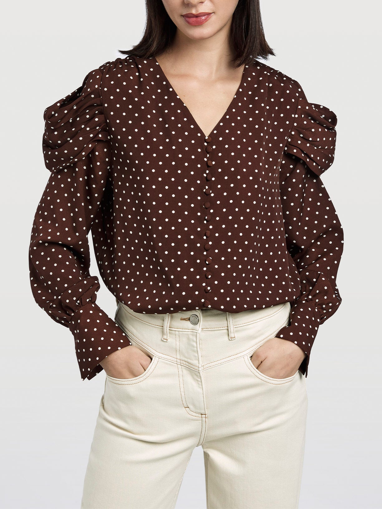 Fluid blouse made with polka dot printed fabric. Features V-neckline. Front opening trough inner placket with self-fabric covered buttons, voluminous long sleeves with a gathered strap in the armhole and self-fabric covered button cuffs.