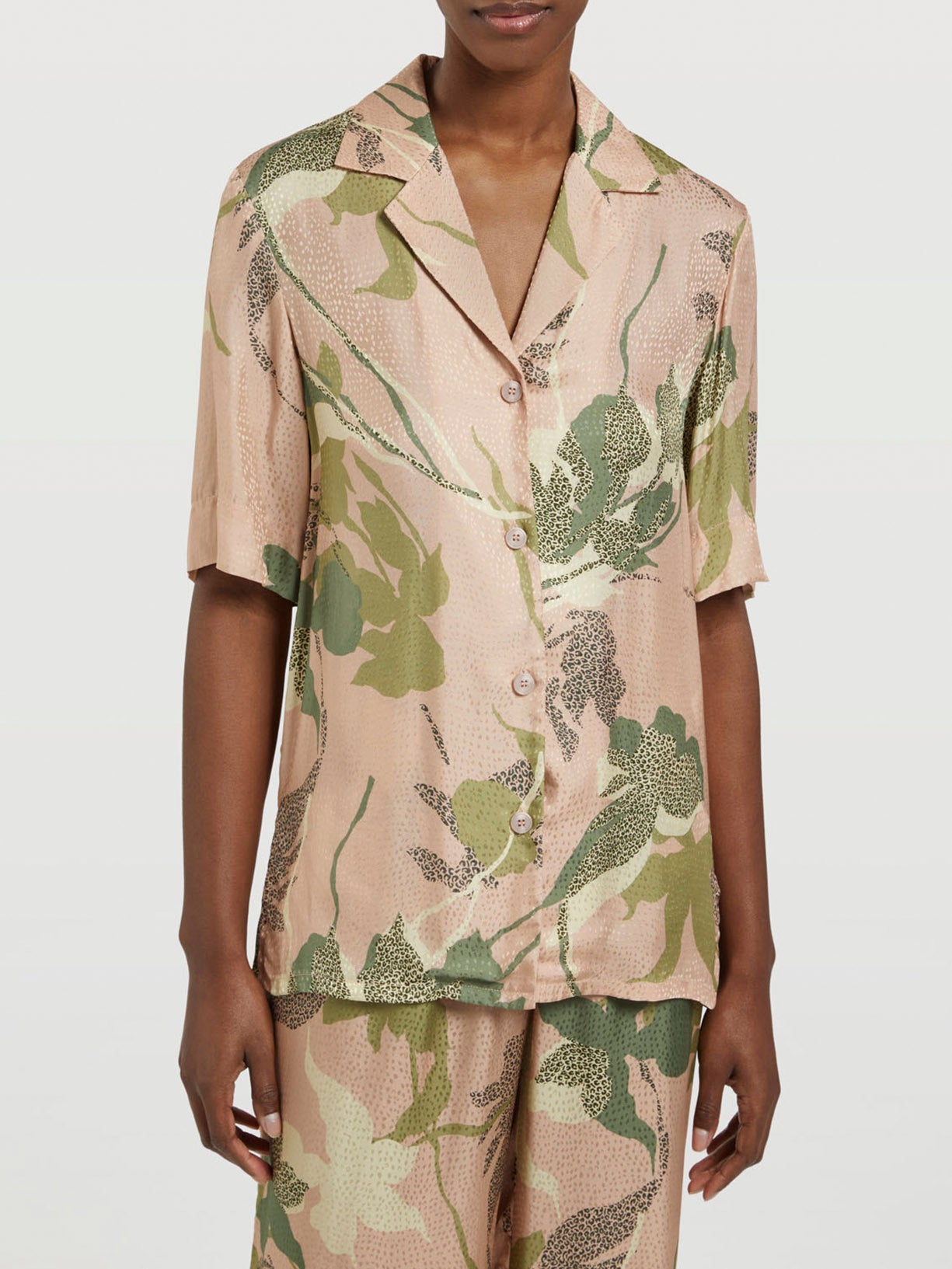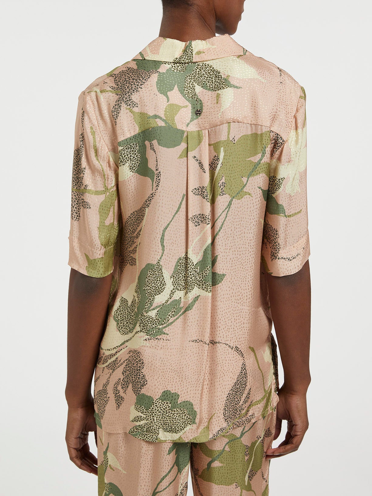 Regular fit flower print blouse made from 100% viscose with textured jacquard fabric. Features a lapel collar and short sleeves. Brand metal plate at the front.