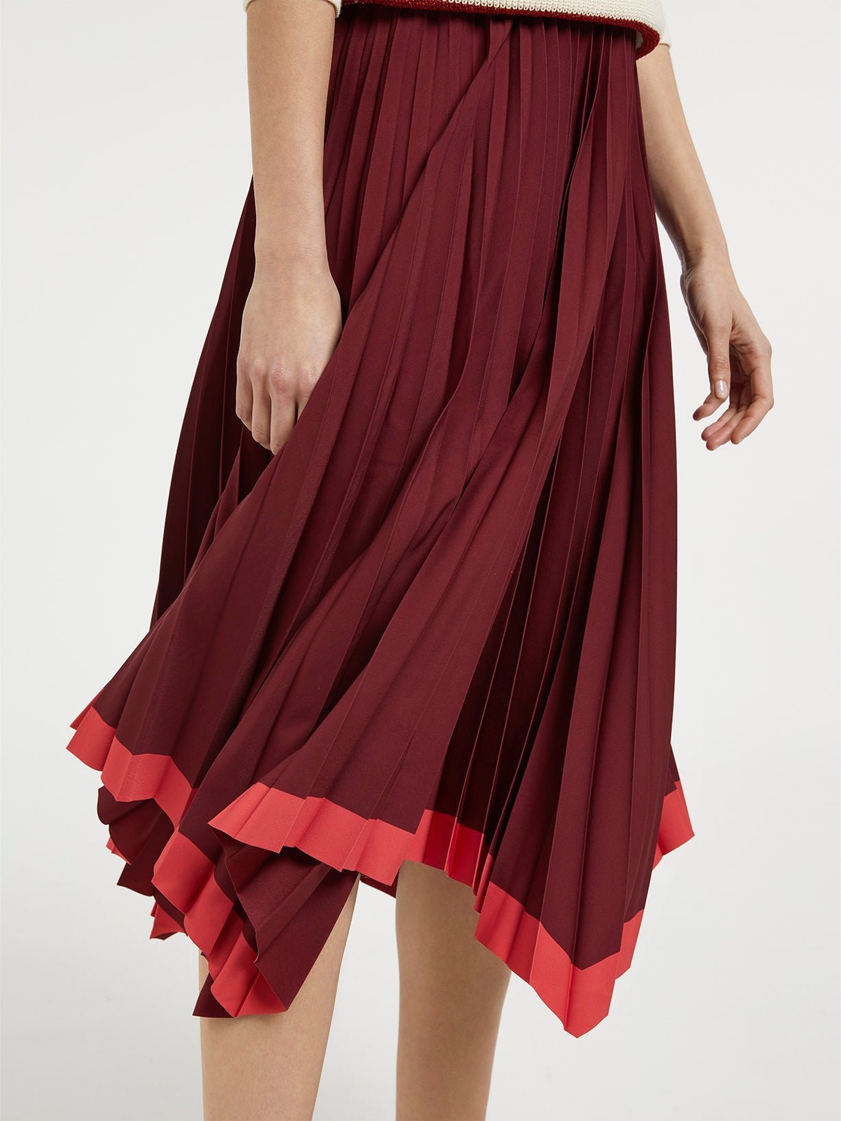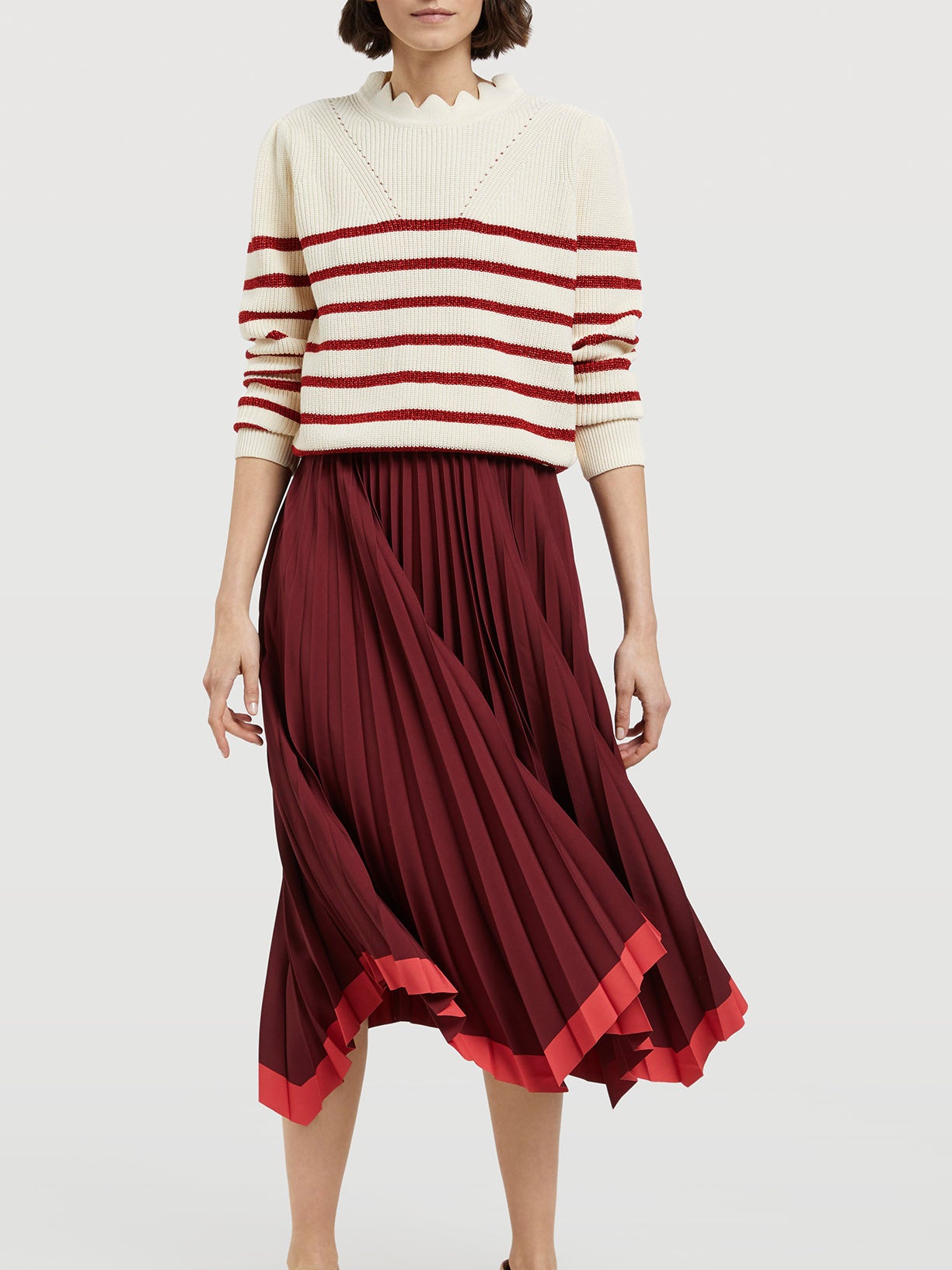 Midi length skirt with soleil pleating and elastic waistband. Features asymmetrical shape hemline with printed stripe at the bottom. Brand metal plate at the front.
