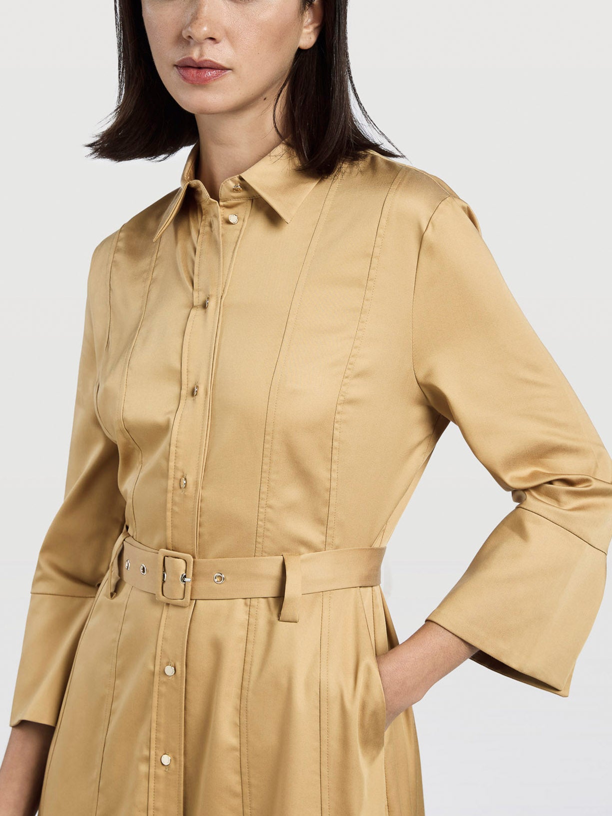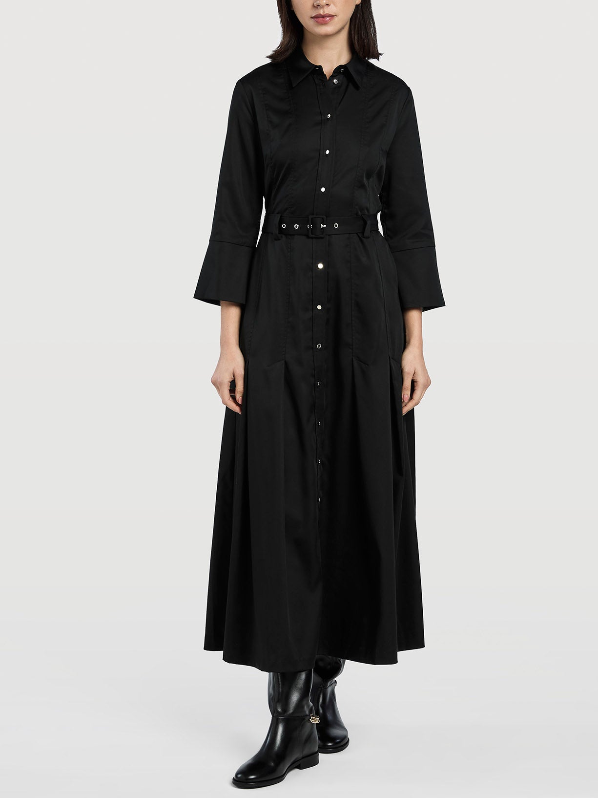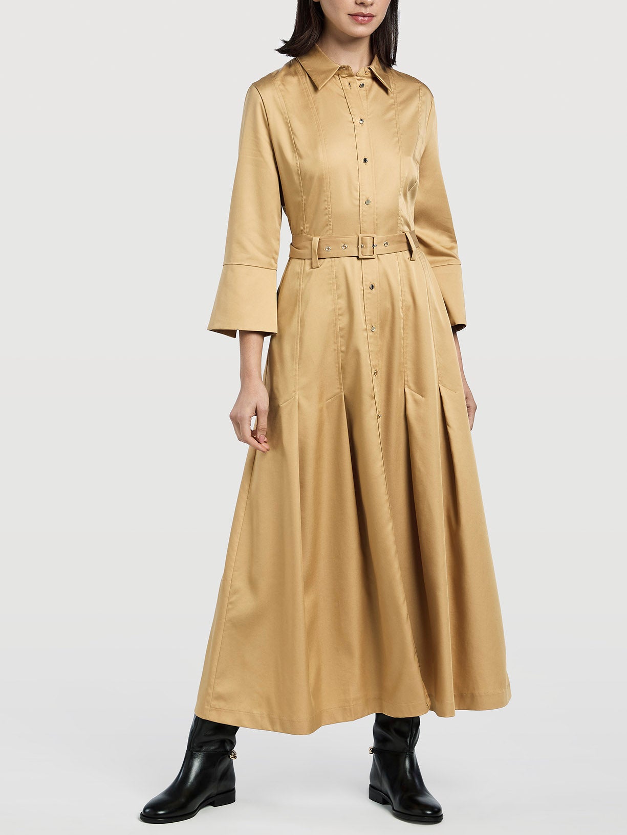 Long dress with pleats details. Features self-fabric belt, front placket with buttons, small collar and knife pockets. Slightly flared 3/4 sleeves with side opening.