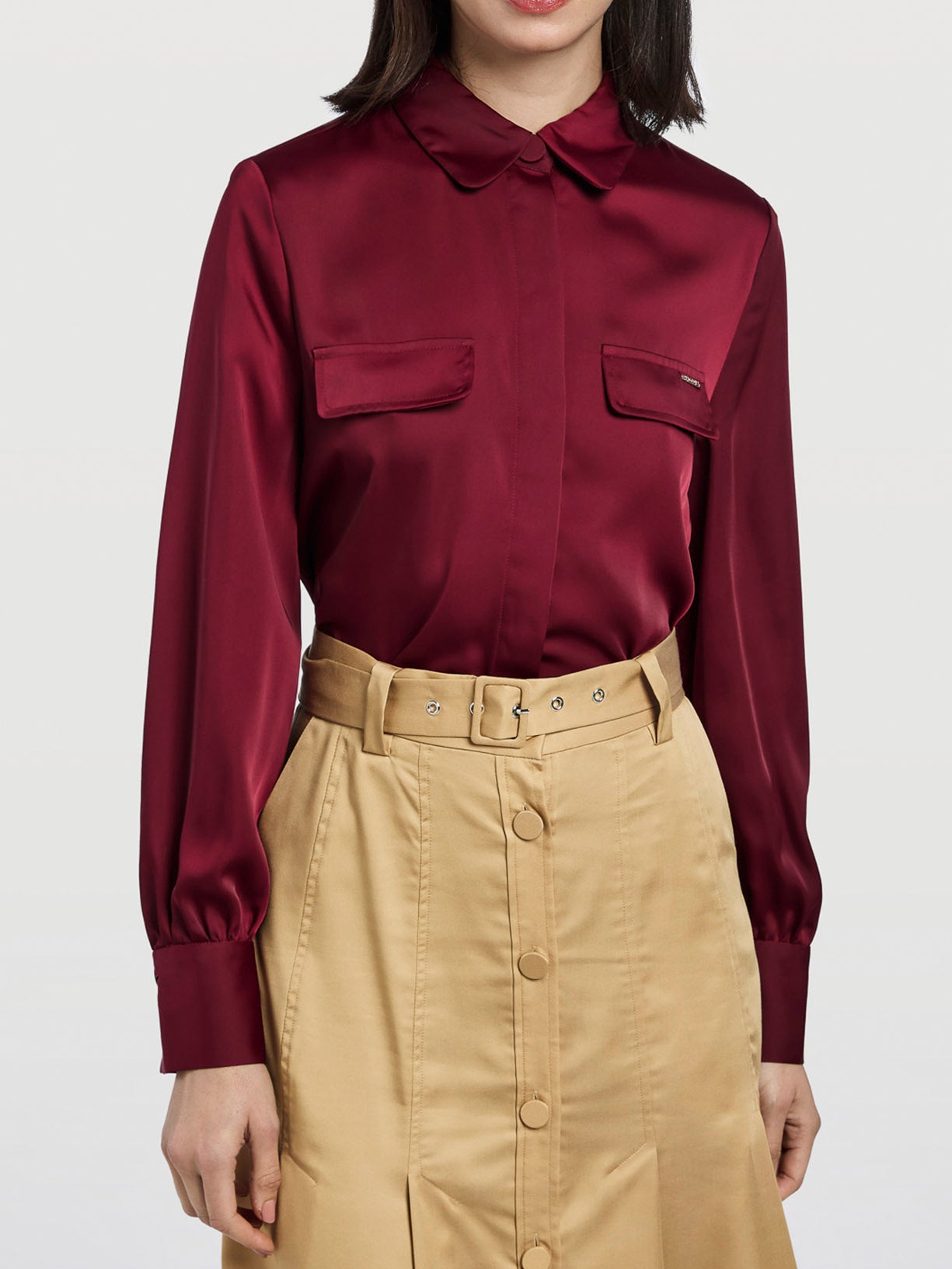 Round collar blouse with two big flap pockets at the front, hidden buttons front placket and long sleeves with frilled bottom and one-button cuffs.