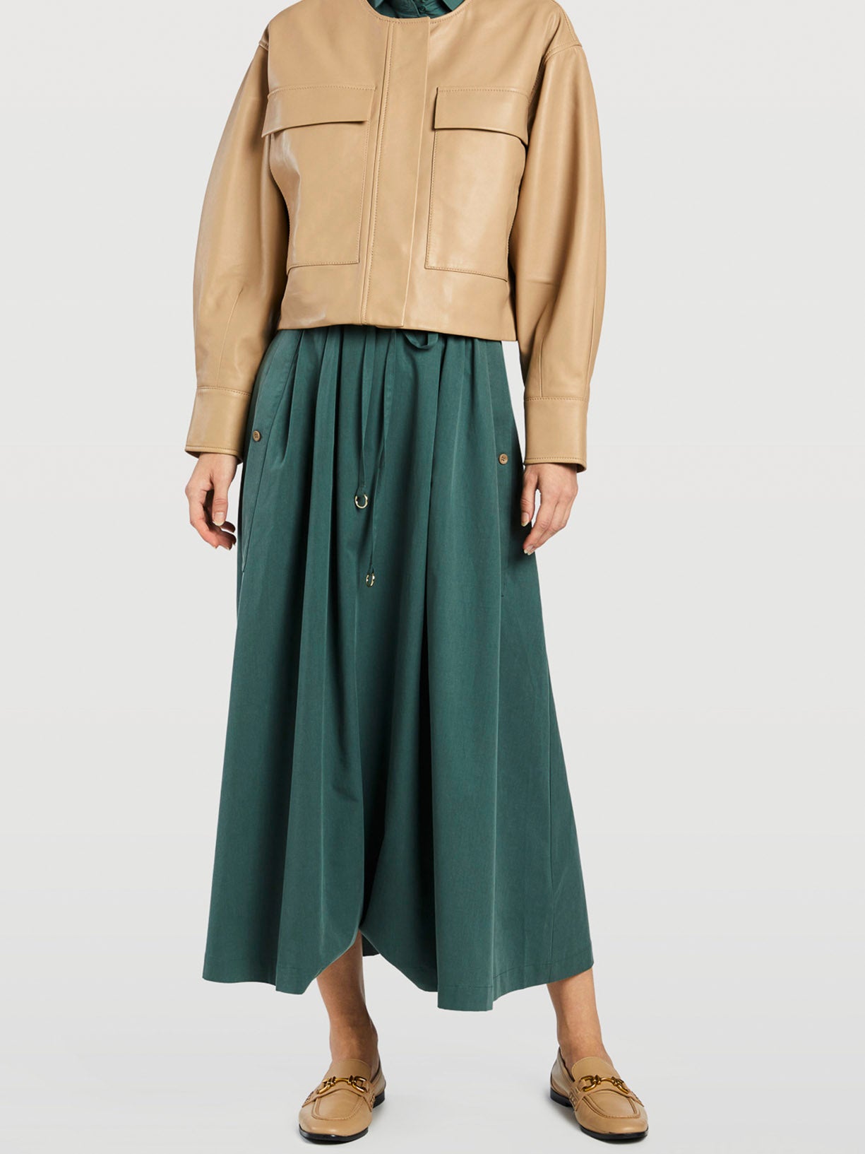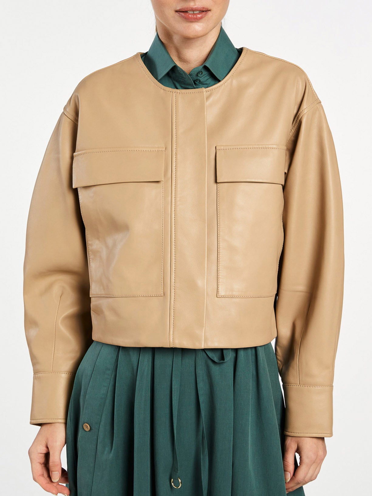 Short leather jacket with round neckline and a regular fit. Features big flat patch pockets with side entry. Front placket with hidden zipper and snap buttons. Dropped shoulders and long voluminous sleeves with self-leather cuffs.