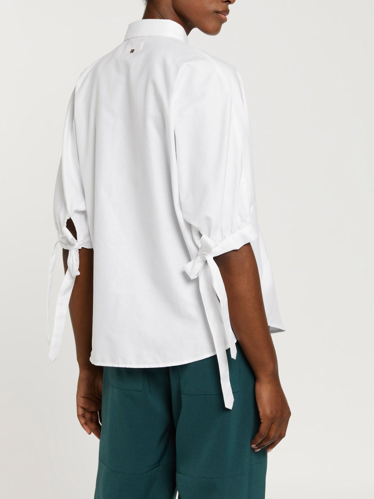 Casual shirt features a regular fit, buttoned down collar with half placket detail and short kimono sleeves with gathering effect at the bottom and a long tape fashioned as a bow on the cuffs. With brand metal plate at the back.