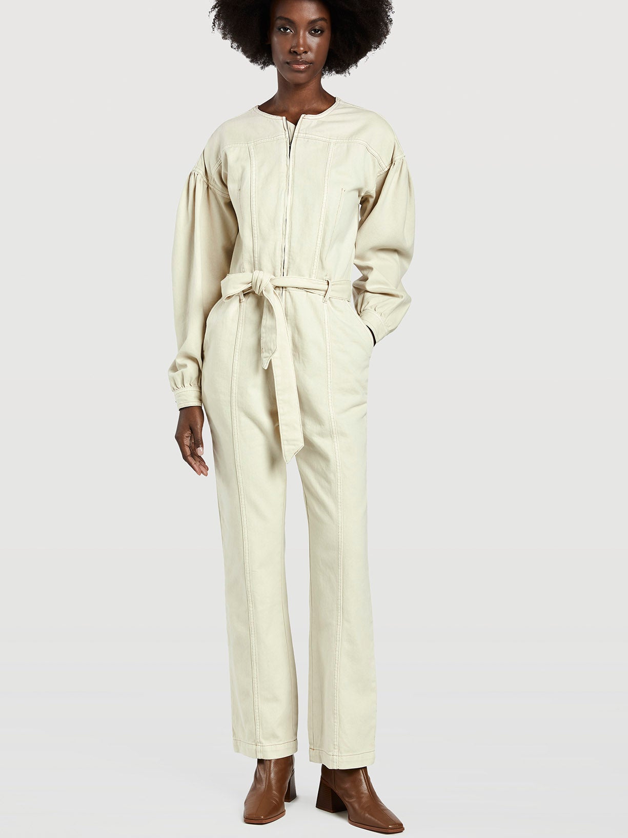 Regular fit jumpsuit with front metal zip fly. Features wide leg for more comfort, dropped shoulders and long balloon sleeves with one button cuffs. Side pockets and two back pockets. Self-fabric belt, belt loops and single stitch hem. Brand leather patch at back pocket.