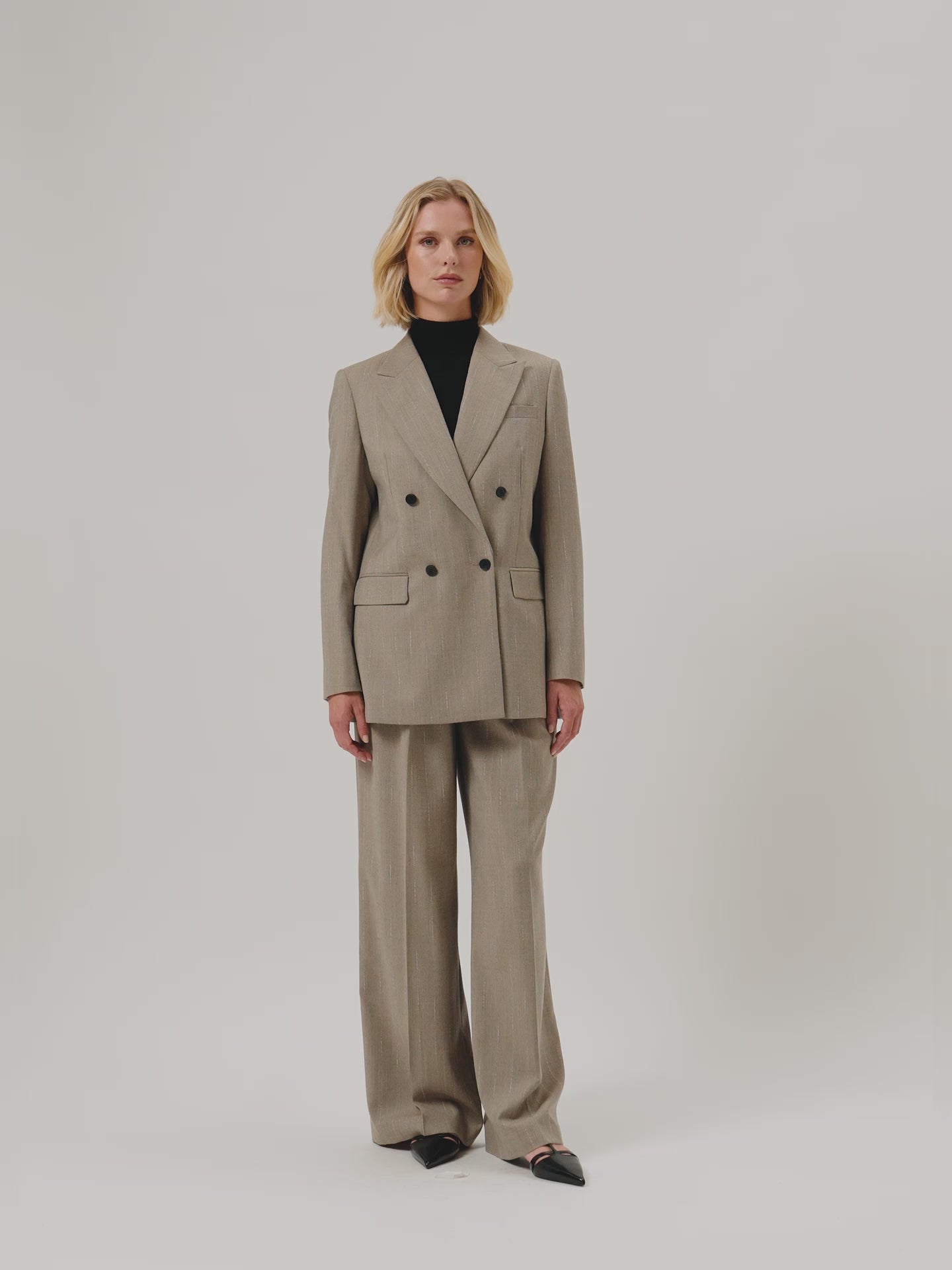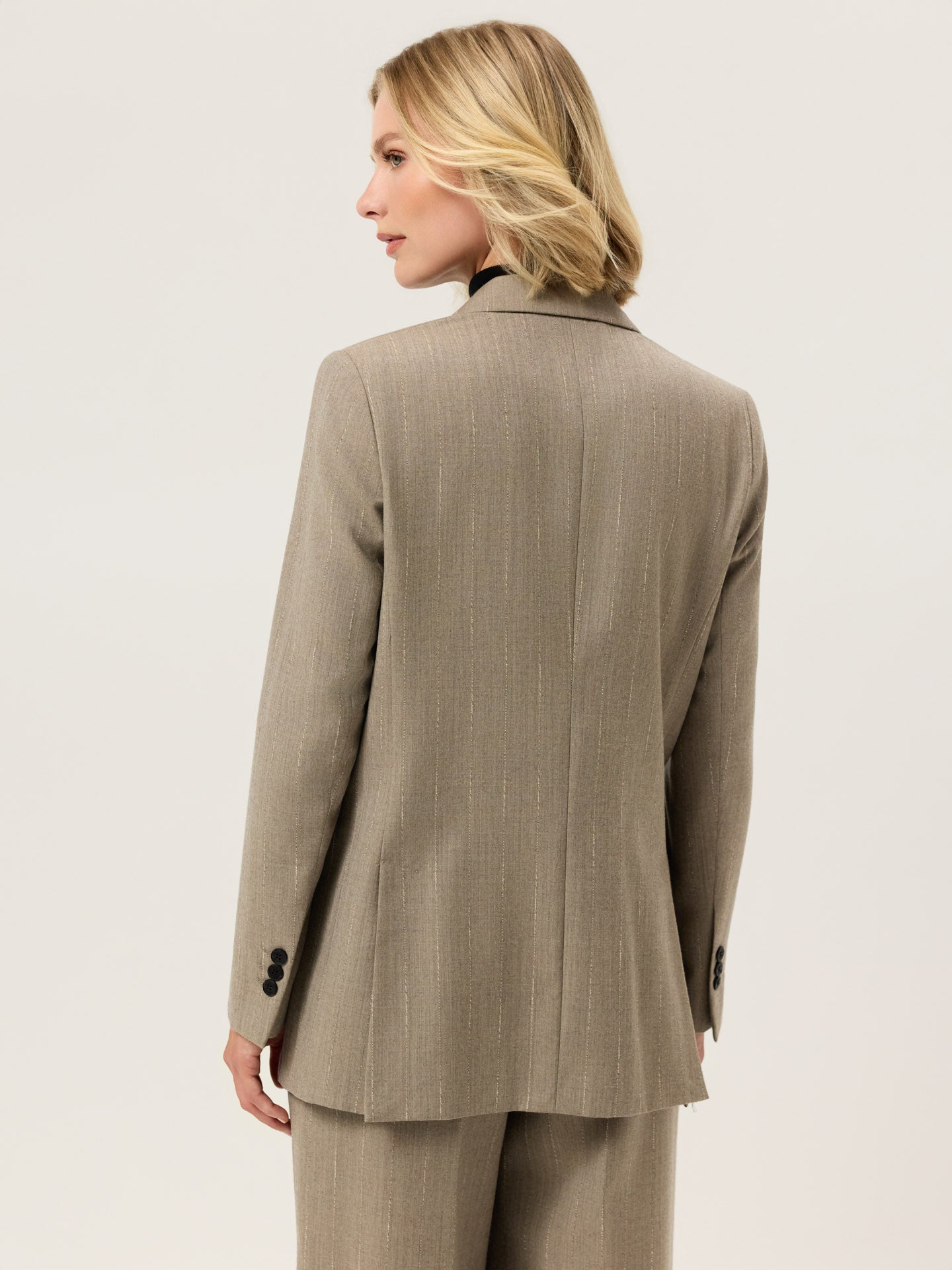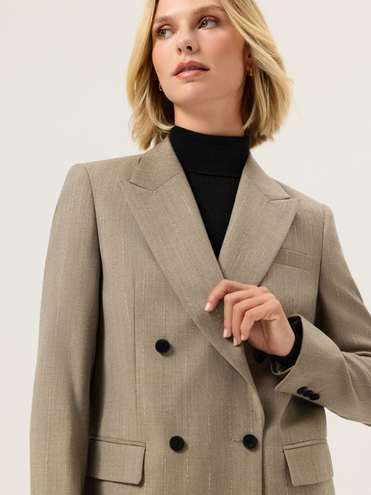 Double-breasted blazer with wider peak lapel, long sleeves with three button cuffs and two back slits. Expertly tailored from a Wool blend striped fabric. Designed with a relaxed fit, fully lined interior and two front flap pockets.