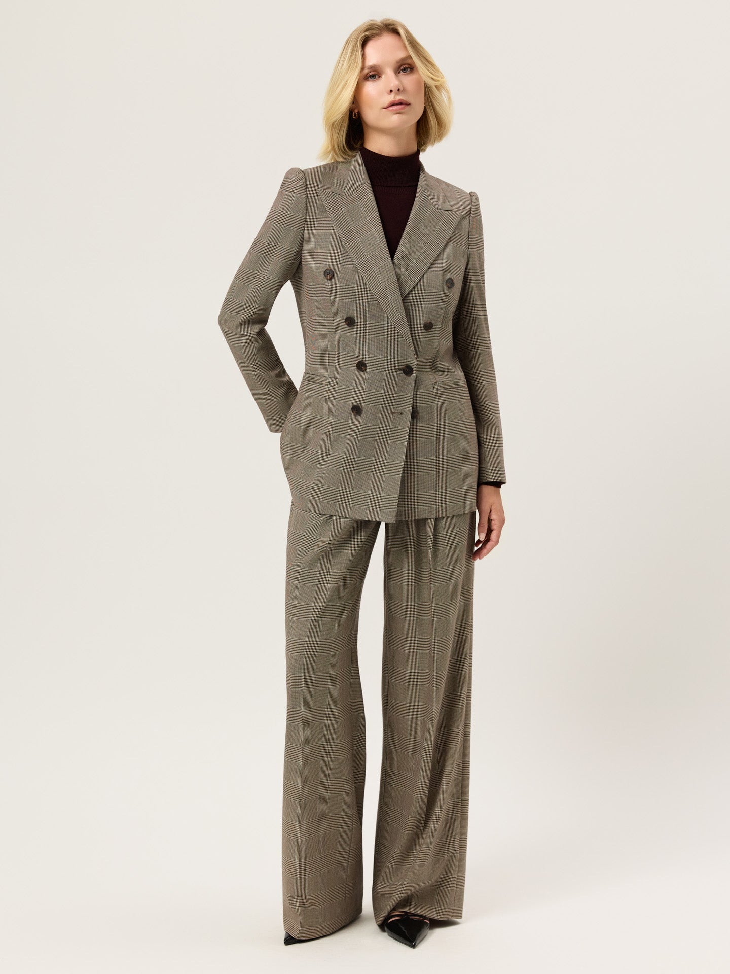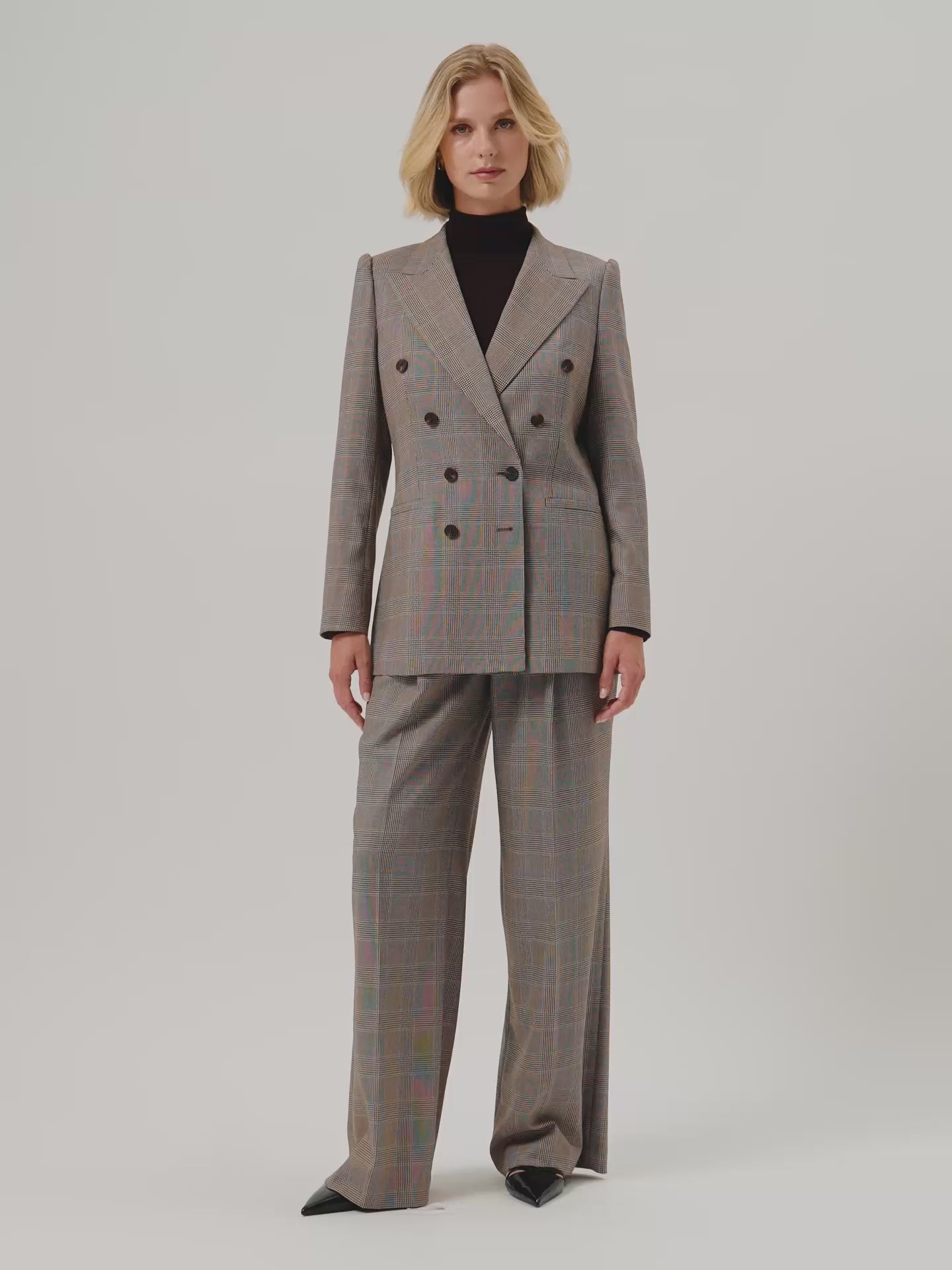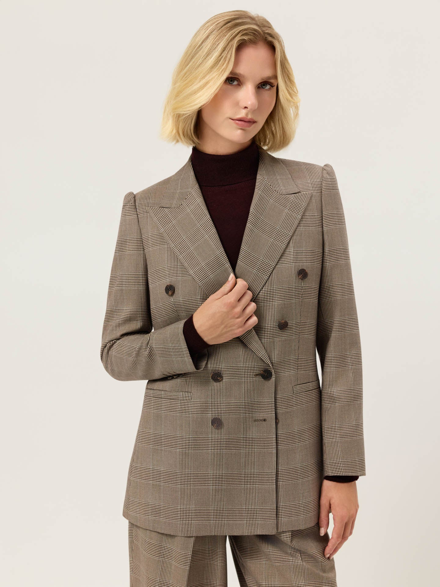 Double-breasted blazer with super wide peak lapel, long sleeves with three button cuffs and two back slits. Expertly tailored from a Viscose blend Checks fabric. Designed with a regular fit, fully lined interior and two front welt pockets. Special Details such as ruching on sleeves.