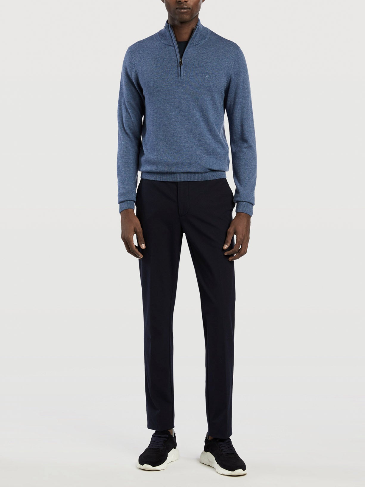 Bi stretch chino trousers . Featuring slim fit, zip fly and brand button elasticated waistband only at the sides with belt loops, two slash pockets at front and two back welt pockets. Brand's woven label at back pocket. Regular single-stitch hem.