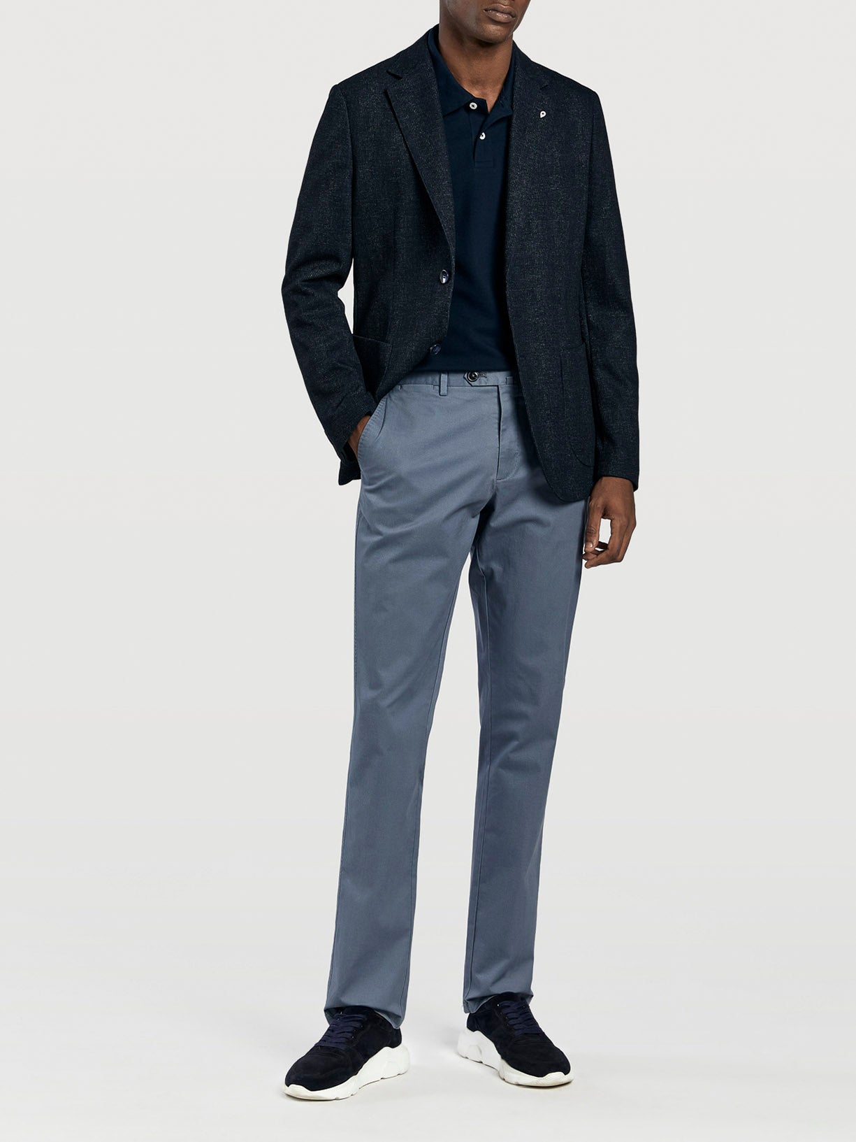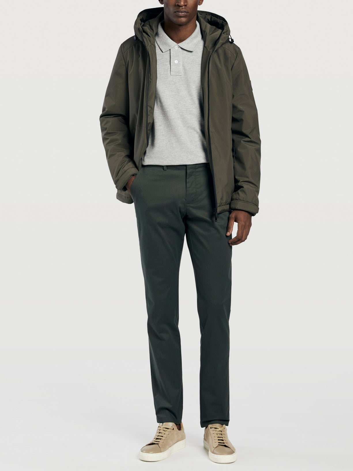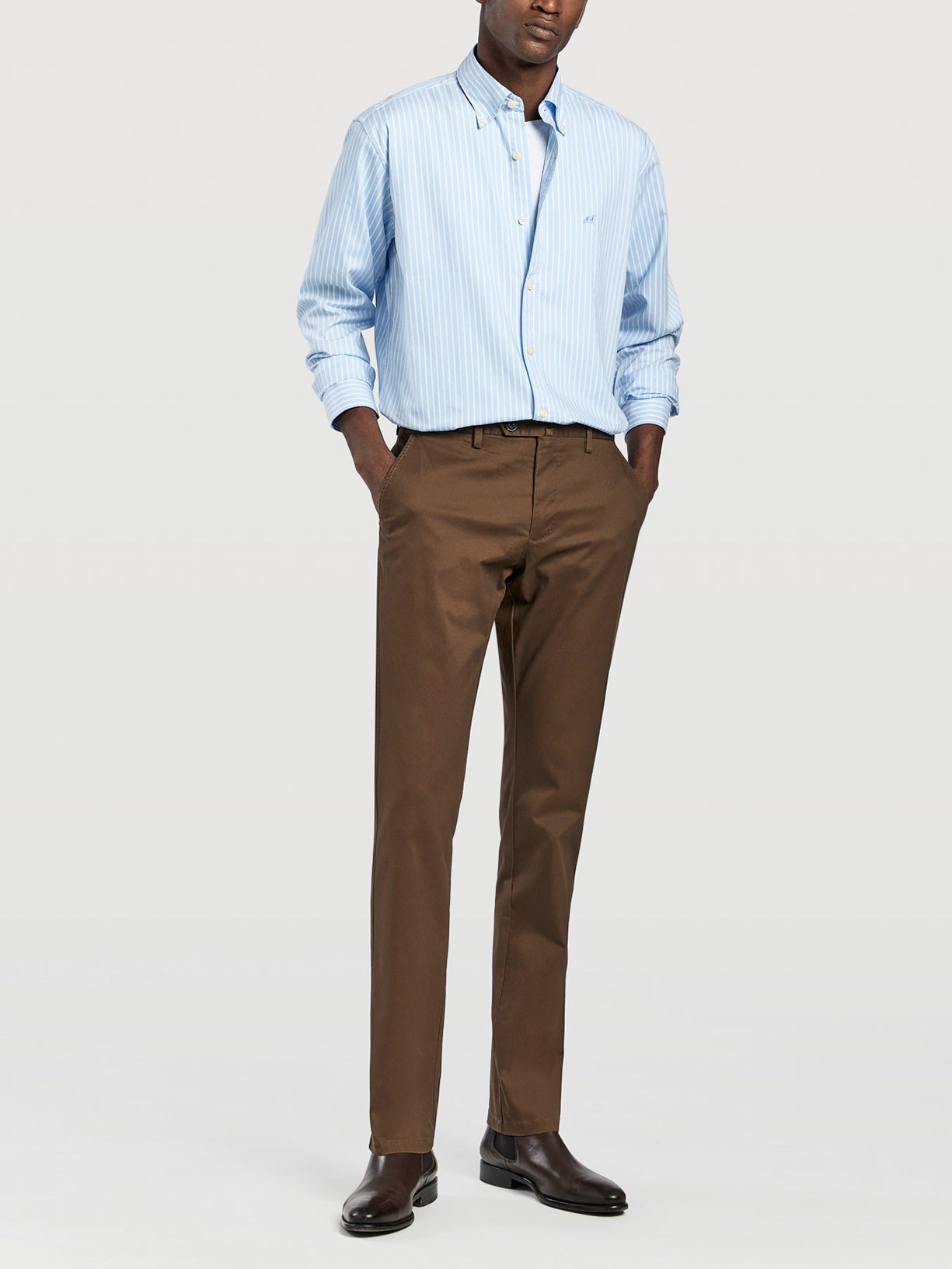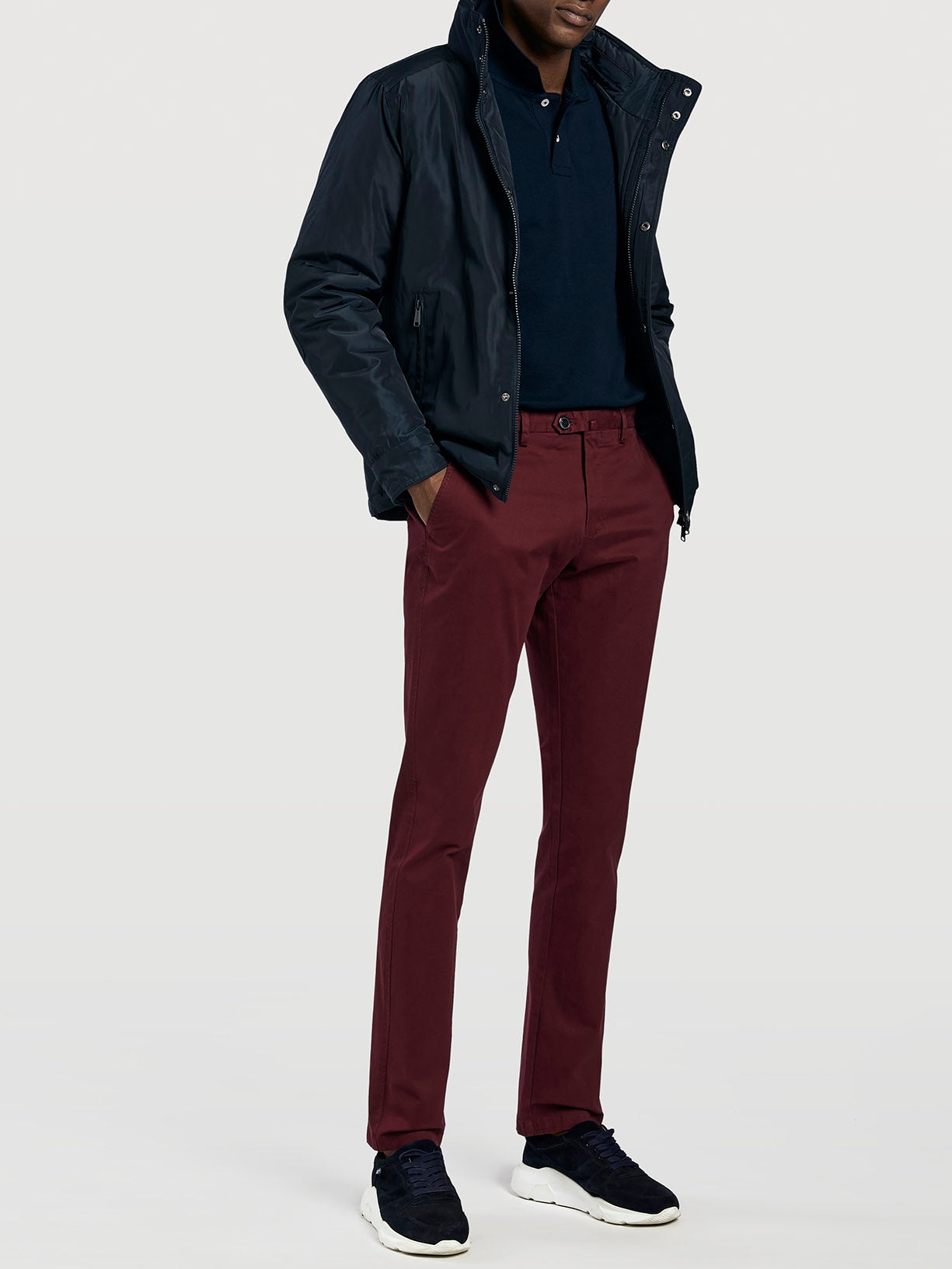 Garment dye slim fit chino trousers. Featuring brand button waistband fastening with belt loops, clock pocket and two slash pockets at front and two back welt pockets . V detail at back center. Brand's woven label at back pocket. Regular single-stitch hem.