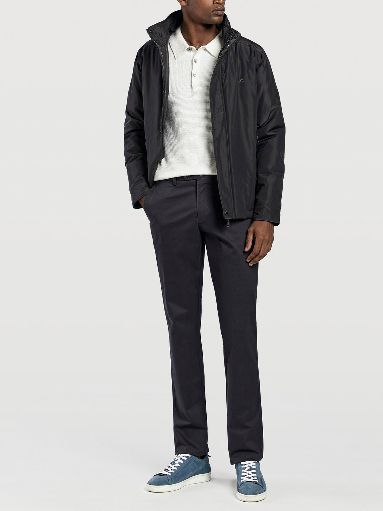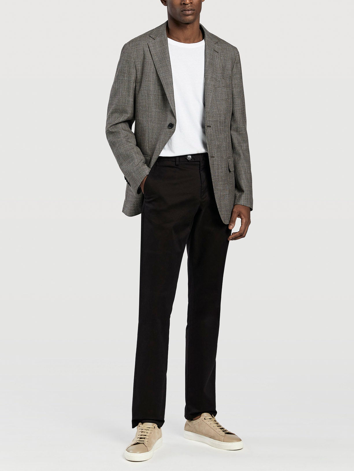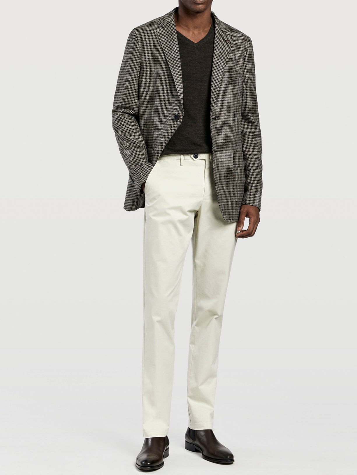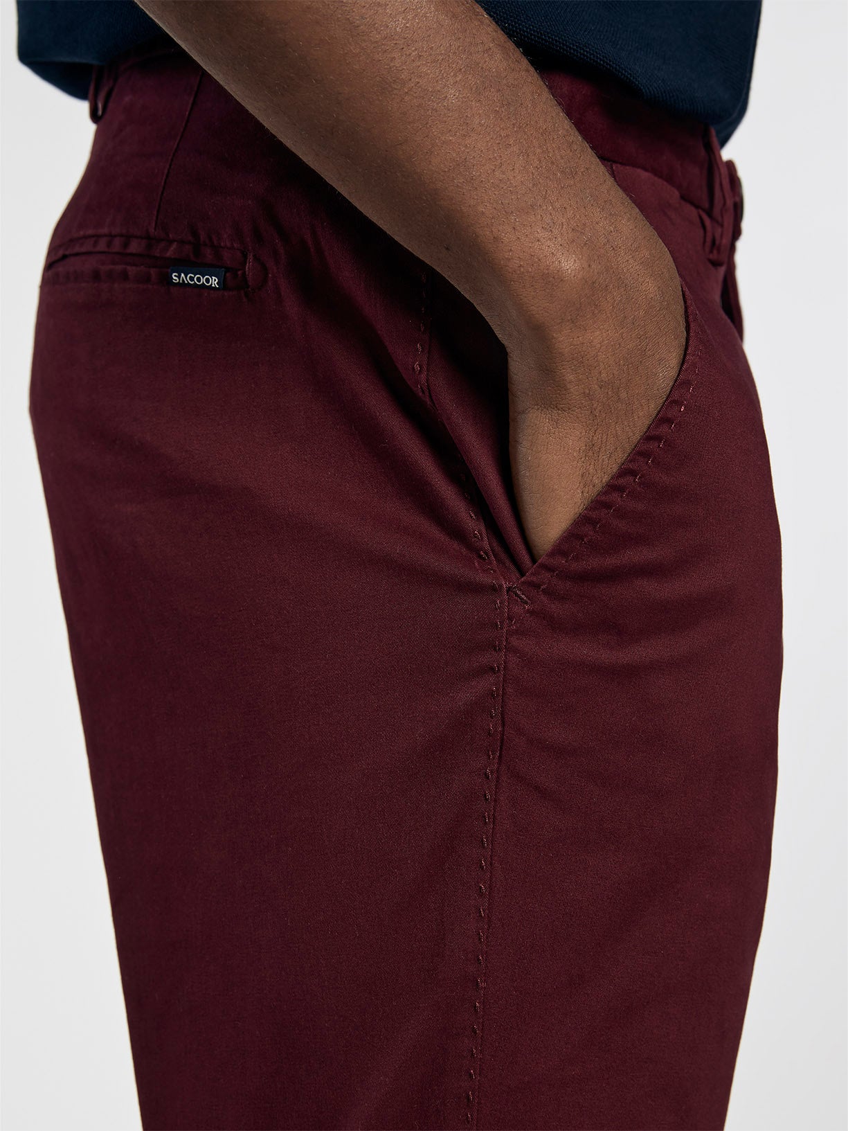 Garment dye slim fit chino trousers. Featuring brand button waistband fastening with belt loops, clock pocket and two slash pockets at front and two back welt pockets . V detail at back center. Brand's woven label at back pocket. Regular single-stitch hem.