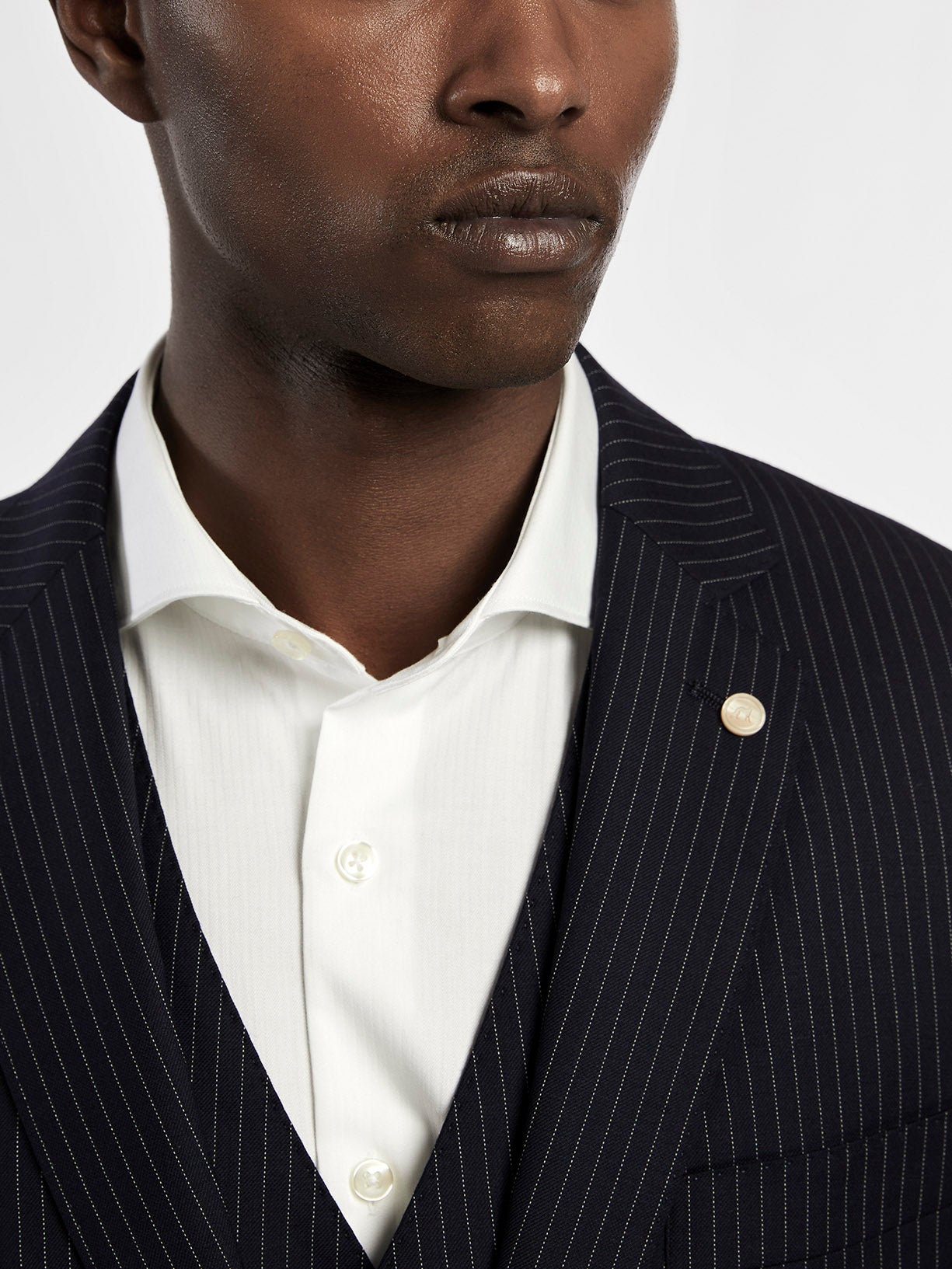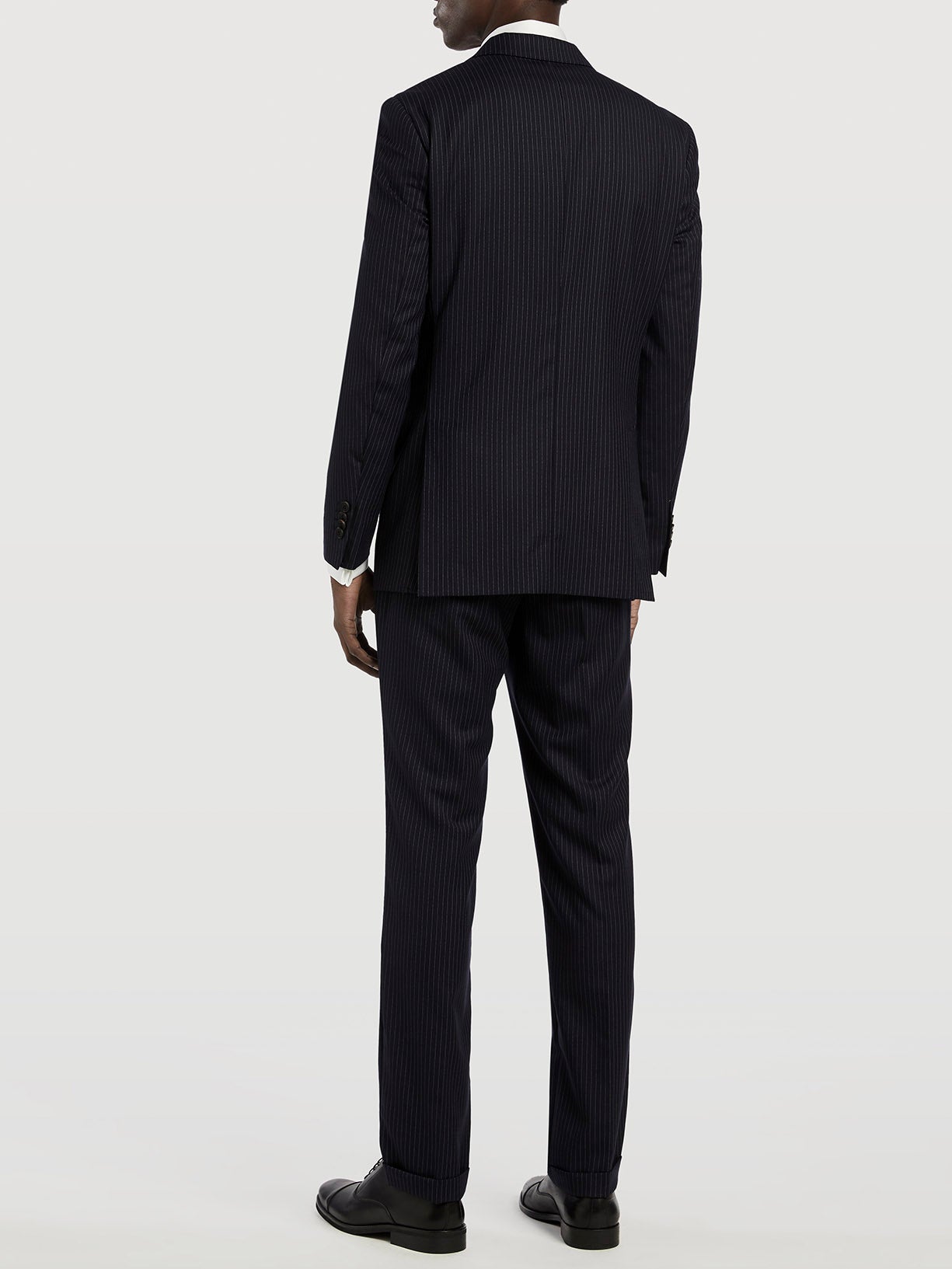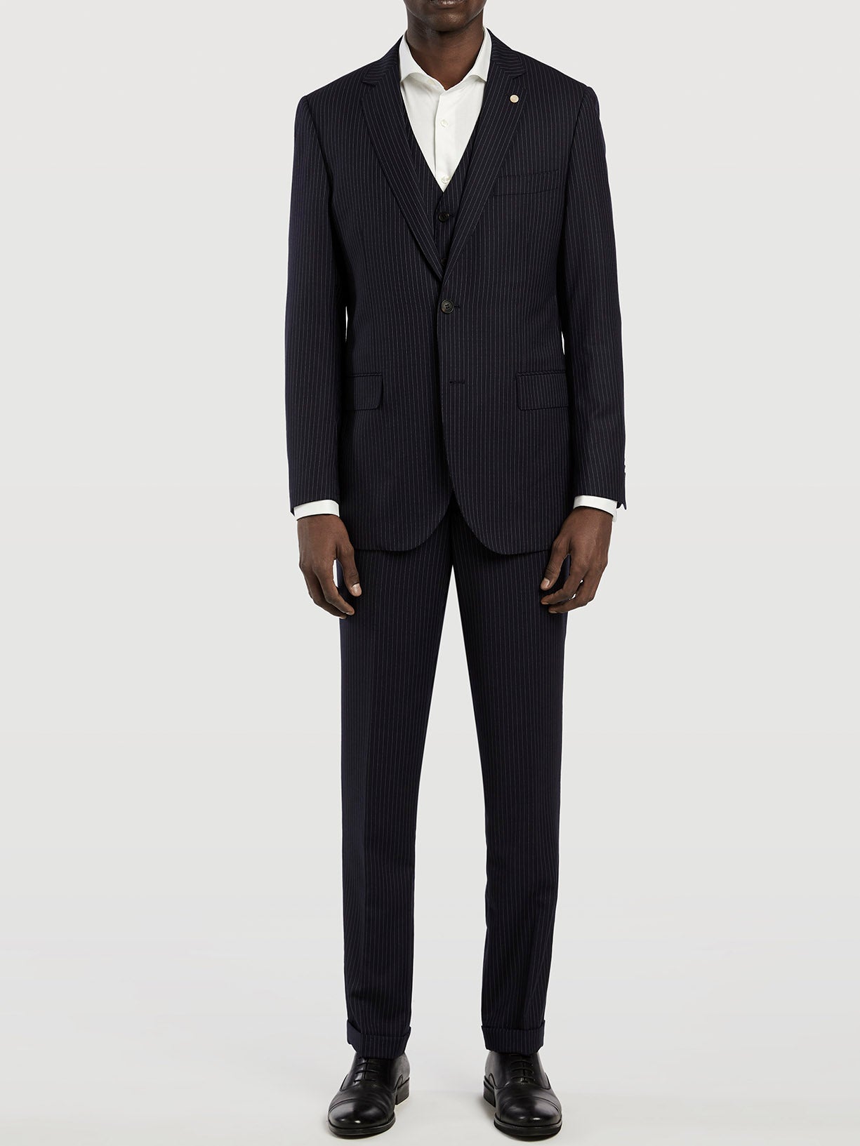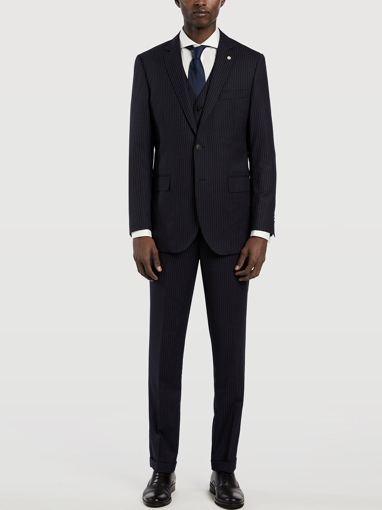 Pinstripe 3 pieces suit expertly tailored from 100% wool. This slim fit three-piece suit creates a relaxed silhouette that is ideal for all profiles. Two-button blazer with notch lapels and patch pockets, four-button cuffed, two back slits, it's fully lined for comfort and a more casual fit and with special inside pockets with zip. Five-button lined waistcoat with pockets and back buckle. Trousers with zip fly and button extended waistband fastening, two side pockets with coin pocket, two back welt pockets and belt loops. All suits have regular fitting measures from sizes 56 to 62. This suit is ideal for office wear and for those situations when looking impeccable is essential. Suits for every occasion. Once you’ve tried them, you’ll never want to take them off.