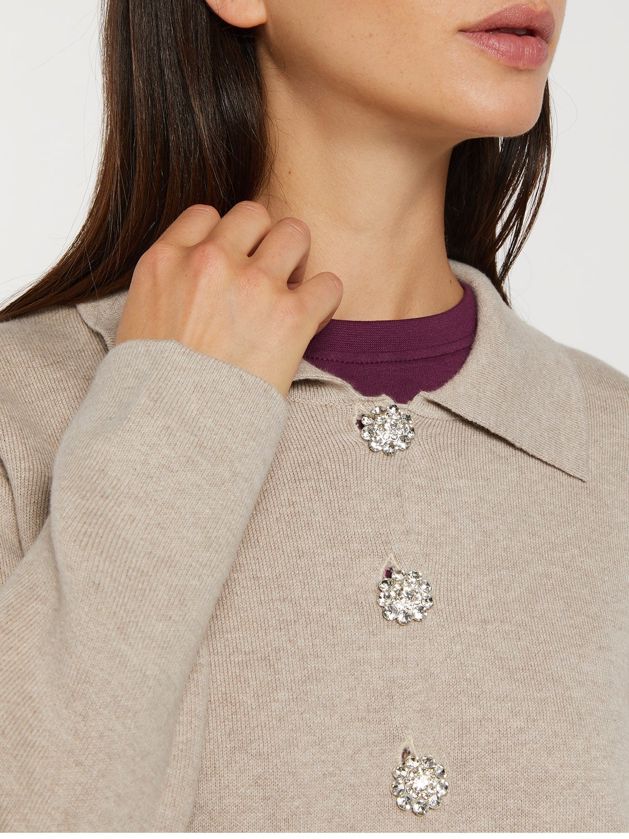 Structured regular fit knitwear jacket. Features a square shape, long sleeves with dropped shoulders, and patch pockets at the front. Buttoned down collar with fancy crystal buttons for more sophisticated look.