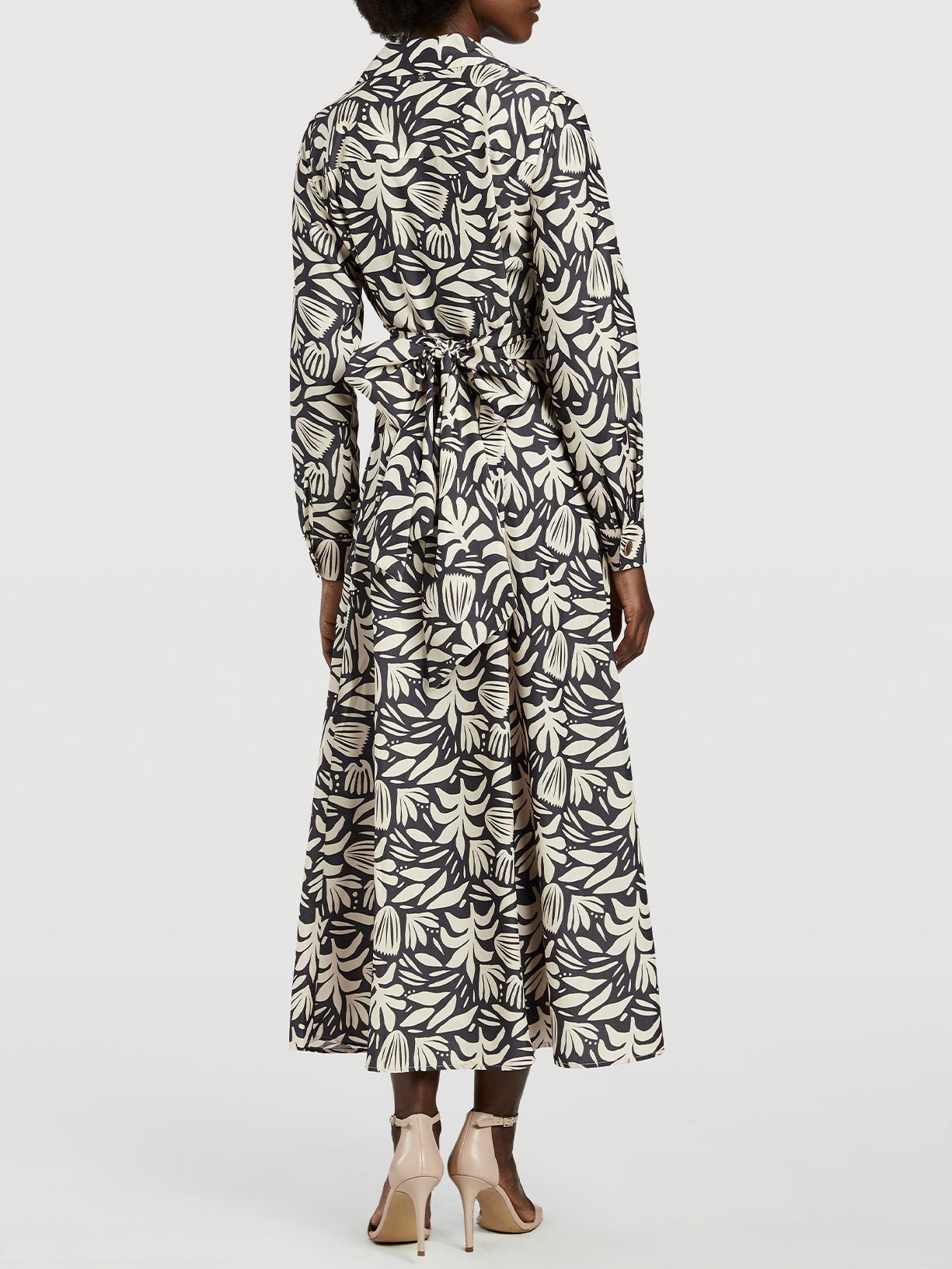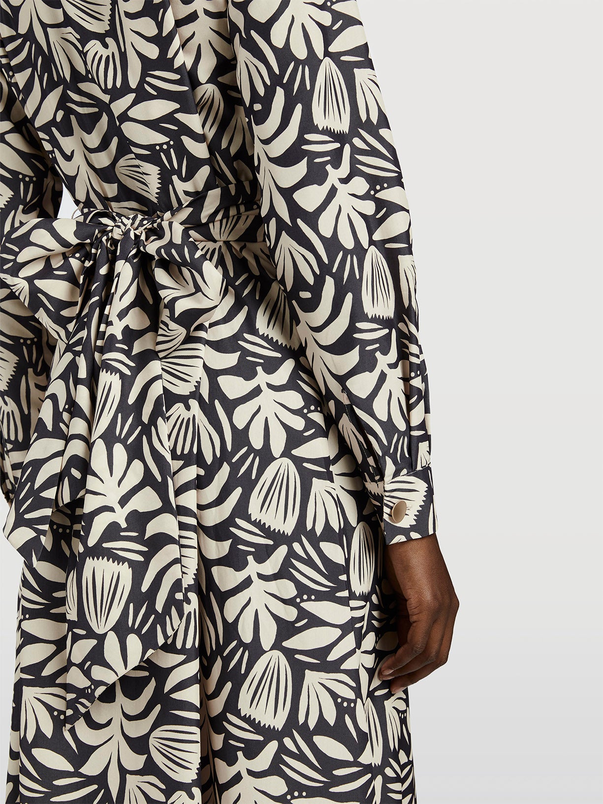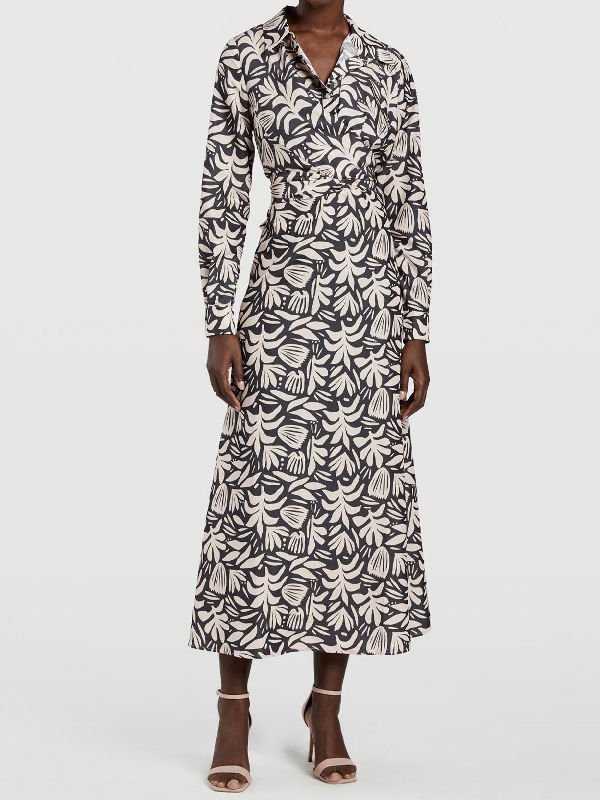 Midi dress with all-over print. Features wraparound detail and a small placket at front. Long sleeves with one button cuffs and side slits. Brand metal plate at the back.