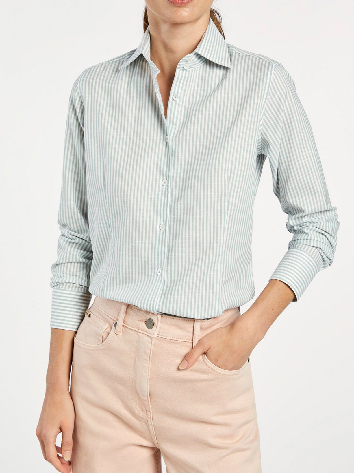 Classic striped shirt made of high-quality fabric. This slim fit shirt features two buttons at the collar, collar stays, long sleeves and personalized side gussets. With brand metal plate at the back.