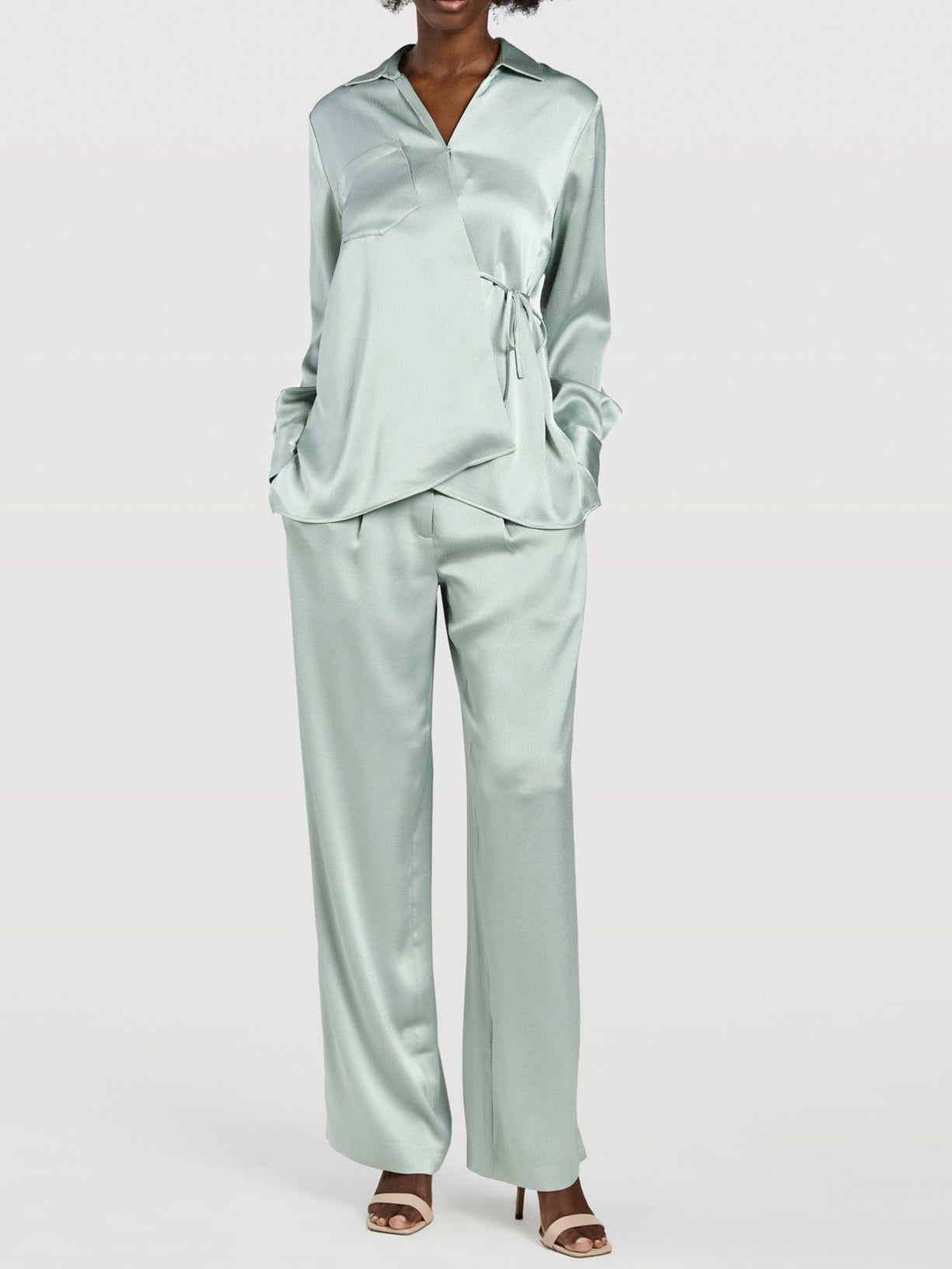 Asymmetric wrap-style blouse. Features a regular fit with an asymmetrical front cut, closure through inside snap button and self-fabric strip, an inclined patch pocket on the front and long sleeves with two self-fabric buttons cuffs. Brand metal plate at the back.