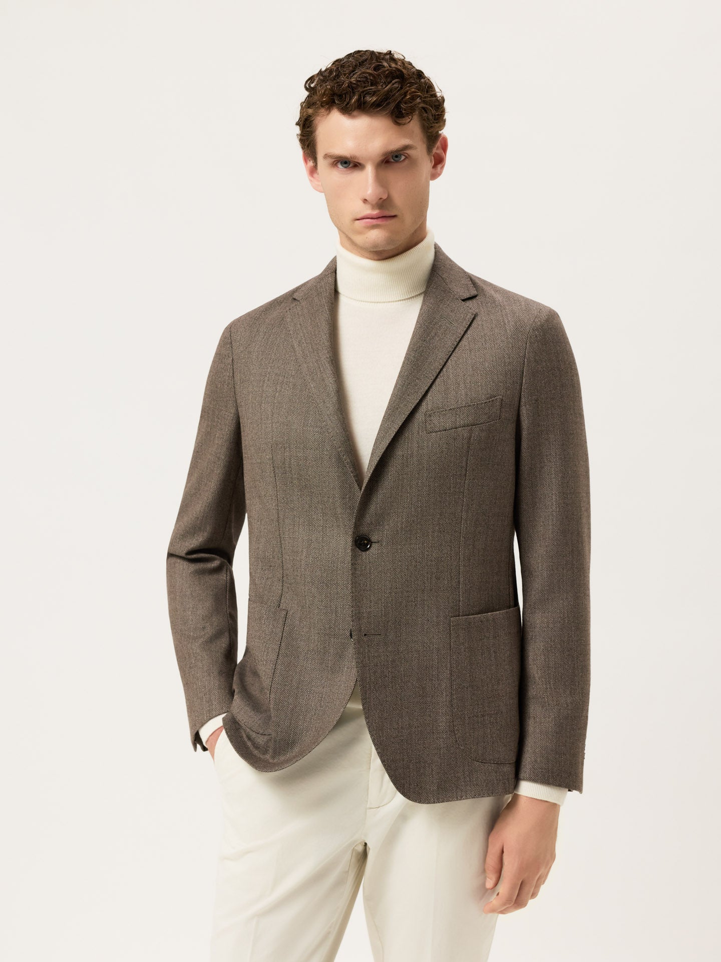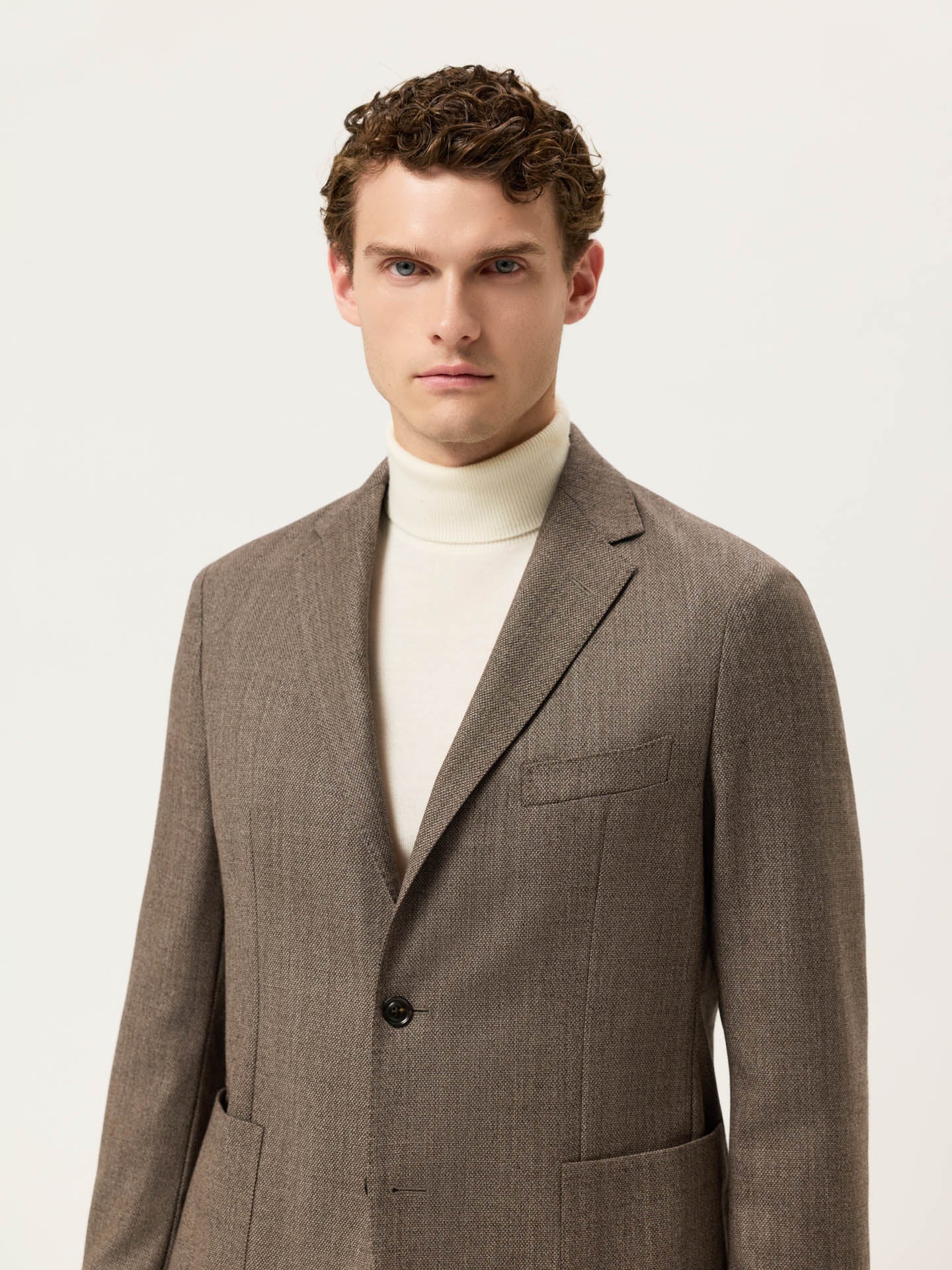 This slim-fit blazer is tailored from a premium Italian knit fabric, composed of wool and elastane for natural stretch and softness. Crafted in Portugal, with unlined construction that offers maximum comfort and lightness, while sartorial details like patch pockets with AMF stitching, a curved chest pocket, and four overlapping buttons elevate its casual elegance. Notched lapels, hand-finished stitching, and a self-fabric undercollar add to the refined craftsmanship. Finished with engraved buttons and a discreet Sacoor travel pin, this is a modern essential for smart layering.