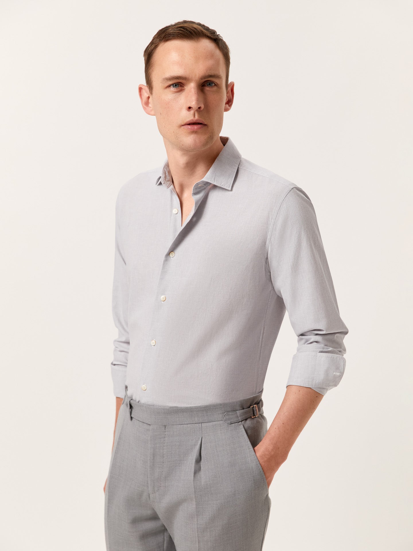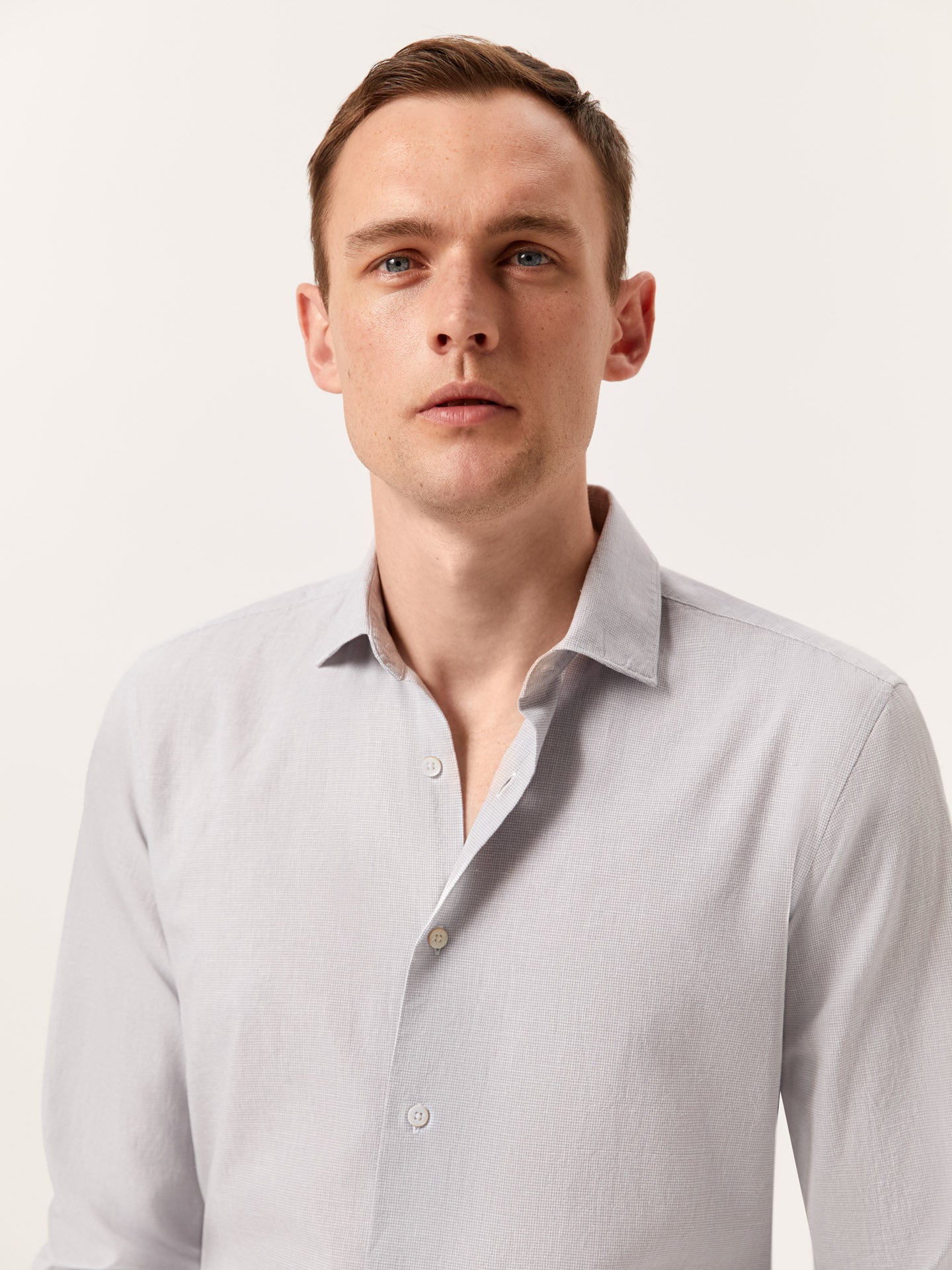 Slim Fit Houndstooth Cotton Linen Shirt with Open Collar