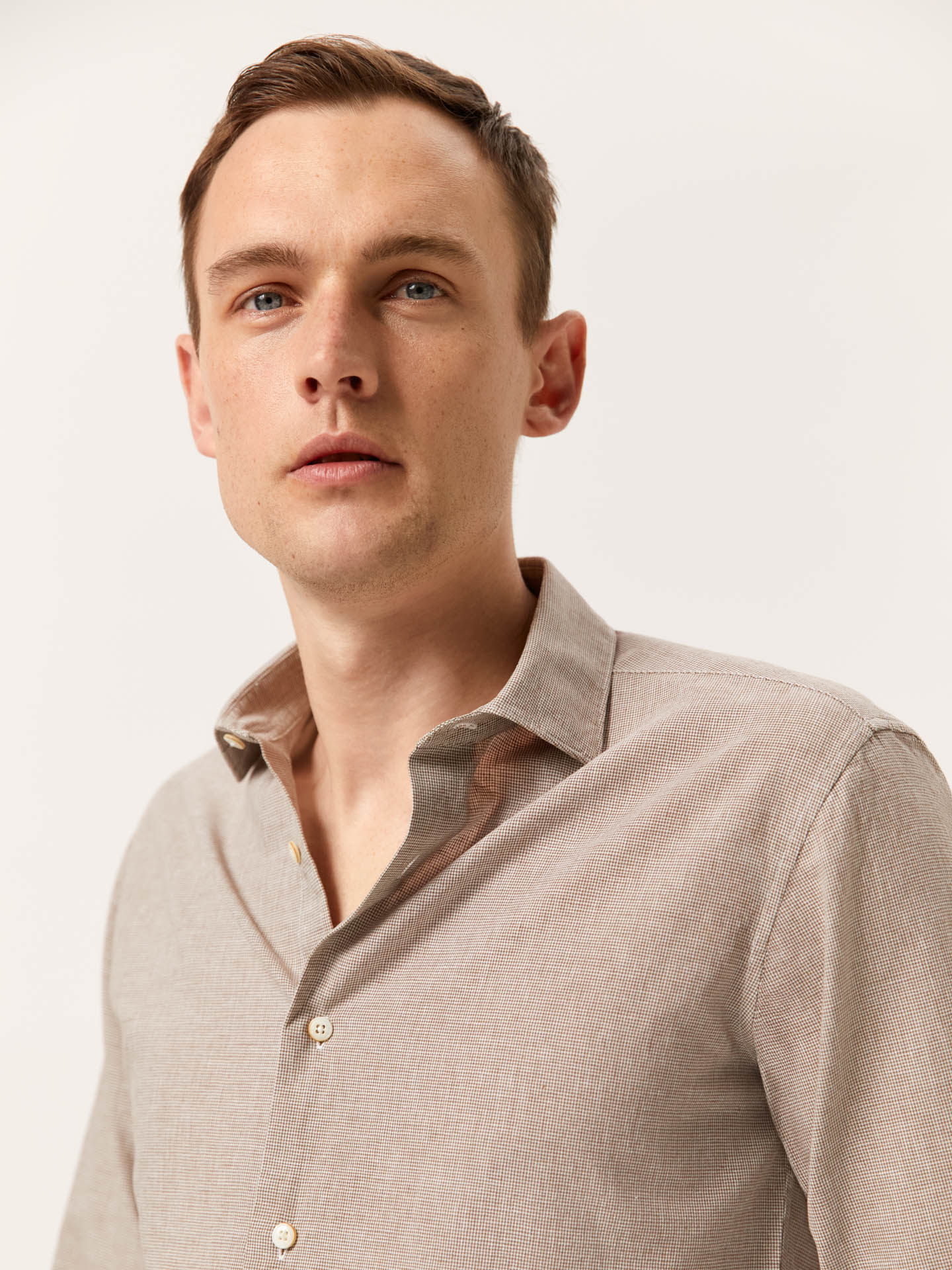 Slim Fit Houndstooth Cotton Linen Shirt with Open Collar